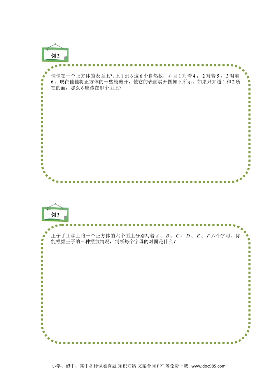 几何图形的认知小学、初中、高中各种试卷真题知识归纳文案合同PPT等免费下载www.doc985.com小新拿了一块正方体的豆腐,请问:这块豆腐有_____个顶点,_____条棱,______个面;⑴如果小新将其中的1个角砍去,_____个顶点,_____条棱,______个面;⑵如果小新将全部的8个角砍去,_____个顶点,_____条棱,______个面。例1小学、初中、高中各种试卷真题知识归纳文案合同PPT等免费下载www.doc985.com佳佳在一个正方体的表面上写上1到6这6个自然数,并且1对着4,2对着5,3对着6。现在佳佳将正方体的一些棱剪开,使它的表面展开图如下所示。如果只知道1和2所在的面,那么6应该在哪个面上?王子手工课上将一个正方体的六个面上分别写着A、B、C、D、E、F六个字母。你能根据王子的三种摆放情况,判断每个字母的对面是什么?例2例3小学、初中、高中各种试卷真题知识归纳文案合同PPT等免费下载www.doc985.com小新和王子玩游戏猜点数,他们拿了五个完全相同的骰子摆成一排,请问:现在五个骰子底面的点数之和是多少?小新和佳佳玩自制大富翁游戏,他们在第1个方格内放着一个正方体木块,木块6个面上分别写着ABCDEF六个字母。其中A与D相对,B与E相对,C与F相对。现在小新将木块标有字母A的那个面朝上,标有字母D的那个面朝下放在第1个方格内,然后让木块按照箭头指向,沿着图中方格滚动,当木块滚到21格时,木块向上的面上写的是哪个字母?例4例5小学、初中、高中各种试卷真题知识归纳文案合同PPT等免费下载www.doc985.com佳佳有一个棱长为3厘米的正方体,她将其6个面都涂满颜色,然后把它锯成棱长1厘米的小正方体。请问:在这些小正方体中:⑴3面涂上颜色的有___块;⑵只有2面涂上颜色的有____块;⑶只有1面涂上颜色的有____块;⑷没有涂上颜色的有____块。王子给小新一个小难题,一个由三个正方形组成的图形,能否分成大小、形状都相同的四个图形?趣味挑战例6小学、初中、高中各种试卷真题知识归纳文案合同PPT等免费下载www.doc985.com(小朋友们,今天的知识学完咯!别忘了,把你学会的知识跟爸爸妈妈说一说哦!)学而思网校三年级期中考试满分100分,考试时间:60分钟姓名:____________开始时间:____________结束时间:___________一、填空题(本题共有8个小题,每题5分,满分40分)1.已知数列2,4,6,8,,问这个数列中第个数是_______。2.十字数阵图:把数字l、2、3、4、5安排到下图中的方格中,使横行和竖行三个数相加的和等于10。3.在下式的两数中间添上四则运算符号,使等式成立:823=334.在五个4之间,添上适当的运算符号+、-、×、÷和(),使得下面的算式成立.44444=85.有甲乙丙三个班,已知甲班的人数比乙班的人数的2倍少20人,乙班比丙班少10人,三个班一共90人,那么甲班有________人,乙班有_______人。6.在算式中的适当位置添加小括号使等式成立,那么这个等式是______________________。7.青蛙爬井,白天爬3米,晚上滑1米。已知井深12米,请问,青蛙需要_______天爬出这口井。8.在下面算式的方框里各填入一个数字,使等式成立。那么所填的两个数字的和是_____。□6-59=2□。二、简答题(本题共有6个小题,每题10分,满分60分)1.2.图老师和班上的50名同学在中秋晚会上一起吃月饼。张老师吃了5块月饼,男生每人小学、初中、高中各种试卷真题知识归纳文案合同PPT等免费下载www.doc985.com吃4块,女生每人吃2块。最后一共吃了135块月饼。求有几名男生,有几名女生?3.计算(2+4+6+8+…+100)-(1+2+3+4+…+50)4.小松鼠采松果,晴天每天可以采10个,雨天每天只能采6个。它一连几天采了80个松果,平均每天采8个。那么其中有几天是雨天呢?5.把l至9这9个数,分别填在下图的9个○中,使得三角形每条边上的4个○内数之和都是23。6.鸡、兔同笼,鸡比兔多26只,脚数共274只,问鸡、兔各几只?小学、初中、高中各种试卷真题知识归纳文案合同PPT等免费下载www.doc985.com答案及解析一、填空题1.【答案】4000【分析】根据等差数列通项公式:an=a1+(n-1)×d,第2000个数为:2+(2000-1)×2=40002.【答案】【分析】略3.【答案】;【分析】略4.【答案】【...