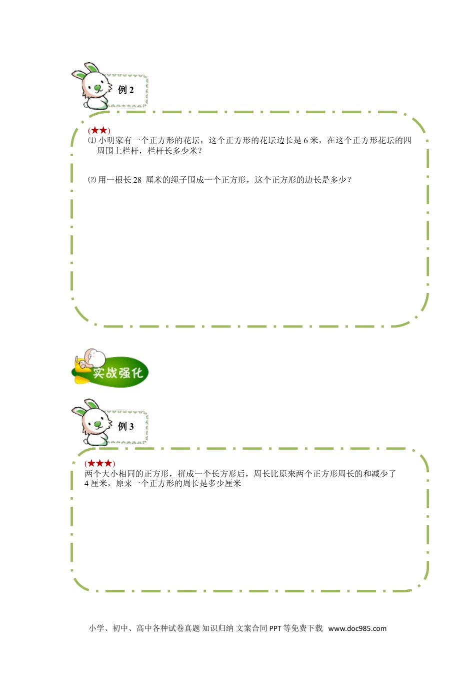 巧求周长小学、初中、高中各种试卷真题知识归纳文案合同PPT等免费下载www.doc985.com()★★⑴爱美的美羊羊去商场买回来一面镜子。她要沿镜子的四边做一个铁丝的边框,请你帮助算一算,大约需要多少米长的铁丝材料?⑵乐乐用一根长30分米的黑线,给自己的照片镶了一条黑边,这个长方形相框的宽是6分米,你知道这个相框的长是多少分米?例1小学、初中、高中各种试卷真题知识归纳文案合同PPT等免费下载www.doc985.com()★★⑴小明家有一个正方形的花坛,这个正方形的花坛边长是6米,在这个正方形花坛的四周围上栏杆,栏杆长多少米?⑵用一根长28厘米的绳子围成一个正方形,这个正方形的边长是多少?()★★★两个大小相同的正方形,拼成一个长方形后,周长比原来两个正方形周长的和减少了4厘米,原来一个正方形的周长是多少厘米例2例3小学、初中、高中各种试卷真题知识归纳文案合同PPT等免费下载www.doc985.com()★★★一个长方形的花坛被平均分成八个小正方形,已知每个小正方形的周长是15米,长方形花坛的周长是多少米()★★★你能求出下面图形的周长吗?例4例5小学、初中、高中各种试卷真题知识归纳文案合同PPT等免费下载www.doc985.com你能求出下面图形的周长吗?()★★★★求下列图形的周长。(单位:厘米)拓展例6小学、初中、高中各种试卷真题知识归纳文案合同PPT等免费下载www.doc985.com求下列图形的周长。(单位:厘米)()★★★★★下图是一个机器零件的侧面平面图,图中每一条最短线段长为5厘米,这个零件高30厘米,求这个零件侧面的周长是多少厘米例7拓展【本讲总结】一、周长的概念(平面)封闭图形一周的长度。二、规则图形长方形周长=(长+宽)×2正方形周长=边长×4三、不规则图形宗旨:不规则图形转化为规则图形类型:1.楼梯型2.陷阱型3.楼梯型+陷阱型。方法:1.套框2.平移小学、初中、高中各种试卷真题知识归纳文案合同PPT等免费下载www.doc985.com()★★★★★小明将5张扑克牌像图那样摆放,已知扑克牌的长是86毫米,宽56毫米,那么这个摆成后的图形的周长是多少?例8