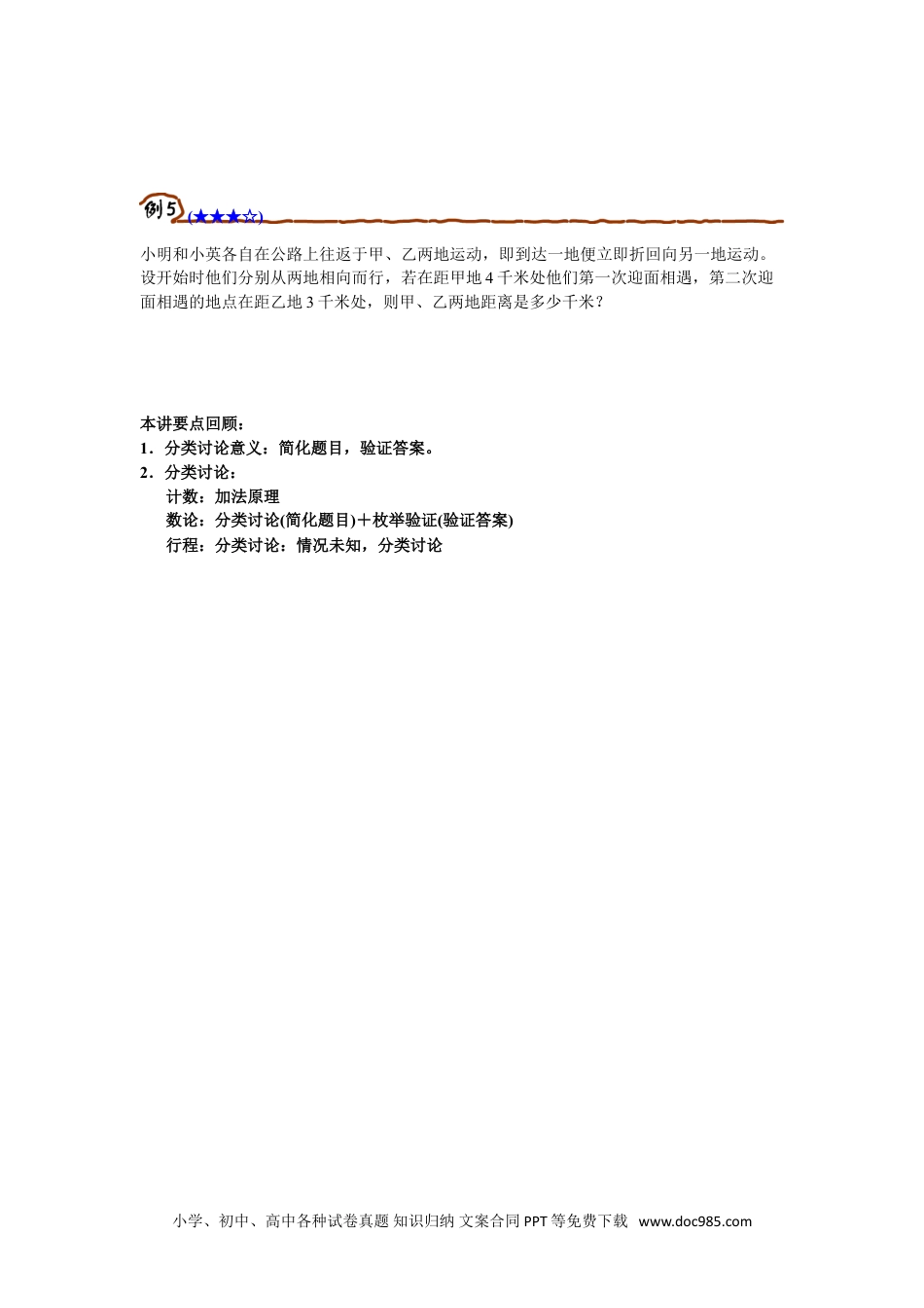本讲重点:分类讨论思想在计数的体现形式——加法原理分类讨论思想在数论的体现形式——分类讨论+枚举验证分类讨论思想在行程的体现形式——情况不明,分类讨论有红、黄、蓝三面旗,把这些旗挂在一个旗杆上做成各种信号,如果按照挂旗的面数及从上到下颜色的顺序区分信号,那么利用这三面旗能表示______种不同信号。(不算不挂旗情况)从1、2、3、4、5、6、7这7个数中选出3个数,请问:⑴要使这3个数的乘积能被3整除,一共有多少种不同的选法?⑵要使这3个数的和能被3整除,一共有多少种不同的选法?一个四位数加上自己的各位数字之和得2011,这样的四位数总共有多少个?分别是多少?a、b、c、d各代表一个不同的非零数字,如果为13的倍数,为11的倍数,为9的倍数,为7的倍数,那么是______。小学、初中、高中各种试卷真题知识归纳文案合同PPT等免费下载www.doc985.com四大思想————数学(分在用、行程中的类讨论应问题应用)(★★☆)(★★★☆)(★★★☆)(★★★☆)小明和小英各自在公路上往返于甲、乙两地运动,即到达一地便立即折回向另一地运动。设开始时他们分别从两地相向而行,若在距甲地4千米处他们第一次迎面相遇,第二次迎面相遇的地点在距乙地3千米处,则甲、乙两地距离是多少千米?本讲要点回顾:1.分类讨论意义:简化题目,验证答案。2.分类讨论:计数:加法原理数论:分类讨论(简化题目)+枚举验证(验证答案)行程:分类讨论:情况未知,分类讨论小学、初中、高中各种试卷真题知识归纳文案合同PPT等免费下载www.doc985.com(★★★☆)
