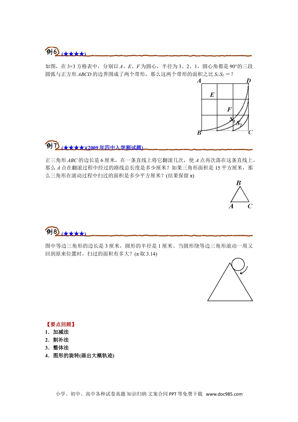 【内容提要】1.基本图形:圆形、扇形2.组合图形:方包圆、圆包方、三角包圆、圆包三角、图形的旋转3.解题方法:加减法、整体法、割补法、比例法、方程法加减法把要求的图形转化为几个规则图形相加或者相减的形式整体法把某些数量关系看成一个整体,进行有目的的、有意识的整体处理割补法把要求的图形通过切割再拼补成规则图形比例法把要求的图形分成几个部分,通过寻找各个部分之间的比例关系求解方程法根据面积的比例关系列方程解题如右图,两个正方形边长分别是10和6,求阴影部分的面积。(π取3)如图,ABCD是正方形。阴影部分的面积为_______。(π取3.14)小学、初中、高中各种试卷真题知识归纳文案合同PPT等免费下载www.doc985.com小升初曲形面解思路梳理——线积问题题(曲形面常用解思路)线积问题结论与题(★★)(★★★)(2008年第六届“走进美妙的数学花园”六年级初赛)如图,大圆半径为小圆的直径,已知图中阴影部分面积为S1,空白部分面积为S2,那么这两个部分的面积之比是多少?(圆周率取3.14)如图,矩形ABCD中,AB=6厘米,BC=4厘米,扇形ABE半径AE=6厘米,扇形CBF的半径CB=4厘米,求阴影部分的面积。(π取3)⑴如下图①,在以AB为直径的半圆上取一点,分别以AC和BC为直径在△ABC外作半圆AEC和BFC。已知AC的长度为4,BC的长度为3,AB的长度为5。试求阴影部分的面积。⑵如图②,阴影正方形的顶点分别是大正方形EFGH各边的中点,分别以大正方形各边的一半为直径向外做半圆,再分别以阴影正方形的各边为直径向外作半圆,再分别以阴影正方形的各边为直径向外作半圆,形成8个“月牙形”。这8个“月牙形”的总面积为32平方厘米,问大正方形EFGH的面积是多少平方厘米?小学、初中、高中各种试卷真题知识归纳文案合同PPT等免费下载www.doc985.com(★★★)(★★★)(★★★★)(2008年北大附中“资优博雅杯”数学竞赛)如图,在3×3方格表中,分别以A、E、F为圆心,半径为3、2、1,圆心角都是90°的三段圆弧与正方形ABCD的边界围成了两个带形,那么这两个带形的面积之比S1∶S2=?正三角形ABC的边长是6厘米,在一条直线上将它翻滚几次,使A点再次落在这条直线上,那么A点在翻滚过程中经过的路线总长度是多少厘米?如果三角形面积是15平方厘米,那么三角形在滚动过程中扫过的面积是多少平方厘米?(结果保留π)图中等边三角形的边长是3厘米,圆形的半径是1厘米。当圆形绕等边三角形滚动一周又回到原来位置时,扫过的面积有多大?(π取3.14)【要点回顾】1.加减法2.割补法3.整体法4.图形的旋转(画出大概轨迹)小学、初中、高中各种试卷真题知识归纳文案合同PPT等免费下载www.doc985.com(★★★★)(★★★★)(2009年四中入学测试题)(★★★★)