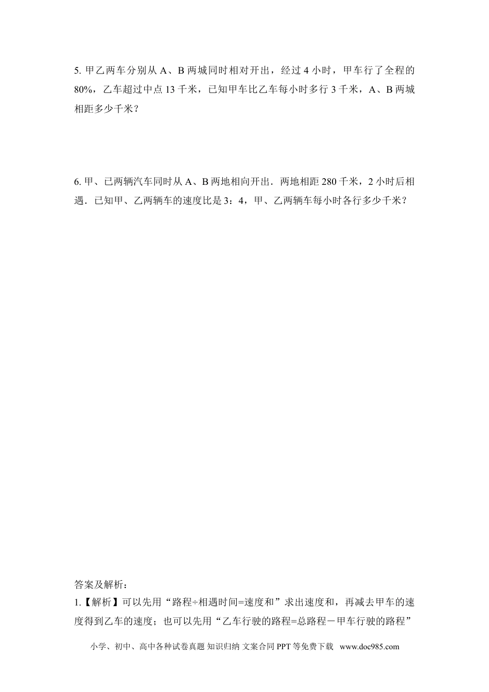 第五讲行程问题【基础概念】:行程问题是反映物体匀速运动的应用题,有"相向运动"(相遇问题)、"同向运动"(追及问题)和"相背运动"(相离问题)三种情况。但它们反映出来的数量关系是相同的,都可以归纳为:速度×时间=路程。【典型例题1】:甲、乙两车同时从相距960千米的两地相对而行,甲车每小时行90千米,途中因汽车故障甲车停了1小时,5小时后两车相遇。乙车每小时行多少千米?【思路分析】:途中因汽车故障甲车停了1小时,5小时后两车相遇,则甲车实际行了5-1=4小时,行驶的路程为:90×4=360千米.已知全程为960千米,根据路程÷时间=速度可知乙的速度为:(960-360)÷5.综合算式为:[960-90×(5-1)]÷5。解答::[960-90×(5-1)]÷5=[960-360]÷5=600÷5=120(千米);答:乙车每小时行120千米.【方法总结】:解决此类问题首先要弄清楚数量关系:乙车行驶的路程=两地的距离-甲车行驶的路程;还要明白由于故障,甲车停了1小时,实际上甲车少行驶了1小时,也就是说两车行驶的时间是不相等的,这是解决问题的关键;可以先根据“路程=速度×时间”计算出甲车行驶的路程,再根据“乙车行驶的路程=两地的距离-甲车行驶的路程”计算出乙车行驶的路程,最后利用“速度=路程÷实际”就可以计算出乙车的速度。【巩固练习】1.甲、乙两车同时从两地相对开出,两地相距480千米,5小时后相遇.甲车每小时行45千米,乙车每小时行多少千米?2.甲乙两车同时从AB两地相对开出,甲车每小时行42千米,乙车每小时行50千米,途中甲车因故障停驶48分钟,乙车开出5.3小时后两车在途中相遇.甲小学、初中、高中各种试卷真题知识归纳文案合同PPT等免费下载www.doc985.com乙两地相距多少千米?3.甲、乙两列火车从相距1070千米的两地同时相对开出,甲车每小时行90千米,5小时后两车还要共行160千米才能相遇.乙车每小时行多少千米?【典型例题2】:甲、乙两车分别从A、B两地同时开出,相向而行,经过6小时,甲车行了全程的75%,乙车超过中点16千米。已知甲车比乙车每小时多行4千米。求A、B两地相距多少千米?【思路分析】:甲车行了全程的75%,乙车超过中点16千米,即乙车行了全程的50%加上16千米,而6小时内,甲比乙多行6×4=24(千米),根据上述分析,全程的75%减去全程的50%,就等于(16+24)千米,或者:全程的50%加上16千米,再加上24千米,等于全程的75%。解答:(16+4×6)÷(75%-50%),=(16+24)÷25%,=40÷0.25,=160(千米);答:A、B两地相距160千米。【方法总结】:解决此类问题首先求出甲车比乙车多行驶的距离,再求出行驶6小时后两车相距的距离,最后找出两车相距的距离对应的百分比,即可解决。【巩固练习】4.甲、乙两车分别从A、B两地同时出发相向而行,5小时后,甲车行了全程的60%,乙车还差10km到达两地的中点.已知甲车每小时比乙车多行15km,A、B两地相距多少千米?小学、初中、高中各种试卷真题知识归纳文案合同PPT等免费下载www.doc985.com5.甲乙两车分别从A、B两城同时相对开出,经过4小时,甲车行了全程的80%,乙车超过中点13千米,已知甲车比乙车每小时多行3千米,A、B两城相距多少千米?6.甲、已两辆汽车同时从A、B两地相向开出.两地相距280千米,2小时后相遇.已知甲、乙两辆车的速度比是3:4,甲、乙两辆车每小时各行多少千米?答案及解析:1.【解析】可以先用“路程÷相遇时间=速度和”求出速度和,再减去甲车的速度得到乙车的速度;也可以先用“乙车行驶的路程=总路程-甲车行驶的路程”小学、初中、高中各种试卷真题知识归纳文案合同PPT等免费下载www.doc985.com求出乙车行驶的路程,再用“速度=路程÷时间”得到乙车的速度。【答案】480÷5-45=51(千米)也可以:(480-45×5)÷5=51(千米)答:乙车每小时行51千米。2.【解析】化48分钟=0.8小时,先求出相遇时甲车行驶的时间,再根据路程=速度×时间,分别求出两车行驶的路程,再根据总路程=甲车行驶路程+乙车行驶路程解答。【答案】48分钟=0.8小时42×(5.3-0.8)+50×5.3=42×4.5+265=189+265=454(千米)答:甲乙两地相距454千米。3.【解析】先求出5小时两车共行了路程,即(1070-160)千米...