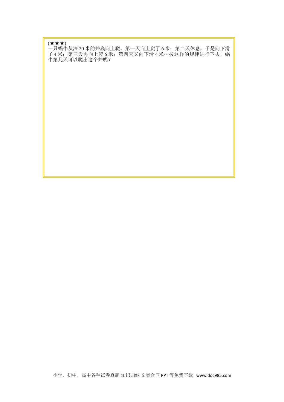 有趣的余数问题灵活运用一片两片三四片,五片六片七八片。九片十片十一片,飞进芦花都不见。小学、初中、高中各种试卷真题知识归纳文案合同PPT等免费下载www.doc985.com例1(★★★)一只蜗牛从深20米的井底向上爬。第一天向上爬了6米;第二天休息,于是向下滑了4米;第三天再向上爬6米;第四天又向下滑4米…按这样的规律进行下去,蜗牛第几天可以爬出这个井呢?小学、初中、高中各种试卷真题知识归纳文案合同PPT等免费下载www.doc985.com(★★★)如图,小青蛙每跳一步,可以从一个圆圈跳到相邻的圆圈。现在,一只红青蛙从标着“1”的圆圈按顺时针方向跳了100步,落在一个圆圈里。一只黑青蛙也从标着“1”的圆圈开始起跳,但是它是沿着逆时针跳了200步,落在另一个圆圈里。这两个圆圈里的数的乘积是多少?(★★★)甲,乙,丙,丁兄弟四人各收藏了一些宝石。每天早上他们都要聚在一起,重新分配宝石。分配的规则就是:拥有宝石最多的人分给其他三人每人一颗。第1天早上分配完之后,甲,乙,丙,丁分别有10,7,5,4颗宝石,那么第100天早上分配完宝石之后,四个人手中分别有几颗宝石呢?小学、初中、高中各种试卷真题知识归纳文案合同PPT等免费下载www.doc985.com例2例31年=12个月闰年:一年有366天;平年:一年有365天。大月:1月,3月,5月,7月,8月,10月,12月小月:2月,4月,6月,9月,11月平(闰)月:2月(★★)今天是周一,再过10天是星期几呢?小学、初中、高中各种试卷真题知识归纳文案合同PPT等免费下载www.doc985.com例4(★★★)今年2月1日是周二,那么今年1月1日是星期几呢?(★★★)2011年的四月有五个周五和五个周六,那么四月2号是周几?小学、初中、高中各种试卷真题知识归纳文案合同PPT等免费下载www.doc985.com例5例6每个月都会有四个周一,周二,周三,周四,周五,周六,周日精灵王子有趣的余数问题心得:周期问题三步走日期中的周期问题防止多1or少1如果今天的前五天是星期六的前三天,那么后天是星期几呢?小学、初中、高中各种试卷真题知识归纳文案合同PPT等免费下载www.doc985.com