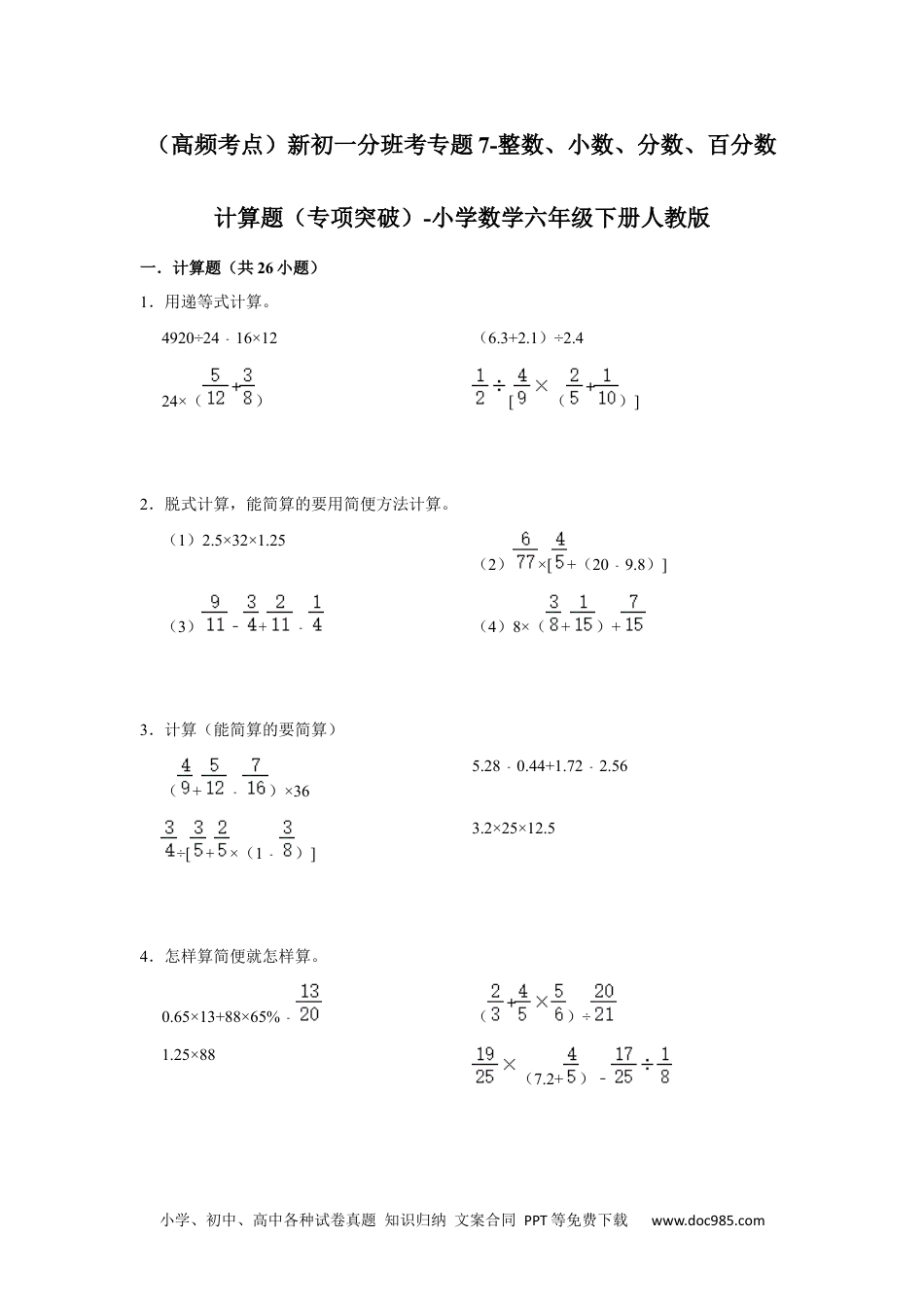 小学、初中、高中各种试卷真题知识归纳文案合同PPT等免费下载www.doc985.com(高频考点)新初一分班考专题7-整数、小数、分数、百分数计算题(专项突破)-小学数学六年级下册人教版一.计算题(共26小题)1.用递等式计算。4920÷2416×12﹣(6.3+2.1)÷2.424×()[()]2.脱式计算,能简算的要用简便方法计算。(1)2.5×32×1.25(2)×[+(209.8﹣)](3)﹣+﹣(4)8×(+)+3.计算(能简算的要简算)(+﹣)×365.280.44+1.722.56﹣﹣÷[+×(1﹣)]3.2×25×12.54.怎样算简便就怎样算。0.65×13+88×65%﹣()÷1.25×88(7.2+)﹣小学、初中、高中各种试卷真题知识归纳文案合同PPT等免费下载www.doc985.com5.能简算的要简算。(++)×24÷[(1+)×3]48×0.13+52×0.136.用你喜欢的方法计算下面各题。59×10112.73.65.4﹣﹣2.5÷×12.5×8÷12.5×824×(+﹣)×[﹣(﹣)]7.脱式计算(能简算的要简算)。(1)27049156﹣﹣(2)(5.9+1.65)÷0.25(3)3.8×99+3.8(4)4×0.37×25(5)÷[×(﹣)](6)÷7+×8.用脱式计算。(能简算的要简算)(1)35×(1﹣)÷(2)(3)2417.5÷2.5×1.5﹣(4)(5)(6)0.125×2.5×329.计算下面各题,能用简便算法的就用简便算法[1﹣()]÷10.28+8.145.28﹣240×()小学、初中、高中各种试卷真题知识归纳文案合同PPT等免费下载www.doc985.com10.计算下列各题。(能简算的要简算)(1)12.73.66.4﹣﹣(2)÷[()×](3)9.7×99+9.7(4)36×()11.计算下面各题,怎样简便就怎样算。6.39÷0.25÷44.5×+5.5×80%24×()12.脱式计算,能简算的要简算。15.283.63.4﹣﹣()×7.27.5÷[(6.84.3﹣)×0.12]13.计算下面各题。6.32.92.1+5.7﹣﹣201.53÷1.5+0.2﹣×[÷(﹣)]÷[×(0.4+)]14.能简算的要简算。65×(﹣)18.52÷+5.48×7.6×+1.4×0.8+80%35.4÷12.5÷0.817.836.97+2.173.03﹣﹣1998×小学、初中、高中各种试卷真题知识归纳文案合同PPT等免费下载www.doc985.com15.选择适当的方法计算①26×35+5.4÷0.27②0.6×49+52×60%﹣③1÷[2﹣(+)]④18.25﹣(6.451﹣)⑤(+)×7÷15⑥(5.6﹣×19.2)÷16.递等式计算,怎么简便怎么算。7.2×+4.5×48×()×1626.3÷2.5÷4+0.37()×728÷29﹣17.用合理的方法脱式计算(能简算的要写出简算过程)。9.3754.5﹣﹣(﹣)3.2×0.25×125÷[(﹣25%)÷](+﹣)÷(3.2×1.5+2.4)÷1.60.75×65+×34+75%18.脱式计算,能简算的简算。(7.5+2.5)×0.252.75×1.8+12.5×0.18[1﹣()]×3619.下面各题,怎样算简便就怎样算。69÷[1.4﹣(6.55.4﹣)]小学、初中、高中各种试卷真题知识归纳文案合同PPT等免费下载www.doc985.com21.8×9.7+2.18×3()÷20.计算,能简便的要简便计算。(﹣+)÷÷+×2.3×85+23×1.54×0.8×2.5×12.521.计算,能简算的要写出简算过程。12.5×0.45×54+0.125()×2×3×4(90+)×÷()[()×]+……+22.怎样算简便就怎样算①()×24②(8.253.15﹣)÷2.5÷4③4.75+3+5.6+25%④21÷()÷23.能简算就要简算。()×125.58+小学、初中、高中各种试卷真题知识归纳文案合同PPT等免费下载www.doc985.com5.021.372.63﹣﹣1.25×25×322.8×+2.2×25%0.25﹣24.计算下面各题,能简便的要简便。(+)×1812.5%×32×25%÷7+×÷[﹣(+)]25.计算下面各题,能简算的要简算。25×32×1.25(﹣0.375)÷(×)×+÷76﹣(+)26.计算下面各题,能简算的要简算。①×37+11÷②+0.4+0.875③20×+1÷50%小学、初中、高中各种试卷真题知识归纳文案合同PPT等免费下载www.doc985.com(高频考点)新初一分班考专题7-整数、小数、分数、百分数计算题(专项突破)-小学数学六年级下册人教版参考答案与试题解析一.计算题(共26小题)1.【解答】解:(1)4920÷2416×12﹣=205192﹣=13(2)(6.3+2.1)÷2.4=8.4÷2.4=3.5(3)24×()=24×+24×=10+9=19(4)[()]=[]==2.【解答】解:(1)2.5×32×1.25=2.5×(4×8)×1.25=(2.5×4)×(8×1.25)小学、初中、高中各种试卷真题知识归纳文案合同PPT等免费下载www...