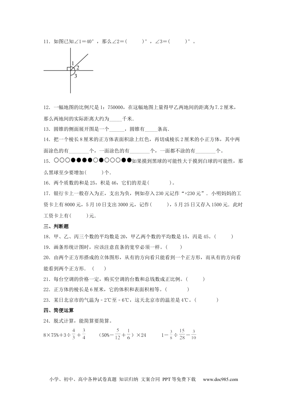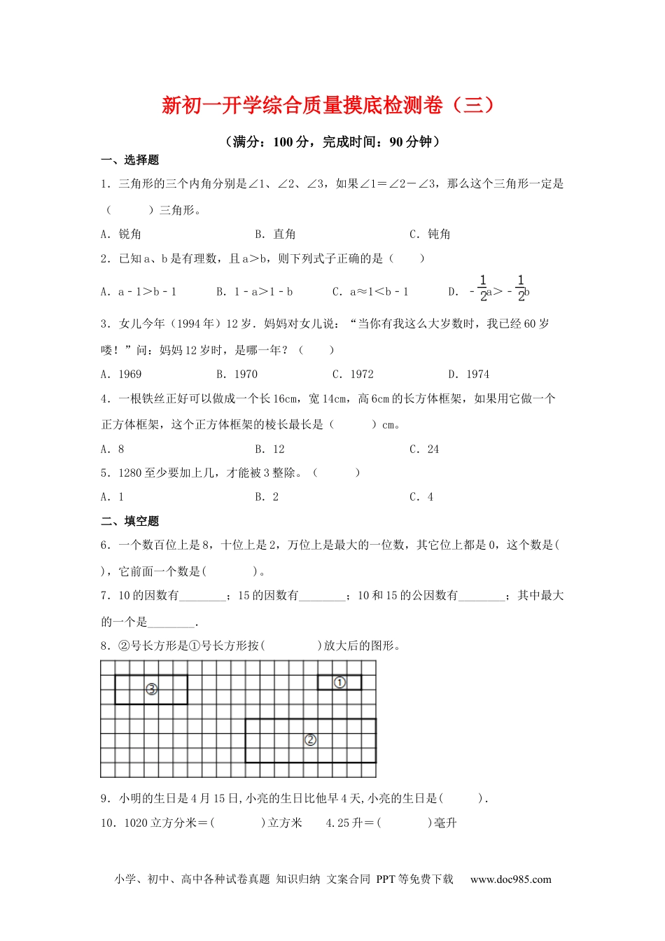 小学、初中、高中各种试卷真题知识归纳文案合同PPT等免费下载www.doc985.com新初一开学综合质量摸底检测卷(三)(满分:100分,完成时间:90分钟)一、选择题1.三角形的三个内角分别是∠1、∠2、∠3,如果∠1=∠2-∠3,那么这个三角形一定是()三角形。A.锐角B.直角C.钝角2.已知a、b是有理数,且a>b,则下列式子正确的是()A.a﹣1>b﹣1B.1﹣a>1﹣bC.a≈1<b﹣1D.﹣a>﹣b3.女儿今年(1994年)12岁.妈妈对女儿说:“当你有我这么大岁数时,我已经60岁喽!”问:妈妈12岁时,是哪一年?()A.1969B.1970C.1972D.19744.一根铁丝正好可以做成一个长16cm,宽14cm,高6cm的长方体框架,如果用它做一个正方体框架,这个正方体框架的棱长最长是()cm。A.8B.12C.245.1280至少要加上几,才能被3整除。()A.1B.2C.4二、填空题6.一个数百位上是8,十位上是2,万位上是最大的一位数,其它位上都是0,这个数是(),它前面一个数是()。7.10的因数有________;15的因数有________;10和15的公因数有________;其中最大的一个是________.8.②号长方形是①号长方形按()放大后的图形。9.小明的生日是4月15日,小亮的生日比他早4天,小亮的生日是().10.1020立方分米=()立方米4.25升=()毫升小学、初中、高中各种试卷真题知识归纳文案合同PPT等免费下载www.doc985.com11.如图已知∠1=40°,那么∠2=()°,∠3=()°。12.一幅地图的比例尺是1:750000,在这幅地图上量得甲乙两地间的距离为7.2厘米,那么两地间的实际距离大约为_____千米.13.圆锥的侧面展开图是一个______,圆锥有_____条高.14.把一个棱长8厘米的正方体表面积涂上红色,再切成棱长2厘米的小正方体,其中两面涂色的有________个,一面涂色的有________个,一面都不涂的有________个。15.如果摸到黑球的可能性大于摸到白球的可能性,那么黑球至少要增加()个.16.两个质数的和是25,积是46,它们的差是()。17.银行卡上一般存入为正,支出为负,例如存入230元记作“+230元”.小明妈妈的工资卡上有8000元,5月10日支出3000元,记作(),5月25日又存入1500元.此时工资卡上有()元.三、判断题18.甲、乙、丙三个数的平均数是20,甲乙两个数的平均数是15,丙是45。()19.画条形统计图时,应该注意直条的宽窄必须一样。()20.由两个正方形搭成的立体图形,从有的方向看只能看到一个正方形,而从有的方向看能看到两个正方形.()21.每台空调的价格一定,购买空调的台数和总钱数成正比例。()22.正方体的棱长是6厘米,它的体积和表面积相等。()23.某日北京市的气温为﹣2℃至﹣6℃,这天北京市的温差是4℃。()四、简便运算24.脱式计算,能简算要简算。8×75%+3÷+(50%-+)×241-÷-小学、初中、高中各种试卷真题知识归纳文案合同PPT等免费下载www.doc985.com五、解方程25.x+1.5=1.8=4x+80×20%=21.68六、作图题26.画出下面梯形的一条高.27.(1)在下面的方格纸上描出点A(3,6)、B(1,3)、C(5,3)、D(7,6),并依次连接,得到图形甲。(2)将图形甲先向右平移8格,再向上平移3格得到图形乙。(3)将图形甲绕D点逆时针旋转90度,得到图形丙。七、解答题28.六年级同学做广播操,每行站20人,正好站12行,如果每行站16人,能站多少行?小学、初中、高中各种试卷真题知识归纳文案合同PPT等免费下载www.doc985.com29.神童幼儿园里买来一些玩具,如果每班分8个玩具,就多出2个玩具,如果每班分10个玩具,就少12个玩具,幼儿园里有多少个班?30.(1)六年级(1)班学生第二学期借阅最多的是什么书?(2)第二学期借阅故事书的本数比第一学期多百分之几?(3)经统计,六年级(1)班平均每学期借阅科技书150本,第一学期借阅科技书多少本?31.甲班22名男同学的平均成绩是87分,18名女生的平均成绩是87.5分,全班同学的平均分是多少分?32.方体纸盒中装了4筒羽毛球,已知羽毛球筒的高为45cm,半径为4.5cm,请分别求出这个纸盒的表面积和容积。小学、初中、高中各种试卷真题知识归纳文案合同PPT等免费下载www.doc985.com33.甲、乙两个商场在夏季举办购物节活动。甲商场:每满1...