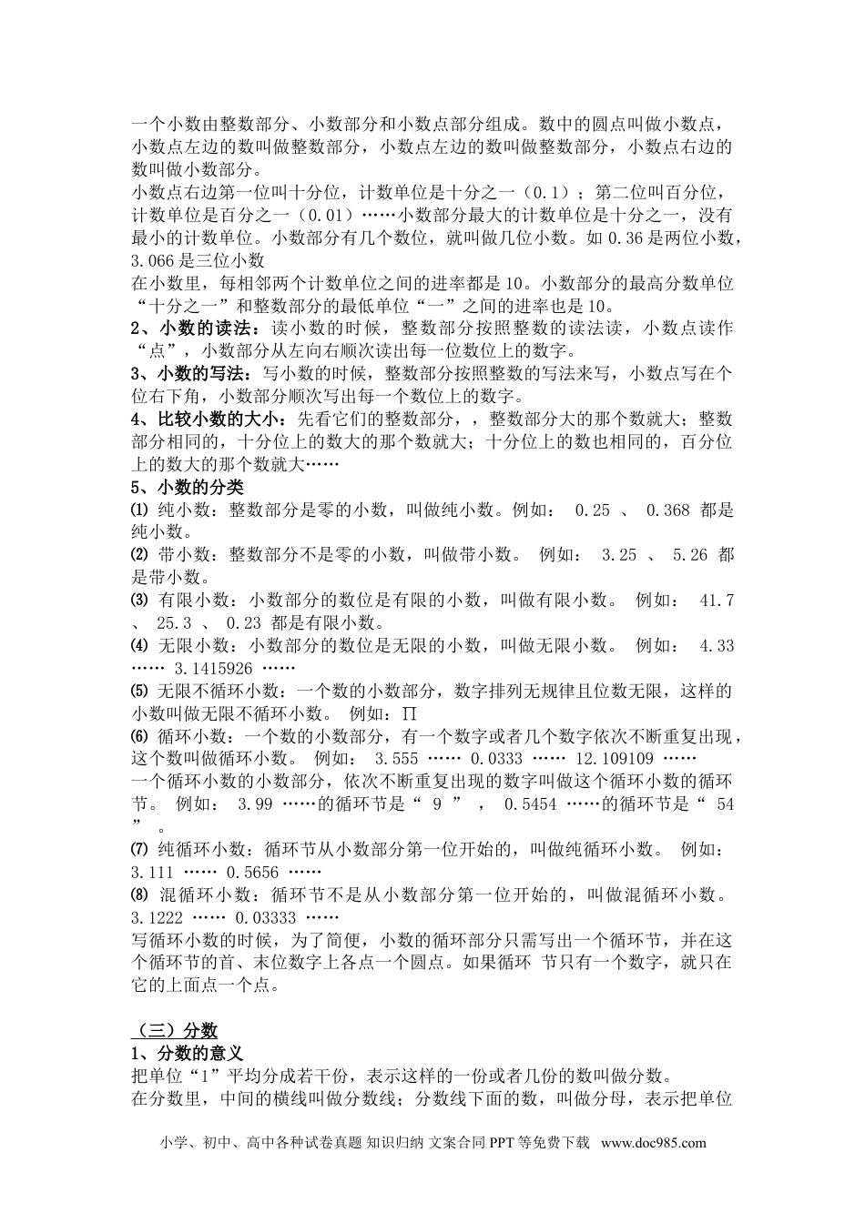 小学数学知识点大全第一章数和数的运算一、概念(一)整数1、整数的意义自然数和0都是整数。2、自然数我们在数物体的时候,用来表示物体个数的1,2,3……叫做自然数。一个物体也没有,用0表示。0也是自然数。3、计数单位一(个)、十、百、千、万、十万、百万、千万、亿……都是计数单位。其中“一”是计数的基本单位。10个1是10,10个10是100……每相邻两个计数单位之间的进率都是10。这样的计数法叫做十进制计数法。4、数位计数单位按照一定的顺序排列起来,它们所占的位置叫做数位。5、整数的读法:从高位到低位,一级一级地读。读亿级、万级时,先按照个级的读法去读,再在后面加一个“亿”或“万”字。每一级末尾的0都不读出来,其它数位连续有几个0都只读一个零。6、整数的写法:从高位到低位,一级一级地写,哪一个数位上一个单位也没有,就在那个数位上写0。7、一个较大的多位数,为了读写方便,常常把它改写成用“万”或“亿”作单位的数。有时还可以根据需要,省略这个数某一位后面的数,写成近似数。⑴准确数:在实际生活中,为了计数的简便,可以把一个较大的数改写成以万或亿为单位的数。改写后的数是原数的准确数。例如把1254300000改写成以万做单位的数是125430万;改写成以亿做单位的数12.543亿。⑵近似数:根据实际需要,我们还可以把一个较大的数,省略某一位后面的尾数,用一个近似数来表示。例如:1302490015省略亿后面的尾数是13亿。⑶四舍五入法:求近似数,看尾数最高位上的数是几,比5小就舍去,是5或大于5舍去尾数向前一位进1。这种求近似数的方法就叫做四舍五入法。8、整数大小的比较:位数多的那个数就大,如果位数相同,就看最高位,最高位上的数大,那个数就大;最高位上的数相同,就看下一位,哪一位上的数大那个数就大。以此类推。(二)小数1、小数的意义把整数1平均分成10份、100份、1000份……得到的十分之几、百分之几、千分之几……可以用小数表示。如1/10记作0.1,7/100记作0.07。一位小数表示十分之几,两位小数表示百分之几,三位小数表示千分之几……小学、初中、高中各种试卷真题知识归纳文案合同PPT等免费下载www.doc985.com一个小数由整数部分、小数部分和小数点部分组成。数中的圆点叫做小数点,小数点左边的数叫做整数部分,小数点左边的数叫做整数部分,小数点右边的数叫做小数部分。小数点右边第一位叫十分位,计数单位是十分之一(0.1);第二位叫百分位,计数单位是百分之一(0.01)……小数部分最大的计数单位是十分之一,没有最小的计数单位。小数部分有几个数位,就叫做几位小数。如0.36是两位小数,3.066是三位小数在小数里,每相邻两个计数单位之间的进率都是10。小数部分的最高分数单位“十分之一”和整数部分的最低单位“一”之间的进率也是10。2、小数的读法:读小数的时候,整数部分按照整数的读法读,小数点读作“点”,小数部分从左向右顺次读出每一位数位上的数字。3、小数的写法:写小数的时候,整数部分按照整数的写法来写,小数点写在个位右下角,小数部分顺次写出每一个数位上的数字。4、比较小数的大小:先看它们的整数部分,,整数部分大的那个数就大;整数部分相同的,十分位上的数大的那个数就大;十分位上的数也相同的,百分位上的数大的那个数就大……5、小数的分类⑴纯小数:整数部分是零的小数,叫做纯小数。例如:0.25、0.368都是纯小数。⑵带小数:整数部分不是零的小数,叫做带小数。例如:3.25、5.26都是带小数。⑶有限小数:小数部分的数位是有限的小数,叫做有限小数。例如:41.7、25.3、0.23都是有限小数。⑷无限小数:小数部分的数位是无限的小数,叫做无限小数。例如:4.33……3.1415926……⑸无限不循环小数:一个数的小数部分,数字排列无规律且位数无限,这样的小数叫做无限不循环小数。例如:∏⑹循环小数:一个数的小数部分,有一个数字或者几个数字依次不断重复出现,这个数叫做循环小数。例如:3.555……0.0333……12.109109……一个循环小数的小数部分,依次不断重复出现的数字叫做这个循环小数的循环节。例如:3.99……的循环节是“9”,0.5454……的循环节是“54”。⑺纯循环小数:...