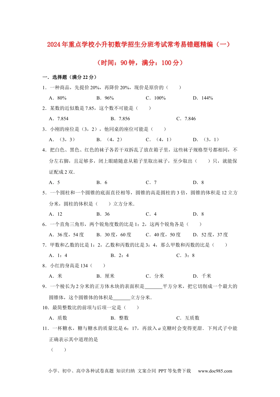 小学、初中、高中各种试卷真题知识归纳文案合同PPT等免费下载www.doc985.com2024年重点学校小升初数学招生分班考试常考易错题精编(一)(时间:90钟,满分:100分)一.选择题(满分22分)1.一种商品,先提价20%,再降价20%,现价是原价的()A.80%B.96%C.100%D.144%2.某数的近似数是7.85,这个数不可能是()A.7.854B.7.856C.7.8463.小刚的座位是(3,2),他同桌的座位可能是()A.(3,3)B.(4,2)C.(4,1)D.(3,1)4.把白色、黑色、红色的袜子各若干双拆乱了放在箱子里,这些袜子规格型号都相同,不分左右脚,且足够多,闭上眼睛随意从箱子里取出袜子,至少取出()只,就能保证配成2双.A.5B.6C.7D.85.一个圆柱和一个圆锥的底面直径相等,圆锥的高是圆柱的3倍,圆锥的体积是12立方分米,圆柱的体积是()立方分米.A.12B.36C.4D.86.一个直角三角形,两个锐角度数的比是1:2,这两个锐角各是()A.36度,54度B.30度,60度C.40度,50度D.52度,37度7.甲数和乙数的比是1:2,乙数和丙数的比是3:4,那么甲数和丙数的比是()A.1:4B.2:4C.3:88.小红的身高是134()A.米B.厘米C.分米D.千米9.一个棱长为2分米的正方体木块的表面积是平方分米,把它切削成一个最大的圆锥体,这个圆锥体的体积是立方分米.10.最简整数比的前项与后项一定是()A.质数B.整数C.互质数11.一杯糖水,糖与糖水的质量比是6:17,再放入a克糖时会变得更甜.下列式子中能正确表示其中道理的是()小学、初中、高中各种试卷真题知识归纳文案合同PPT等免费下载www.doc985.comA.<B.>C.=D.<二.判断题(满分10分)12.所有分母是12的最简真分数的和是2.13.两个半圆一定可拼成一个圆.14.在含盐25%的盐水中,加入5克盐和15克水,这时含盐率仍然是25%….15.六年级共有学生380人,其中至少有2人是同天出生的..16.一个圆柱和一个圆锥的体积相等,底面积也相等,如果圆柱的高是9厘米,那么圆锥的高一定是3厘米..三.填空题(满分16分)17.在一条100米的小路一侧,每隔五米栽一盆花,小路的两端都栽,共需要盆花.18.填“是”或“不是”.①62的倍数.②285的倍数.③912的倍数;915的倍数.19.以下四个说法中正确的是(填序号).①两位小朋友独立操作,共编了7个中国结,有一个小朋友至少编了4个;②若一个圆锥的底面半径扩大到原来的3倍,则底面周长扩大到原来的3倍,体积扩大到原来的27倍;③在美术本上画一栋50米高的房子,比较合适的比例尺是1:50;④正方形的周长与边长成正比例关系.20.把15个学生分到6个组,总有一个组至少有人.21.下面正方体由棱长1厘米的小木块拼成.如果在正方体的表面涂上红色,请你思考并填表:棱长(cm)三面涂色/块两面涂色/块一面涂色/块没有涂上色/块共有块数/块小学、初中、高中各种试卷真题知识归纳文案合同PPT等免费下载www.doc985.com22.爸爸想把一根木头锯成3段,锯开一处需要2分钟,锯完这根木头需要分钟.23.计算0.7+0.3×8时,应先算法,再算法.24.一个底面积为75平方厘米,长90厘米的圆柱形木料.它的体积是.四.计算题(满分22分)25.简便计算(+)×2445××××1445×+45×+45.26.解比例.=15:3=12:x:=x:五.应用题(满分30分)27.长江全长约6300千米,其下游的长度约占全长的,约是上游的,长江上游的长度大约是多少千米?小学、初中、高中各种试卷真题知识归纳文案合同PPT等免费下载www.doc985.com28.如图的物体摆放在地面上(如图,单位:分米),露在外面的面积和是多少平方分米?29.甲、乙、丙、丁四个人比赛乒乓球,每两人要赛一场,结果甲胜了丁,并且甲、乙、丙三人胜的场数相同,问丁胜了几场?30.一顶帐篷可以住4人,8顶帐篷可以住35人吗?31.小林骑自行车到科技馆要用0.3小时,每小时骑15千米,如果改为步行,每小时走5千米,在1小时内能到达科技馆吗?小学、初中、高中各种试卷真题知识归纳文案合同PPT等免费下载www.doc985.com参考答案一.选择题1.解:(1+20%)×(120%﹣)=1.2×0.8=9.6=96%答:现价是原价的96%。答案:B。2.解:“四舍”得到的7...
