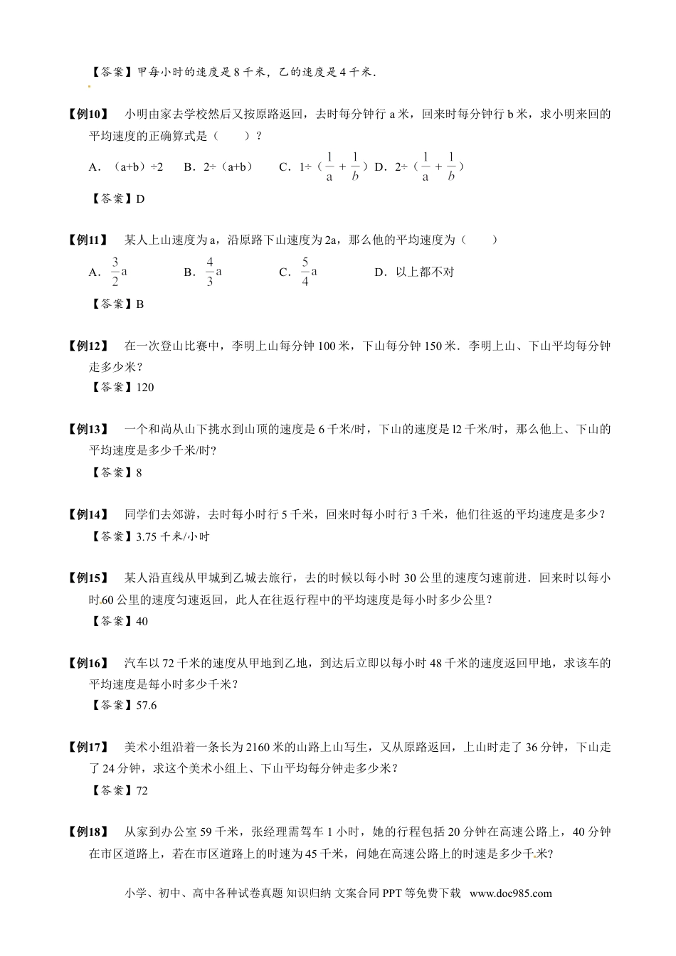 第1讲简单行程问题第一关求速度【知识点】1速度=路程÷时间【例1】小明2小时走了14千米,他每时行多少千米?【答案】7【例2】甲、乙两地相距150千米.一辆汽车从甲地开往乙地,行了3小时后,离乙地还有15千米.这辆汽车平均每小时行多少千米?【答案】45【例3】从家到学校,如果步行每分钟走80米,15分钟可到校,若想10分钟到校,每分钟走多少米?【答案】120【例4】一辆汽车从甲地开往乙地,每小时行60千米,5时到达.若要4时到达,则每小时需要多行多少千米?【答案】15【例5】一辆汽车早上8点从甲地开往乙地,按原计划每小时行驶60千米,下午4时到达乙地.但实际晚点2小时到达,这辆汽车实际每小时行驶多少千米?【答案】48【例6】一列火车早上5时从甲地开往乙地,按原计划每小时行驶120千米,下午3时到达乙地,但实际到达时间是下午5时整,晚点2小时.问火车实际每小时行驶多少千米?【答案】100【例7】一列火车早上6时从甲城开往乙城,计划每小时行驶100千米,下午6时到达乙城.但实际到达时间是下午4时,提前2小时.问火车实际每小时行驶多少千米?【答案】120【例8】王叔叔驾驶一辆摩托车,上午11时从城东开到城西,计划每小时行驶60千米,下午2时到达城西,实际到达时间是下午3时,晚到1小时.问实际每小时比计划少行多少千米?【答案】24【例9】东西两镇相距20千米,甲、乙两人分别从两镇同时出发相背而行,甲每小时的路程是乙的2倍,3小时后两人相距56千米.两人的速度各是多少?小学、初中、高中各种试卷真题知识归纳文案合同PPT等免费下载www.doc985.com【答案】甲每小时的速度是8千米,乙的速度是4千米.【例10】小明由家去学校然后又按原路返回,去时每分钟行a米,回来时每分钟行b米,求小明来回的平均速度的正确算式是()?A.(a+b)÷2B.2÷(a+b)C.1÷(+)D.2÷(+)【答案】D【例11】某人上山速度为a,沿原路下山速度为2a,那么他的平均速度为()A.B.C.D.以上都不对【答案】B【例12】在一次登山比赛中,李明上山每分钟100米,下山每分钟150米.李明上山、下山平均每分钟走多少米?【答案】120【例13】一个和尚从山下挑水到山顶的速度是6千米/时,下山的速度是l2千米/时,那么他上、下山的平均速度是多少千米/时?【答案】8【例14】同学们去郊游,去时每小时行5千米,回来时每小时行3千米,他们往返的平均速度是多少?【答案】3.75千米/小时【例15】某人沿直线从甲城到乙城去旅行,去的时候以每小时30公里的速度匀速前进.回来时以每小时60公里的速度匀速返回,此人在往返行程中的平均速度是每小时多少公里?【答案】40【例16】汽车以72千米的速度从甲地到乙地,到达后立即以每小时48千米的速度返回甲地,求该车的平均速度是每小时多少千米?【答案】57.6【例17】美术小组沿着一条长为2160米的山路上山写生,又从原路返回,上山时走了36分钟,下山走了24分钟,求这个美术小组上、下山平均每分钟走多少米?【答案】72【例18】从家到办公室59千米,张经理需驾车1小时,她的行程包括20分钟在高速公路上,40分钟在市区道路上,若在市区道路上的时速为45千米,问她在高速公路上的时速是多少千米?小学、初中、高中各种试卷真题知识归纳文案合同PPT等免费下载www.doc985.com【答案】87【例19】邮递员翻山送邮件,上坡用了1.2小时,平均每小时行5千米;下坡用了2小时,平均每小时行8.2千米.全程平均每小时行多少千米?【答案】7【例20】某人步行,走平路的速度是4千米/时,走下坡路的速度是6千米/时.此人经过一段路,其中上坡和下坡的路程相等,平均速度依然是4千米/时.则此人走上坡路的速度是多少千米/时?【答案】3【例21】小明从家到学校有两条一样长的路,一条是平路,另一条是一半上坡路、一半下坡路.小明上学走两条路所用的时间一样多.已知下坡的速度是平路的2倍,那么平路的速度是上坡的多少倍?【答案】1.5【例22】王老师每天早上做户外运动,他第一天跑步2000米,散步1000米,共用24分钟;第二天他跑步3000米,散步500米,共用22分钟.王老师跑步时的速度总是一样的,散步时的速度也总是一样的.王老师跑步的速度是多少?【答案】200米/分【例23...
