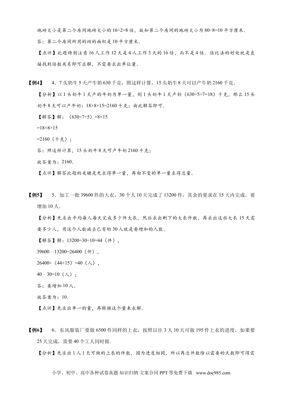 第二讲归一归总问题A较易【例1】1.若2台收割机3天可以收割小麦450亩,则用7台收割机收割2100亩小麦需要4天.【分析】首先求出每台每天的工作效率,再求出7台1天的工作效率,因为工作量÷工作效率=工作时间,据此解答即可.【解答】解:2100÷(450÷3÷2×7)=2100÷(75×7)=2100÷525=4(天),答:用7台收割机收割2100亩小麦需要4天.故答案为:4.【点评】此题属于二次反归一问题,首先用连除求出单一量,再用除法求出部分量.【例2】2.修一段路,24人12天可以修完,现在24人修了4天后,再增加8人,还要6天才能修完.【分析】24人12天可修完,则需要总工数为24×12,现在24人修了4天后,还剩下24×(124﹣)个工数,此时又增加了8人,则还需要24×(124﹣)÷(24+8)天才能修完.【解答】解:24×(124﹣)÷(24+8)=24×8÷32=6(天)答:还要6天才能修完.故答案为:6【点评】在求出需要总工数的基础上,根据总工数与每天的工数之间的关系进行解答比较简单.【例3】3.4名瓦工用面积为80平方厘米的地砖铺6平米的房间,用了3天时间:16名瓦工用另一种规格的地砖铺了12平方米的房间,用了12天时间.每名瓦工铺一块任何大小的地砖所需要的时间都相等.那么,第二个房间所用的地砖面积是10平方厘米.【分析】要想求出两次用的砖的大小关系,我们就要知道两次工作量的关系,如果第二次工作量是第一次的2倍,那么第一次砖的大小就是第二次的2倍.【解答】解:考虑两次铺砖的比例关系:16名砖瓦工铺12天所铺的块数,应是4名砖瓦工铺3天所铺块数倍,但房间大小方面,第二个房间只是第一个房间12÷6=2倍,这说明第一房间的小学、初中、高中各种试卷真题知识归纳文案合同PPT等免费下载www.doc985.com地砖大小是第二个房间地砖大小的16÷2=8倍,故知第二个房间的地砖大小为80÷8=10平方厘米.答:第二个房间所用的砖的面积是10平方厘米.【点评】此题特别注意16人工作12天是4人工作3天的16倍,而不是4倍.倍比法的好处就是直接找到倍数关系即可求解,不需要求出单位量.【例4】4.7头奶牛5天产牛奶630千克,照这样计算,15头奶牛8天可以产牛奶2160千克.【分析】以1头奶牛1天产的牛奶为单一量,则1头奶牛1天产奶(630÷5÷7=18)千克,那么15头奶牛8天可以产牛奶:18×8×15=2160千克;由此解答即可.【解答】解:(630÷7÷5)×8×15=18×8×15=2160(千克);答:照这样计算,15头奶牛8天可产牛奶2160千克;故答案为:2160.【点评】解答此题的关键是先求得单一量,再由不变的单一量求得总量.【例5】5.加工一批39600件的大衣,30个人10天完成了13200件,其余的要求在15天内完成,要增加10人.【分析】先求出平均每人每天完成多少件大衣,然后求出剩下的大衣件数,再求出这些大衣15天需要多少人,用这个人数减去已有的30人就是要增加的人数.【解答】解:13200÷30÷10=44(件),3960013200=26400﹣(件),26400÷(44×15)=40(人),4030=10﹣(人);答:要增加10人.故答案为:10.【点评】先求出单一的量,再根据这个量来求解.【例6】6.东风服装厂要做6500件同样的上衣,按照以往3人10天可做195件上衣的进度,如果要25天完成,需要40个工人同时做.【分析】先求出1人1天可做的上衣的件数,因为进度相同,所以再总件数除以需要的天数即可得需小学、初中、高中各种试卷真题知识归纳文案合同PPT等免费下载www.doc985.com要多少个工人同时做.【解答】解:6500÷(195÷3÷10)÷25=6500÷6.5÷25=40(个)答:需要40个工人同时做.故答案为:40.【点评】本题考查了归一应用题,关键是先求出1人1天可做的上衣的件数.【例7】7.一台铺路机3小时铺路162米,照这样计算,2台铺路机9小时共铺路972米.【分析】照这样计算,说明一台铺路机的效率不变,先求出每台铺路机每小时铺多少米的路,然后再乘2求出2台铺路机每小时铺多少米的路,再乘9就是2台铺路机9小时可以铺路多少米.据此解答.【解答】解:162÷3×2×9=54×2×9=972(米)答:2台铺路机9小时共铺路972米.故答案为:972.【点评】本题关键是先求出单一的量,再根据单一的量求出总量.【例8】8.商店有三种颜色的...