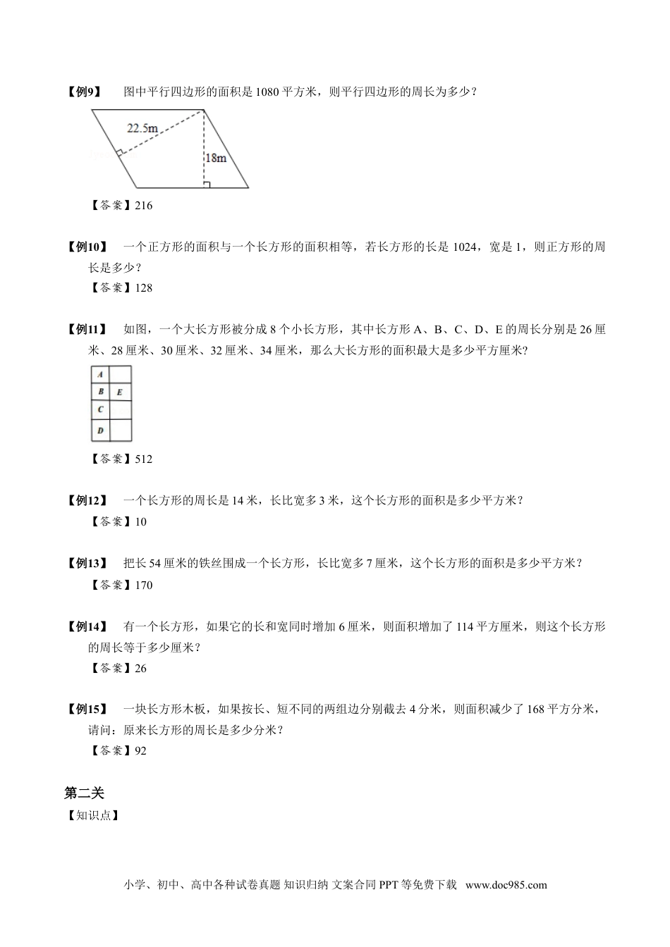 第3讲巧算周长第一关【例1】军军和小虎两人都用长6厘米的10根小棒围图形,军军围了一个正方形,它的周长是多少厘米?小虎围了一个长方形,它的周长是多少厘米?【答案】60;60【例2】一个等腰梯形有三条边的长分别是65厘米、30厘米、20厘米,并且它的下底是最长的一条边.那么,这个等腰梯形的周长是多少厘米?【答案】145或135【例3】把一个直径是4厘米的圆分成两个完全相等的半圆,这两个半圆的周长之和是多少?【答案】20.56【例4】将一个边长为4厘米的正方形对折,再沿折线剪开,得到两个长方形.请问:这两个长方形的周长之和比原来正方形的周长多几厘米?【答案】8【例5】从边长为20的正方形中去掉一个面积为36的长方形,这个长方形的两条边长都是整数,并且长方形的一条边长是正方形某条边长的一部分.剩下图形周长的最大值为多少?【答案】116【例6】从一块长方形钢板上截下一个正方形钢板,如图所示,截下部分(如图阴影部分)的面积是76平方分米,那么截下部分的周长是多少分米?【答案】40【例7】有一个长方形,如果长减少4米,宽减少2米,面积就比原来减少44平方米,且剩下部分正好是一个正方形,这个正方形的周长是多少米?【答案】24[来源:学§科§网Z§X§X§K]【例8】一个长方形,长和宽各增加3厘米,面积增加了60平方厘米,原长方形的周长是多少厘米?【答案】34小学、初中、高中各种试卷真题知识归纳文案合同PPT等免费下载www.doc985.com【例9】图中平行四边形的面积是1080平方米,则平行四边形的周长为多少?【答案】216【例10】一个正方形的面积与一个长方形的面积相等,若长方形的长是1024,宽是1,则正方形的周长是多少?【答案】128【例11】如图,一个大长方形被分成8个小长方形,其中长方形A、B、C、D、E的周长分别是26厘米、28厘米、30厘米、32厘米、34厘米,那么大长方形的面积最大是多少平方厘米?【答案】512【例12】一个长方形的周长是14米,长比宽多3米,这个长方形的面积是多少平方米?【答案】10【例13】把长54厘米的铁丝围成一个长方形,长比宽多7厘米,这个长方形的面积是多少平方米?【答案】170【例14】有一个长方形,如果它的长和宽同时增加6厘米,则面积增加了114平方厘米,则这个长方形的周长等于多少厘米?【答案】26【例15】一块长方形木板,如果按长、短不同的两组边分别截去4分米,则面积减少了168平方分米,请问:原来长方形的周长是多少分米?【答案】92第二关【知识点】小学、初中、高中各种试卷真题知识归纳文案合同PPT等免费下载www.doc985.com【例16】如图中阴影部分是正方形,最大长方形的周长是多少厘米?【答案】26【例17】如图,阴影部分是正方形,DF=6厘米,AB=9厘米.求最大的长方形的周长【答案】30【例18】下图中的阴影部分BCGF是正方形,线段FH长18厘米,线段AC长24厘米,则长方形ADHE的周长是多少厘米?【答案】84【例19】如图,阴影部分是正方形,则长方形的周长是多少厘米?【答案】32【例20】如图,在长方形ABCD中,EFGH是正方形.如果AF=16厘米,HC=21厘米,那么长方形ABCD的周长是多少厘米?小学、初中、高中各种试卷真题知识归纳文案合同PPT等免费下载www.doc985.com【答案】74【例21】如图,在长方形ABCD中,EFGH是正方形.如果AF=11厘米,HC=14厘米,那么长方形ABCD的周长是多少厘米?【答案】50【例22】如图,分别以B,C为圆心的两个半圆的半径都是1厘米,则阴影部分的周长是多少厘米?(π取3)【答案】3【例23】两个长7厘米,宽3厘米的长方形重叠成右边的图形.这个图形的周长是多少厘米?【答案】28【例24】有两个相同的长方形,长是100分米,宽是40分米.把它们按下图叠放,叠放后的图形周长是多少米?面积是多少平方米?【答案】叠放后的图形周长是40米,面积是64平方米小学、初中、高中各种试卷真题知识归纳文案合同PPT等免费下载www.doc985.com【例25】如图是用3个长8厘米、宽3厘米的长方形拼成的,这个图形的周长是多少?【答案】45【例26】用6张同样的正方形纸按如图方法重叠,每个正方形的顶点恰好位于另一个正方形的中心,且边相互平行.每个正方形的边长为10厘米,求重叠后图形的周长.【答案】14...