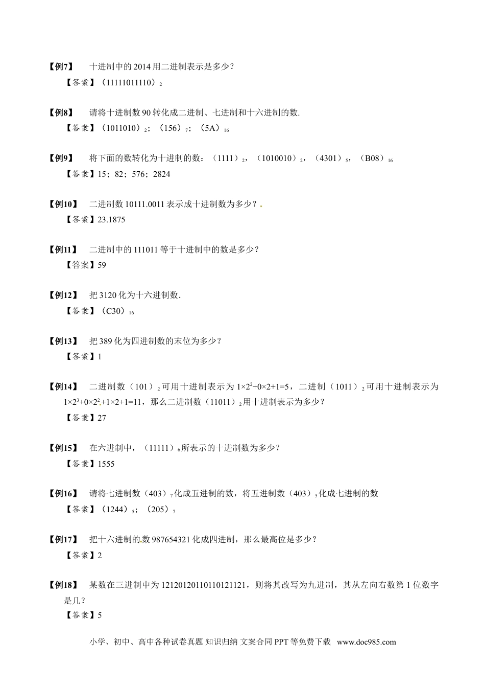 第8讲进位制第一关进制的认识【知识点】1.二进制是计算技术中广泛采用的一种数制.二进制数据是用0和1两个数码来表示的数.它的基数为2,进位规则是“逢二进一”,借位规则是“借一当二”.2.二进制数据也是采用位置计数法,其位权是以2为底的幂.二进制数据一般写法如:110101101.3.除了二进制还有八进制、十六进制,定义和运算方式和二进制几乎相同,只是十六进制由0-9,A-F组成,字母不区分大小写.与10进制的对应关系是:0-9对应0-9;A-F对应10-15;N进制的数可以用0--(N-1)的数表示超过9的用字母A-F.【例1】古时候的原始人捕猎,捕到一只野兽对应一根手指.等到10根手指用完,就在绳子上打一个结,这就是运用现在的数学中的()A.出入相补原理B.等差数列求和C.十进制计数法[来源:学&科&网]【答案】C【例2】)二进制数进行加、减、乘、除运算时是满____进一,退一作______.【答案】二;二【例3】以下各数中有可能是五进制数的是()A.55B.106C.732D.2134【答案】D【例4】以下各数中有可能是八进制数的是()A.88B.206C.AED.926【答案】B【例5】四进制的五位数有多少个?【答案】768第二关进制的换算【例6】填空(1)(21)10=()3(2)(184)10=()6(3)(153)10=()7(4)(103)10=()5.【答案】(1)210;(2)504;(3)306;(4)403小学、初中、高中各种试卷真题知识归纳文案合同PPT等免费下载www.doc985.com【例7】十进制中的2014用二进制表示是多少?【答案】(11111011110)2【例8】请将十进制数90转化成二进制、七进制和十六进制的数.【答案】(1011010)2;(156)7;(5A)16【例9】将下面的数转化为十进制的数:(1111)2,(1010010)2,(4301)5,(B08)16【答案】15;82;576;2824【例10】二进制数10111.0011表示成十进制数为多少?【答案】23.1875【例11】二进制中的111011等于十进制中的数是多少?【答案】59【例12】把3120化为十六进制数.【答案】(C30)16【例13】把389化为四进制数的末位为多少?【答案】1【例14】二进制数(101)2可用十进制表示为1×22+0×2+1=5,二进制(1011)2可用十进制表示为1×23+0×22+1×2+1=11,那么二进制数(11011)2用十进制表示为多少?【答案】27【例15】在六进制中,(11111)6所表示的十进制数为多少?【答案】1555【例16】请将七进制数(403)7化成五进制的数,将五进制数(403)5化成七进制的数【答案】(1244)5;(205)7【例17】把十六进制的数987654321化成四进制,那么最高位是多少?【答案】2【例18】某数在三进制中为12120120110110121121,则将其改写为九进制,其从左向右数第1位数字是几?【答案】5小学、初中、高中各种试卷真题知识归纳文案合同PPT等免费下载www.doc985.com【例19】把0.8125转换为二进制小数【答案】(0.1101)2【例20】一个自然数的四进制表达式是一个三位数,它的三进制表达式也是一个三位数,而且这两个三位数的数码顺序恰好相反.请问:这个自然数的十进制表示是多少?【答案】22【例21】一个自然数的六进制表示与九进制表示均为三位数,并且它们各位数字的排列顺序恰好相反,那么此自然数用十进制表示法写出是多少?【答案】217【例22】一个自然数的七进制表达式是一个三位数,而这个自然数的九进制表达式也是一个三位数,而且这两个三位数数码顺序恰好相反,那么这个自然数的十进制表达式是多少?【答案】370【例23】记号(25)k表示k进制的数,如果(52)k是(25)k的两倍,请写出(123)k在十进制中所表示的数【答案】83【例24】在n进制的数中,若(1030)n=140,求n.【答案】5【例25】若(20)10=(202)m,求m【答案】3【例26】若(1m1)5=(1n00)3,求m,n【答案】2,1[来源:Z。xx。k.Com]【例27】若(64)10=(54)N,求N.【答案】12【例28】若(52)10=(34)N,求N。【答案】16【例29】记号(132)p表示p进制的数,若(132)p=3×(55)p,求(247)p在十进制中表示的数。【答案】358【例30】一个超过20的自然数N,在14进制与20进制中都可以表示为回文数(回文数就是指正读与小学、初中、高中各种试卷真题知识归纳文案合同PPT等免费下载www....