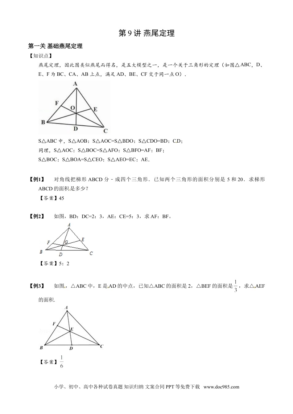 第9讲燕尾定理第一关基础燕尾定理【知识点】燕尾定理,因此图类似燕尾而得名,是五大模型之一,是一个关于三角形的定理(如图△ABC,D、E、F为BC、CA、AB上点,满足AD、BE、CF交于同一点O).S△ABC中,S△AOB:S△AOC=S△BDO:S△CDO=BD:CD;同理,S△AOC:S△BOC=S△AFO:S△BFO=AF:BF;S△BOC:S△BOA=S△CEO:S△AEO=EC:AE.【例1】对角线把梯形ABCD分﹣成四个三角形.已知两个三角形的面积分别是5和20.求梯形ABCD的面积是多少?【答案】45【例2】如图,BD:DC=2:3,AE:CE=5:3,求AF:BF。【答案】5:2【例3】如图,△ABC中,E是AD的中点,已知△ABC的面积是2,△BEF的面积是,求△AEF的面积.【答案】小学、初中、高中各种试卷真题知识归纳文案合同PPT等免费下载www.doc985.com【例4】如图,S△BDF=3cm2,S△CDF=5cm2,S△CEF=4cm2,求△ABC的面积.[来源:学科网ZXXK]【答案】【例5】如图,AE=DE,BC=3BD,三角形ABC的面积是30平方分米,求阴影部分的面积.【答案】12[来源:学,科,网][来源:学.科.网]【例6】如图,在三角形ABC中,AE=ED,D点是BC的四等分点,阴影部分的面积占三角形ABC面积的几分之几?【答案】【例7】如图,在三角形ABC中,CE=2AE,F是AD的中点,三角形ABC的面积是1,那么阴影部分的面积是多少?【答案】【例8】三角形ABC中,∠C是直角,已知AC=2,CD=2,CB=3,AM=BM,那么三角形AMN(阴影部分)的面积是多少?小学、初中、高中各种试卷真题知识归纳文案合同PPT等免费下载www.doc985.com【答案】[来源:学科网]【例9】如图,在三角形ABC中,AF=2BF,CE=3AE,CD=2BD,连接CF交DE于P点,求的值.【答案】【例10】梯形ABCD中,AE与DC平行,S△ABE=15,求S△BCF。【答案】15【例11】如图,正方形ABCD的面积是120平方厘米,E是AB的中点,F是BC的中点,四边形BGHF的面积是多少平方厘米?【答案】14小学、初中、高中各种试卷真题知识归纳文案合同PPT等免费下载www.doc985.com【例12】如图,BD、CF将长方形ABCD分成4块,△DEF的面积是4平方厘米,△CED的面积是6平方厘米,则四边形ABEF的面积是多少平方厘米?【答案】11【例13】如图,长方形ABCD的面积是2平方厘米,EC=2DE,F是DG的中点.阴影部分的面积是多少平方厘米?【答案】【例14】如图,在△ABC中,BD=AD,EF=3,FC=2,△ADH与△AGC的面积和等于四边形EFGH的面积,那么BE的长是多少?【答案】1[来源:Z*xx*k.Com]【例15】如图,正方形ABCD被分成了面积相同的8个三角形,如果DG=5,那么正方形ABCD面积是多少?【答案】64【例16】如图所示,正方形ABCD的面积为9平方厘米,正方形EFGH的面积为36平方厘米,边BC小学、初中、高中各种试卷真题知识归纳文案合同PPT等免费下载www.doc985.com落在EH上.已知三角形AGC的面积为6.75平方厘米,求三角形ABE的面积.【答案】2.25小学、初中、高中各种试卷真题知识归纳文案合同PPT等免费下载www.doc985.com小学、初中、高中各种试卷真题知识归纳文案合同PPT等免费下载www.doc985.com