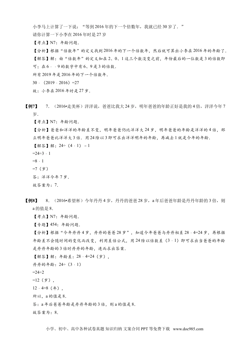 第8讲年龄问题A较易【例1】1.(2014•两岸四地)一家三口人,母亲比父亲小2岁,父亲比儿子大27岁,5年后,全家人的年龄和是82岁,现在儿子的年龄是多少岁?()A.4B.7C.6D.5【考点】N7:年龄问题.【分析】5年之后他们之间的年龄差不变,母亲比父亲小2岁,父亲比儿子大27岁,5年后母亲仍比父亲小2岁,儿子仍比父亲小27岁,也就是5年后3人的年龄和是爸爸年龄的3倍少2+27=29岁,先用年龄和加上29岁,再除以3即可求出5年后父亲的年龄,进而求出5年后儿子的年龄,再减去5年,就是现在儿子的年龄.【解答】解:(82+2+27)÷3=111÷3=37(岁)37275=5﹣﹣(岁)答:现在儿子的年龄是5岁.故选:D.【例2】2.(2013•创新杯)一对双胞胎和一组三胞胎5个人年龄的总和是84.如果把双胞胎的年龄同三胞胎的年龄互换,那么这5人年龄的总和是76.那么双胞胎的年龄是()A.12B.16C.20D.24【考点】N7:年龄问题.【专题】454:年龄问题.【分析】根据题意,设双胞胎的年龄是x岁,三胞胎的年龄是y岁,由一对双胞胎和一组三胞胎5个人年龄的总和是84可得2x+3y=84;把双胞胎的年龄同三胞胎的年龄互换,那么这5人年龄的总和是76岁,可得2y+3x=76,联立方程组然后再进一步解答.【解答】解:设双胞胎的年龄是x岁,三胞胎的年龄是y岁;由题意可得:解得:x=12,y=20.答:双胞胎的年龄是12岁.故选:A.【例3】3.(2011•其他模拟)如果三个人的平均年龄是22岁,且没有小于18岁的,那么最大的人的年龄可能是()岁.A.27B.28C.29D.30【考点】N7:年龄问题.小学、初中、高中各种试卷真题知识归纳文案合同PPT等免费下载www.doc985.com【专题】454:年龄问题.【分析】三个人的平均年龄是22岁,他们的年龄和是22×3=66岁,要求最大的年龄是多少岁,必须使另外两人年龄最小,又没有小于18岁的,那么其他两人的年龄最小都是18岁,然后再用6618﹣18﹣即可.【解答】解:根据题意可得最小的两个人的年龄分别是18岁;22×31818﹣﹣=661818﹣﹣=30(岁).答:最大的人的年龄可能是30岁.故选:D.【例4】4.(2009•创新杯)2008年父亲的年龄是兄弟二人年龄之和的2倍,是兄弟两人年龄差的7倍,父子三人年龄之和为84,那么哥哥生于()年.A.1995B.1990C.1992D.1989【考点】N7:年龄问题.【分析】先求出2008年父亲的年龄、哥哥的年龄,再求出哥哥生于哪一年.【解答】解:84岁是兄弟两人年龄和的2+1=3(倍)兄弟两人年龄和是84÷3=28(岁)2008年父亲的年龄28×2=56(岁)兄弟的年龄差是56÷7=8(岁)2008年哥哥的年龄(28+8)÷2=18(岁)哥哥生于200818=1990﹣年,故选:B.【例5】5.(2018•奥林匹克)已知4年后小马的和小王的年龄之和是39岁,5年前小马9岁,那么今年小王17岁.【考点】N7:年龄问题.【分析】由“4年后小马的和小王的年龄之和是39岁”条件,即可求出今年他们的年龄和是31岁;再由“5年前小马9岁”求出今年小马是9+5=14岁;之后便可得出今年小王的年龄了.【解答】解:394×2=31﹣(岁)31﹣(9+5)=17(岁)故:此空为17.【例6】6.(2016•陈省身杯)老张和小李讨论即将到来的2016年.小李说:“我发现2016这个数很有趣,最后一个数字6正好是前面2、0、1这三个数字的和的倍数”老张说:“那咱们就把符合这种条件的年份定义为‘倍数年’.”小学、初中、高中各种试卷真题知识归纳文案合同PPT等免费下载www.doc985.com小李马上计算了一下说:“等到2016年的下一个倍数年,我就已经30岁了.”请你计算一下小李在2016年时是27岁【考点】N7:年龄问题.【分析】根据“倍数年”的定义找到2016年的下一个倍数年,然后就可算出小李在2016年的年龄了.【解答】解:由“倍数年”的定义知在2、0、1这三个数没变之前,年份最后的一位数是3的倍数即可;在69﹣﹣的数字中有6、9是3的倍数.所有2019年是2016年的下一个倍数年.30﹣(20192016﹣)=27故:小李在2016年时是27岁.【例7】7.(2016•走美杯)洋洋说,爸爸比我大24岁,明年爸爸的年龄正好是我的4倍,洋洋今年7岁.【考点】N7:年龄问题.【分析】爸爸和洋洋的年龄差不变,明年爸爸仍比洋洋大24岁,明年爸爸的年龄是洋洋...