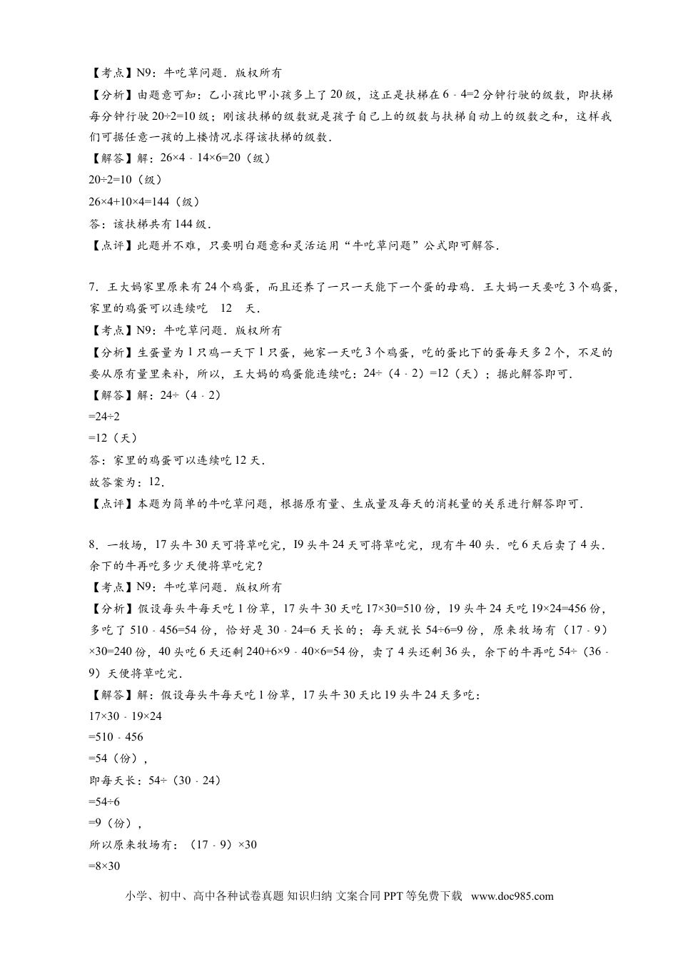第10讲牛吃草问题A一.选择题(共3小题)1.王奶奶家现有40个鸡蛋,还养了一只每天都要下一个蛋的母鸡,如果王奶奶每天吃3个鸡蛋,那么她可以这样连吃几天?()A.13B.17C.19D.20【考点】N9:牛吃草问题.版权所有【分析】共有40个鸡蛋,每天都会有一只鸡下一个蛋,每天吃3个,这样每天鸡蛋的数量在40的基础上每天减少2个.【解答】解:每天数量减少2个,40÷(31﹣)=20(天)故选:D.【点评】本题的关键就是找到每一天鸡蛋减少的数量.鸡蛋总共的个数÷每天减少的数量=天数.问题解决.2.展览会上午9点开门,但早就有人排队等着入场,并且从第一个观众来到之后每分钟来到的人数是一定的,如果开3入场口,9点9分就不再有人排队了;如果开5个入场口,9点5分就没人排队了,问第一个观众来到的时间是()A.8:15B.8:30C.8:45D.8:50【考点】N9:牛吃草问题.版权所有【分析】以9点为分界线.把“入场口”看成“牛”,“来的人”看成“草”,9点前来的人为原有的草,之后来的人为生长的草.然后再用“牛吃草的公式”来解此题就可以了.【解答】解:①每分钟来的人数是(3×95×5﹣)÷(95﹣)=2÷4=0.5(份)②9点前来的人数是5×55×0.5=22.5﹣(份)③22.5÷0.5=45(分钟)9点=8点60分8点60分﹣45分=8点15分=8:15故选:A.【点评】此题只要能正确区分“何为牛,何为草”就能顺利解答.3.一艘船发生漏水事故,立即安装两台抽水机向外抽水,此时已漏进水800桶.一台抽水机每分钟抽水18桶,另一台每分钟抽水14桶,50分钟把水抽完,每分钟漏进水()桶.A.14B.16C.18D.20【考点】N9:牛吃草问题.版权所有小学、初中、高中各种试卷真题知识归纳文案合同PPT等免费下载www.doc985.com【分析】结合题意并运用“工作总量=工作效率×工作时间”公式,先求得50分钟两台抽水机共抽总水量1600桶,这说明50分钟漏进的水量是1600800=800﹣桶,然后即可求得答案.【解答】解:(18+14)×50=1600(桶)(1600800﹣)÷50=16(桶)故选:B.【点评】此题较简单,只要灵活运用“工作总量=工作效率×工作时间”公式即可轻松作答.二.填空题(共18小题)4.有一个温泉游泳池,池底有泉水不断涌出,要想抽干满池的水,10台抽水机需工作8小时,9台抽水机需工作9小时,为了保证游泳池水位不变(池水既不减少,也不增多),则向外抽水的抽水机需1台.【考点】N9:牛吃草问题.版权所有【分析】根据题意,只需求出每小时新增水即可,设1台抽水机1小时抽1份水,则每小时新增水:(9×910×8﹣)=1,即只需要1台抽水机将新增水抽调就能保证游泳池水位不变.【解答】解:设1台抽水机1小时抽1份水,每小时新增水:9×910×8=1﹣;答:向外抽水的抽水机需1台.【点评】此题属于典型的牛吃草问题,应仔细分析,找到解决问题的巧妙办法,迎刃而解.5.一艘轮船发生漏水事故,船长立即安排用两部抽水机同时向外抽水,当时已经漏进了600桶水,一部抽水机每分钟抽水18桶,另一部抽水机每分钟抽水22桶,经过24分钟把水抽完,这艘轮船每分钟漏进15桶水.【考点】N9:牛吃草问题.版权所有【分析】2部抽水机1分钟可以抽出18+22=40桶水,那么24分钟就抽出去960桶水,船体本来有600桶水,那么24分钟内,漏进船体的水为960600=360﹣桶水,所以每分钟漏进:600÷24=15(桶).【解答】解:[(18+22)×24600]÷24﹣=[40×24600]÷24﹣=[960600]÷24﹣=600÷24=15(桶)答:这艘轮船每分钟漏进15桶水.故答案为:15.【点评】此题属于“牛吃草”问题,求出24分钟内漏进船体的水量,是解答此题的关键.6.自动扶梯以均匀的速度由下往上行驶,两个小孩嫌电梯太慢,急着从扶梯上楼,甲小孩每分钟走26级,乙小孩每分钟走14级,结果甲小孩用4分钟到达楼上,乙小孩用6分钟到达楼上,该扶梯共有144级.小学、初中、高中各种试卷真题知识归纳文案合同PPT等免费下载www.doc985.com【考点】N9:牛吃草问题.版权所有【分析】由题意可知:乙小孩比甲小孩多上了20级,这正是扶梯在64=2﹣分钟行驶的级数,即扶梯每分钟行驶20÷2=10级;刚该扶梯的级数就是孩子自己上的级数与扶梯自动上的级数之和,这样我们可据任意一孩...