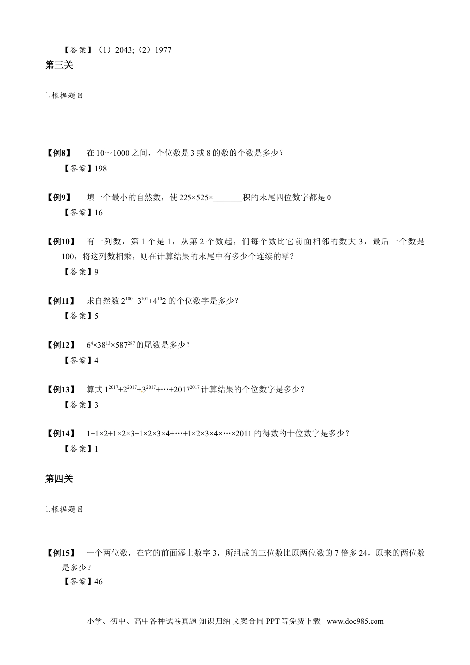 第1讲数字问题第一关1.根据题目【例1】从八位数72859641中,划去其中3个数字,使剩下的5个数字(顺序不变)组成一个五位数,这个五位数最大是多少?【答案】85964【例2】如图,飞镖圆靶分成五个部分,每部分得分依次是1,3,5,7,9(分),某小孩掷了六支飞镖,全部击中圆靶,下列得分中可能是他所得总分的是()A.4B.17C.28D.56【答案】28【例3】一条大鲸鱼,头长3米,身长等于头长加尾长,尾长等于头长加身长的一半的和.这条大鲸鱼全长多少米?【答案】24【例4】一个工厂电表的示数是52222千瓦,若干天后,电表的示数(五位数)又出现四个相同的数码,那么该工厂在这些天内至少又用了多少千瓦的电?【答案】333第二关1.根据题目【例5】如果把1到999这些自然数按照从小到大的顺序排成一排,这样就组成了一个多位数:123456789…996997998999.那么,在这个多位数里,从左到右第2000个数字是多少?【答案】0【例6】将自然数按从小到大都顺序无间隔地排成一列:123456789101112…,则左起第2010位上的数字是多少?【答案】6【例7】一个从1开始的奇数数列从小到大排列,已知该数列的每个数都没有重复数字,求:(1)该数列的第598个数是多少?(2)该数列的前598个数一共出现了多少个数字?小学、初中、高中各种试卷真题知识归纳文案合同PPT等免费下载www.doc985.com【答案】(1)2043;(2)1977[来源:学科网ZXXK]第三关1.根据题目【例8】在10~1000之间,个位数是3或8的数的个数是多少?【答案】198【例9】填一个最小的自然数,使225×525×_______积的末尾四位数字都是0【答案】16【例10】有一列数,第1个是1,从第2个数起,们每个数比它前面相邻的数大3,最后一个数是100,将这列数相乘,则在计算结果的末尾中有多少个连续的零?【答案】9【例11】求自然数2100+3101+4102的个位数字是多少?【答案】5【例12】64×3813×587287的尾数是多少?【答案】4【例13】算式12017+22017+32017+…+20172017计算结果的个位数字是多少?【答案】3【例14】1+1×2+1×2×3+1×2×3×4+…+1×2×3×4×…×2011的得数的十位数字是多少?【答案】1第四关1.根据题目[来源:学|科|网]【例15】一个两位数,在它的前面添上数字3,所组成的三位数比原两位数的7倍多24,原来的两位数是多少?[来源:Zxxk.Com]【答案】46小学、初中、高中各种试卷真题知识归纳文案合同PPT等免费下载www.doc985.com【例16】有A、B两个整数,A的各位数字之和为36,B的各位数字之和为25,且两数相加时进位三次,那么A+B的各位数字之和是多少?【答案】34【例17】一个三位数的数字之和是18,百位数字比十位数字大1,个位数字比十位数字大2,这个三位数是多少?【答案】657【例18】有一个两位数,它的十位数字比个位数字多5.用算盘上的算珠来表示这个两位数的话,共需要用9个算珠.这个两位数是多少?【答案】94【例19】在一列自然数1,2,3,4,5…中,有一个自然数,与它相邻的左右两个自然数的乘积比它的8倍还要大8,这个自然数是多少?【答案】9【例20】若一个自然数中的某个数字等于其它所有数字之和,则称这样的数为“S数”,(例:561,6=5+1),则最大的三位数“S数”与最小的三位数“S数”之差为多少?【答案】889【例21】两个整数相加时,得到的数是一个两位数,且两个数字相同;相乘时,得到的数是一个三位数,且三个数字相同.请写出所有满足上述条件的两个整数。【答案】37,18【例22】有这样的三位数,个位数是十位数的3倍,比百位数多2,这样的三位数可能是什么?【答案】113、426、739【例23】有一列数,从第二个数起,每个数都是它前面的各位数字平方之和.如果第一个数是2015,那么这列数的第2015个数是多少?【答案】37【例24】一个三位数,等于它的数字和的13倍.这样的三位数有多少个?分别是什么?【答案】3;195,156,117【例25】今年是2015年,2015年可以写成2015÷5=13×31,也就是说2015除以它的末位数字(末位不为0)可以得到两个两位倒序质数(13和31)乘积的形式,其中两个倒序质数可相同,我们把这样的数叫做“最帅数”,(1)请按2015÷5=13×31的形式任意写出一个符合条件的“最帅数”....