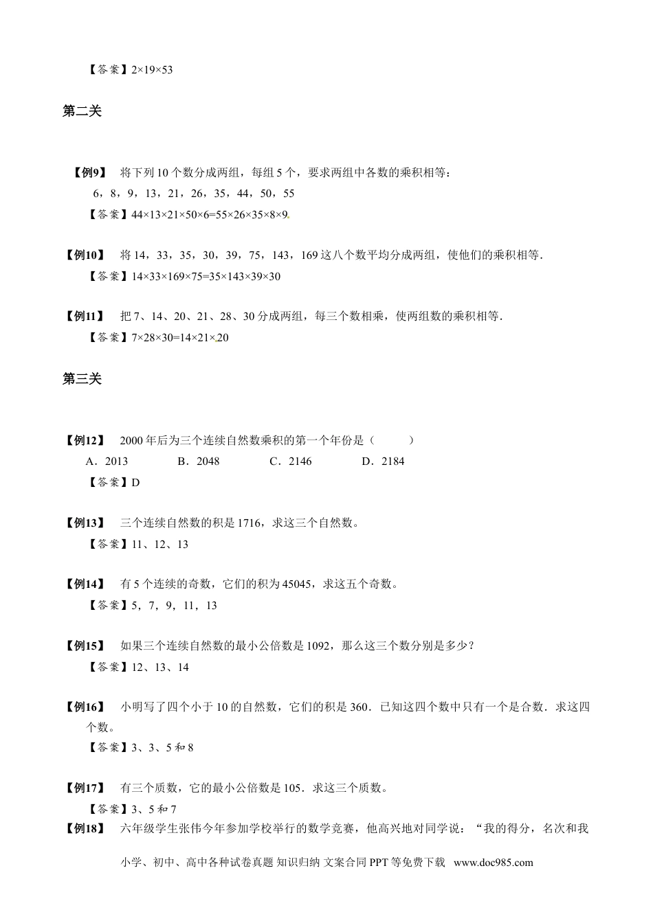 第9讲分解质因数第一关【例1】把60分解质因数是60=1×2×2×3×5.(判断对错)×【答案】×【例2】把60分解质因数。【答案】2×2×3×5【例3】请把下面的数分解质因数:(1)160;(2)598;(3)211【答案】(1)160=2×2×2×2×2×5;(2)598=2×13×23;(3)211=1×211【例4】把1112111这个对称的数分解质因数。【答案】7×11×11×13×101【例5】像2,3,5,7这样的只能被1和自身整除的大于1的自然数叫做质数或者素数.每一个自然数都能写成若干个质数(可以相同)的乘积,比如,4=2×2,6=2×3,8=2×2×2,9=3×3,10=2×5等,那么2×3×5×7-1写成这种形式为________________。【答案】11×19【例6】像2,3,5,7这样只能被1和自身整除的大于1的自然数叫做质数或素数.每一个自然数都能写成若干个(可以相同)质数的乘积,比如,4=2×2,6=2×3,8=2×2×2,9=3×3,10=2×5等,那么,2×2×2×2×3×3-1写成这种形式为________________。【答案】11×13【例7】像2,3,5,7这样只能被1和自身整除的大于1的自然数叫做质数或素数.每一个自然数都能写成若干个(可以相同)质数的乘积,比如,4=2×2,6=2×3,8=2×2×2,9=3×3,10=2×5等,那么,1938写成这种形式为________________。【答案】2×3×17×19【例8】像2,3,5,7这样只能被1和自身整除的大于1的自然数叫做质数或素数.每一个自然数都能写成若干个(可以相同)质数的乘积,比如,4=2×2,6=2×3,8=2×2×2,9=3×3,10=2×5等,那么,2014写成这种形式为________________。小学、初中、高中各种试卷真题知识归纳文案合同PPT等免费下载www.doc985.com【答案】2×19×53第二关[来源:Z_xx_k.Com]【例9】将下列10个数分成两组,每组5个,要求两组中各数的乘积相等:6,8,9,13,21,26,35,44,50,55【答案】44×13×21×50×6=55×26×35×8×9【例10】将14,33,35,30,39,75,143,169这八个数平均分成两组,使他们的乘积相等.【答案】14×33×169×75=35×143×39×30【例11】把7、14、20、21、28、30分成两组,每三个数相乘,使两组数的乘积相等.【答案】7×28×30=14×21×20第三关【例12】2000年后为三个连续自然数乘积的第一个年份是()A.2013B.2048C.2146D.2184【答案】D【例13】三个连续自然数的积是1716,求这三个自然数。【答案】11、12、13【例14】有5个连续的奇数,它们的积为45045,求这五个奇数。【答案】5,7,9,11,13【例15】如果三个连续自然数的最小公倍数是1092,那么这三个数分别是多少?【答案】12、13、14【例16】小明写了四个小于10的自然数,它们的积是360.已知这四个数中只有一个是合数.求这四个数。【答案】3、3、5和8【例17】有三个质数,它的最小公倍数是105.求这三个质数。【答案】3、5和7[来源:学科网ZXXK]【例18】六年级学生张伟今年参加学校举行的数学竞赛,他高兴地对同学说:“我的得分,名次和我小学、初中、高中各种试卷真题知识归纳文案合同PPT等免费下载www.doc985.com的年龄连乘,积正好是2328.”那么张伟今年多少岁?【答案】12【例19】一个一位数与一个三位数的乘积等于2012,那么这两个数的和是多少?【答案】507【例20】公园内有三只小熊猫,恰好一只比一只大1岁,它们的年龄之积是60,问:最小的熊猫几岁?【答案】3【例21】有四个学生,他们的年龄恰好是一个比一个大1岁,而他们的年龄乘积是5040,那么,他们的年龄各是多少?【答案】7岁、8岁、9岁、10岁【例22】在数学竞赛中取得前四名的方方、园园、宝宝、贝贝年龄依次是相差1岁,而且他们年龄的乘积是11880,则他们的年龄分别是多少?【答案】9岁、10岁、11岁、12岁【例23】四个互不相同的正整数的乘积是231,则这四个数的和是多少?【答案】22【例24】自然数a,b,c,d互不相等,已知a•b•c•d=2013,求a+b+c+d。【答案】76【例25】如果6个连续奇数的乘积是135135,那么这6个数的和是多少?【答案】48【例26】三个连续的自然数的最小公倍数是9828,这三个自然数的和等于多少?【答案】81【例27】已知两个数的和是164,两个数的积是4875的因数,那么两个数的差是多少?【答案】86【例2...