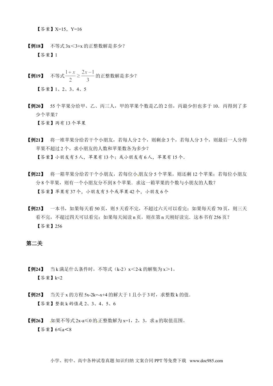 第19讲不等方程的分析求解第一关【知识点】(1)几个含有同一个未知数的一元一次不等式合在一起,就组成了一个一元一次不等式组.几个一元一次不等式的解集的公共部分,叫做由它们所组成的一元一次不等式组的解集.(2)求不等式组的解集的过程,叫做解不等式组.(3)解一元一次不等式组的步骤:①分别求出不等式组中各个不等式的解集;②利用数轴求出这些不等式的解集的公共部分,即这个不等式组的解集.【例1】解不等式:(π-4)x≥(4-π)[来源:学科网]【答案】x≤1【例2】一个数的2倍加上6不大于这个数的4倍减去4,求这个数的取值范围【答案】x≥5【例3】若x的50%不小于它的3倍与5的和,求x的取值范围。【答案】x≤-2【例4】解不等式:3×30y+5×16(24-y)≥2100.【答案】y≥18【例5】,则a可取整数的范围是多少?【答案】a<11【例6】解不等式:【答案】x≤-36【例7】解不等式:【答案】-6<x<2【例8】解不等式:【答案】x≤-1小学、初中、高中各种试卷真题知识归纳文案合同PPT等免费下载www.doc985.com【例9】解不等式:【答案】x≤-20【例10】解不等式:【答案】【例11】解不等式:【答案】x≠0【例12】解不等式:1≤|3x-5|≤2【答案】【例13】不满足不等式|x+2|-|x-1|>2的x应满足的条件是什么?【答案】【例14】求不等式组的整数解[来源:学科网]【答案】0、1、2【例15】解不等式组:【答案】x>0[来源:学。科。网]【例16】解不等式组:【答案】【例17】已知,X、Y为连续自然数.求X、Y。小学、初中、高中各种试卷真题知识归纳文案合同PPT等免费下载www.doc985.com【答案】X=15,Y=16【例18】不等式3x<3+x的正整数解是多少?【答案】1【例19】不等式的正整数解是多少?【答案】1、2、3、4、5【例20】55个苹果分给甲、乙、丙三人,甲的苹果个数是乙的2倍,丙最少但也多于10.丙得到了多少个苹果?【答案】丙有13个苹果【例21】将一堆苹果分给若干个小朋友,若每人分2个,则剩余3个,若每人分3个,则最后一人分得苹果不超过2个,求小朋友的人数和苹果数各为多少?【答案】小朋友有5人,苹果有13个;或小朋友有6人,苹果有15个.【例22】将一箱苹果分给若干个小朋友,若每位小朋友分5个苹果,则还剩12个苹果;若每位小朋友分8个苹果,则有一个小朋友分不到8个苹果.求这一箱苹果的个数与小朋友的人数?【答案】苹果有37个,小朋友有5个或苹果42个,小朋友6个【例23】一本书,如果每天看50页,则5天看不完,不超过六天可以看完;如果每天看70页,则三天看不完,不超过四天可以看完;如果每天阅读n页,则在第n天刚好读完.这本书有256页?【答案】256第二关【例24】当k满足什么条件时,不等式(k-2)x<2-k的解集为x>1。【答案】k<2【例25】当关于x的方程5x-2k=-x+4的解大于1且小于3时,求整数k的值.【答案】整数k的值是2、3、4、5、6【例26】如果不等式2x-a≤0的正整数解为x=1,2,3,求a的取值范围。【答案】6≤a<8小学、初中、高中各种试卷真题知识归纳文案合同PPT等免费下载www.doc985.com【例27】关于x的不等式的解集中有且只有四个整数,求a的取值范围。【答案】9≤a<12【例28】如果关于x的不等式2x-a<1的所有正整数解之和为6,求a的取值范围。【答案】5<a≤7【例29】如果关于x的不等式3-2x<a的所有正整数解之和为6,求a的取值范围。【答案】-5≤a<-3第三关【例30】不等式如果成立,那么括号中可填的正整数是多少?【答案】7【例31】不等式如果成立,那么括号中可填的正整数是多少?【答案】10【例32】不等式如果成立,那么括号中可填的正整数是多少?【答案】3【例33】如果117<4×□<149,那么□中可填的自然数有多少个?[来源:学科网ZXXK]【答案】8【例34】不等式如果成立,那么括号中可填的正整数有多少个?【答案】7【例35】在不等式的括号中填入一个自然数,使得不等号成立,一共有多少种不同的填法?【答案】4小学、初中、高中各种试卷真题知识归纳文案合同PPT等免费下载www.doc985.com【例36】要使成立,式中的x最多可表示多少个不同的自然数?这些自然数分别是什么?【答案】x最多可表示5个不同的自然数,这些自然数分别是50,51,52,53,54【例37...