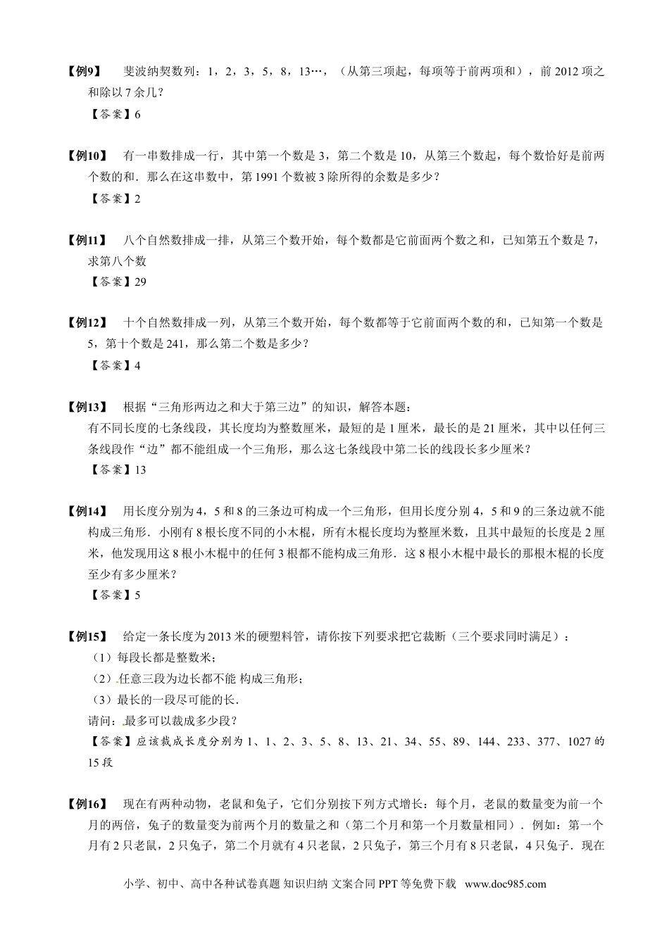 第16讲斐波那契数列第一关求某一项【知识点】斐波那契数列,又称黄金分割数列,指的是这样一个数列:1、1、2、3、5、8、13、21、…特别指出:第0项是0,第1项是第一个1.这个数列从第二项开始,每一项都等于前两项之和.相关运用:生物应用、黄金分割、杨辉三角、质数数量、尾数循环、自然界中、数字谜题.【例1】找规律,填数:2,3,5,8,______,21,______,______.【答案】13,34,55【例2】找规律,填数:2,2,4,6,______,16,______,______.【答案】10,26,42【例3】找规律,填数:34,21,13,8,______,3,______,______.【答案】5,2,1【例4】有一列数:1、1、3、8、22、60、164、448…其中的前三个数是1、1、3,从第四个数起,每个数都是这个数前面两个数之和的2倍.那么,这列数中的第10个数是多少?【答案】3344【例5】一串数字2134…,从第三个数字起,每个数字都是它前面两个数字之和的个位数字,则这串数字的第2012个数字是多少?【答案】9【例6】一列数1,1,2,3,5,8,13,21,…从第三项开始每一项是前两项的和,此数列的第2000项除以8的余数是多少?【答案】5【例7】写出下列数列的的第22项除以3的余数.1,1,3,5,9,17,31,57,105【答案】0[来源:学+科+网Z+X+X+K]【例8】有这样一列数,前两个数分别是0和1,从第三个数开始,每一个数都是前两个数的和:0,1,1,2,3,5,8,13,21,34,…,请问:这个数列的第1000个数除以8所得的余数是多少?【答案】2小学、初中、高中各种试卷真题知识归纳文案合同PPT等免费下载www.doc985.com【例9】斐波纳契数列:1,2,3,5,8,13…,(从第三项起,每项等于前两项和),前2012项之和除以7余几?【答案】6【例10】有一串数排成一行,其中第一个数是3,第二个数是10,从第三个数起,每个数恰好是前两个数的和.那么在这串数中,第1991个数被3除所得的余数是多少?【答案】2【例11】八个自然数排成一排,从第三个数开始,每个数都是它前面两个数之和,已知第五个数是7,求第八个数【答案】29【例12】十个自然数排成一列,从第三个数开始,每个数都等于它前面两个数的和,已知第一个数是5,第十个数是241,那么第二个数是多少?【答案】4【例13】根据“三角形两边之和大于第三边”的知识,解答本题:有不同长度的七条线段,其长度均为整数厘米,最短的是1厘米,最长的是21厘米,其中以任何三条线段作“边”都不能组成一个三角形,那么这七条线段中第二长的线段长多少厘米?【答案】13【例14】用长度分别为4,5和8的三条边可构成一个三角形,但用长度分别4,5和9的三条边就不能构成三角形.小刚有8根长度不同的小木棍,所有木棍长度均为整厘米数,且其中最短的长度是2厘米,他发现用这8根小木棍中的任何3根都不能构成三角形.这8根小木棍中最长的那根木棍的长度至少有多少厘米?【答案】5【例15】给定一条长度为2013米的硬塑料管,请你按下列要求把它裁断(三个要求同时满足):(1)每段长都是整数米;(2)任意三段为边长都不能构成三角形;(3)最长的一段尽可能的长.请问:最多可以裁成多少段?【答案】应该裁成长度分别为1、1、2、3、5、8、13、21、34、55、89、144、233、377、1027的15段【例16】现在有两种动物,老鼠和兔子,它们分别按下列方式增长:每个月,老鼠的数量变为前一个月的两倍,兔子的数量变为前两个月的数量之和(第二个月和第一个月数量相同).例如:第一个月有2只老鼠,2只兔子,第二个月就有4只老鼠,2只兔子,第三个月有8只老鼠,4只兔子.现在小学、初中、高中各种试卷真题知识归纳文案合同PPT等免费下载www.doc985.com知道,第7个月时,兔子比老鼠多一只,那么,第一个月兔子最少有多少只?【答案】55【例17】如图,ABCD是边长为1的正方形,以CD为边向外做一个正方形称为第一次操作,然后以BE为边向外做一个正方形称为第二次操作,再以AF为边向外做一个正方形称为第三次操作,…,以此类推,那么第十次操作做出的正方形边长为多少?【答案】89【例18】“斐波那契数列”是这样一列数:1,1,2,3,5,8,13,21,34,…,依次在以1,2,3,5,…为边的正方形中画一个90度的...