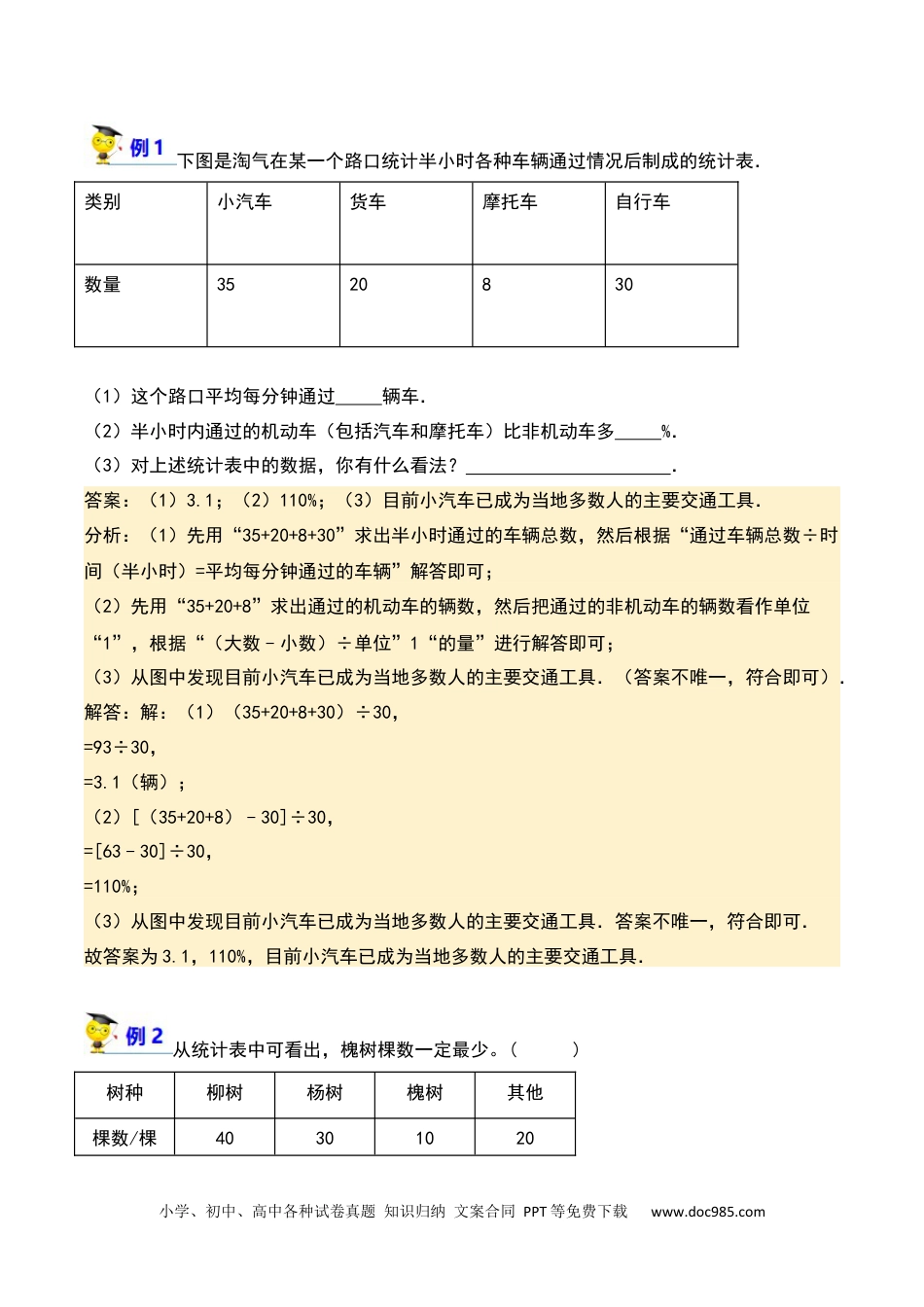 小学、初中、高中各种试卷真题知识归纳文案合同PPT等免费下载www.doc985.com温馨提示:图片放大更清晰《统计表》精准讲练通用版小升初数学小学、初中、高中各种试卷真题知识归纳文案合同PPT等免费下载www.doc985.com下图是淘气在某一个路口统计半小时各种车辆通过情况后制成的统计表.类别小汽车货车摩托车自行车数量3520830(1)这个路口平均每分钟通过辆车.(2)半小时内通过的机动车(包括汽车和摩托车)比非机动车多%.(3)对上述统计表中的数据,你有什么看法?.答案:(1)3.1;(2)110%;(3)目前小汽车已成为当地多数人的主要交通工具.分析:(1)先用“35+20+8+30”求出半小时通过的车辆总数,然后根据“通过车辆总数÷时间(半小时)=平均每分钟通过的车辆”解答即可;(2)先用“35+20+8”求出通过的机动车的辆数,然后把通过的非机动车的辆数看作单位“1”,根据“(大数﹣小数)÷单位”1“的量”进行解答即可;(3)从图中发现目前小汽车已成为当地多数人的主要交通工具.(答案不唯一,符合即可).解答:解:(1)(35+20+8+30)÷30,=93÷30,=3.1(辆);(2)[(35+20+8)﹣30]÷30,=[63﹣30]÷30,=110%;(3)从图中发现目前小汽车已成为当地多数人的主要交通工具.答案不唯一,符合即可.故答案为3.1,110%,目前小汽车已成为当地多数人的主要交通工具.从统计表中可看出,槐树棵数一定最少。()树种柳树杨树槐树其他棵数/棵40301020小学、初中、高中各种试卷真题知识归纳文案合同PPT等免费下载www.doc985.com答案:×解析:其它种类的树品种不确定,举例说明即可。其它种类的可能有柏树,数量可能比10小,所以原题说法错误。某饮品公司在足球联赛期间出售饮料,下表为3场比赛中出售的瓶数:那么这三天出售饮料的总瓶数大约是()瓶?A.23000B.22000C.21000D.20000答案:B解析:6890+8204+5915≈22000(瓶)故答案为B把6890看作6900,把8204看作8200,把5915看作5900,然后把三个数相加即可估算出三天出售饮料的总瓶数.四年级一班同学,每人从家里带来一本课外书,办起了小小图书室。共有连环画13本,故事书15本,科技书6本,其他书5本。根据以上的信息制作统计表,要求在统计表中要有以上的种类外,还要添加“合计”。答案:四年级一班小小图书室图书统计表时间:2013年4月17日小学、初中、高中各种试卷真题知识归纳文案合同PPT等免费下载www.doc985.com种类连环画故事书科技书其它合计数量(本)13156539解析:首先写上表格的名称,和制表时间。表格第一行为种类,分别输入4种书的名称和合计这5项;第一行为本数,对应名称输入各种数的本数,并计算出总本数填入合计栏。、题一填空1.班六(主任老师把1)班学生按情况统计,如下表。体重分组组别第一组二第组第三组第四组第五组体重/千克30~3435~3940~4445~4950以及上人数3920106(1)欢欢的是体重39,千克她编在第()。组(2)如果,体重从重到轻排列乐乐排在第15,的可是个那么他体重能()。千克2.()小统计班同学的,数下表中.元江县华了全鞋号并将据纪录在鞋号18192021222324人数2469722小学、初中、高中各种试卷真题知识归纳文案合同PPT等免费下载www.doc985.com(1)班中同学,是从这个任选一个鞋号19的可是号能性.(2)班中同学,的为从这个任选一个他鞋号21号或22的可号能性与,的是比较正确.(①大于小②于等)③于3.2013年5月9,定市中学生动高市中.日保第十届运会在碑店一隆重召开并取得圆满成功动市中小学生动的果,学的这次运会充分展示了全开展阳光体育活成促进了校体育工作交流动的,市的用.下统计表和体育运开展对全深入推进素质教育将起到积极促进作请将面补充.完整定市中学生动表人数统计表保第十届运会参加队列演单位中一中三二中中五中八小一二小小三合计人数700500600400400600400600(1)小学(小、二小小)人数中学(中、中、二中、中中)人数少一和三比一三五和八人.(2)初中(二中、中中)人数小学(小、二小小)人数少五和八比一和三%.(3)表下的统计图.请根据上将面条形补充完整二、题判断1.下表是二(2)班学生喜欢的小动物的数量情况,学生们最喜欢狗。(...