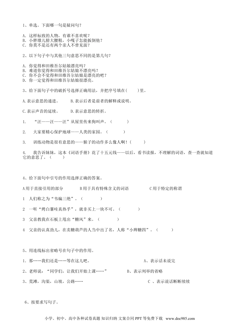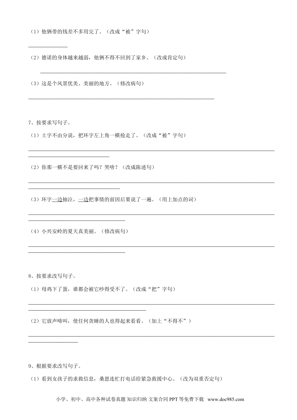 1、单选。下面哪一句是疑问句?A.这样标致的人物,有谁不喜欢呢?B.小胖墩儿膀大腰粗,小嘎子怎能扳倒他?C.你莫不是还有两个亲人不曾见面?2、以下句子中与其他三句意思不同的是第几句?A.你觉得和田维吾尔姑娘漂亮吗?B.难道你觉得和田维吾尔姑娘不漂亮吗?C.你不会不觉得和田维吾尔姑娘是漂亮的吧?D.你一定觉得和田维吾尔姑娘很漂亮。3、给下面句子中的破折号选择正确用法,并把序号填在()里。A.表示意思的递进。B.表示后者是前者的解释或说明。C.表示声音的延续。D.表示意思的转折。1.“汪——汪——汪”从屋里传来狗叫声。()2.大家要精心保护地球——人类的家园。()3.训练动物是很有意思的——猴子的动作多么像人啊!()4.我告诉妹妹,这本《词语手册》花了十五元钱——以后,看书读报,不理解的词语,查一查就知道它的意思了。()4、给下面句中引号的作用选择正确的答案。A用于直接引用的部分B用于具有特殊含义的词语C用于特定的称谓1人们称之为“韦编三绝”。()2一听“烤白薯哇真热乎”,就非买上一块不可。()3父亲教我在石板上甩出“糖风”来。()4父亲的认真劲儿,在卖糖葫芦的人当中出了名,人称“小辫糖四”。()5、用连线标出省略号在句子中的作用。1.那……我们还是……等在这儿吧。A、表示话未说完2、老师说:“同学们,让我们开始上课……”B、表示列举的省略3、荒滩,沟渠,山坡,公路……C、表示说话断断续续6、按要求写句子。小学、初中、高中各种试卷真题知识归纳文案合同PPT等免费下载www.doc985.com(1)他俩带的钱差不多用完了。(改成“被”字句)(2)德诺的身体越来越弱,他俩不得不回到了家乡。(改成肯定句)(3)这是个风景优美、美丽的地方。(修改病句)7、按要求写句子。(1)土字不由分说,把环字左上角一横抢走了。(改成“被”字句)(2)你那一横不是要回来了吗?哭啥?(改成陈述句)(3)环字一边抽泣,一边把事情的前因后果说了一遍。(用上加点的词)(4)小兴安岭的夏天真美丽。(修改病句)8、按要求改写句子。(1)母鸡下了蛋,谁都会被它吵得受不了。(改成“把”字句)(2)它放声啼叫,使任何贪睡的人也得起来看看。(加上“不得不”)9、根据要求改写句子。(1)看到女孩子的求救信息,桑恩连忙打电话给紧急救援中心。(改为双重否定句)小学、初中、高中各种试卷真题知识归纳文案合同PPT等免费下载www.doc985.com(2)世界上没什么困难是克服不了的。(改为肯定句)10、根据要求改写句子。(1)燕子停在电线竿上,像一个个音符。(缩句)__________________________________。(2)武松道:“这可奇怪了!你如何不肯卖酒给我吃?”(改为陈述句)__________________________________。11、照样子,改句子。天空中的云雀叫得真动听。云雀在天空中的叫得真动听。(1)井里的青蛙抬头看着天空。____________________________________________________________________(2)树叶上的小水珠滚来滚去。____________________________________________________________________12、照样子,改写句子。例:爸爸的爱让我怦然心动。爸爸的爱怎么能不让我怦然心动?爸爸的爱不能不让我怦然心动。(1)高粱的全身具有鲜明的个性。(2)作为学生,我们听从老师的教导。小学、初中、高中各种试卷真题知识归纳文案合同PPT等免费下载www.doc985.com13、根据提示改写句子,不改变句意。1.“我知道苹果里面是什么。”我说。我说:“。”2.儿子说:“爸爸,我要让您看看里头藏着什么。”“。”儿子说。“,”儿子说,“。”14、魅力标点。1.突然他看见了坐在第一排的我噢新来了一个外国学生你好欢迎你来听我的课你叫什么名字哪个国家的2.他在绘画音乐方面也有着惊人的才能同时他对一些事情又特别健忘15、按要求写句子。1.这不是您最宝贵的画吗?改为陈述句:2.桂花盛开的时候非常香。改为夸张句:16、按要求改写下面的句子。(1)过了半个世纪的舞台生活以后,在66岁的高龄,他仍然能创造出这样富有朝气的美丽形象,仍然能表现出这样充沛的青春活力,这不能不说是一个奇迹。改写成肯定句:(2)剧场坐着的每个角落里都是人。修改病句:(3)会场...