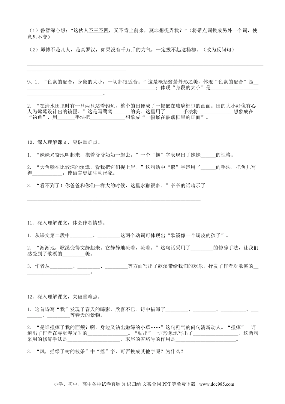 1、选择下列句子中所使用的修辞手法。(比喻、拟人、对仗、反问)1.于是渔火和灯标,都像惊醒了一般,在水面上轻轻地摇曳。()2.就像一道道瀑布,凌空飞降;又像一匹匹素锦,从山上挂起。()3.这不是伟大的奇观吗?()4.两个黄鹂鸣翠柳,一行白鹭上青天。()5.寂静笼罩着这座水上城市,古老的威尼斯又沉沉地入睡了。()6.走了许久,远远地望见了一条迂回的明如玻璃的带子——河!()2、挑出下列句子中的比喻句()。A、那沉甸甸压弯枝条的海棠果,个个都比市场上买来的大。B、最壮观的要数爷爷窗檐下的马蜂窝了,好像倒垂的一只莲蓬。C、当我的竿头触到蜂窝的一刹那,好像听到爷爷在屋内呼叫。D、只见一只马蜂径直而凶猛地朝我扑来,好像一架燃料耗尽、决心直撞的战斗机。E、低头再瞧瞧这只马蜂,微风吹着它,轻轻颤动,好似活了一般。3、“我的画”中除了课文里写到的事物,还可以画什么呢?试着写一写。我可以画__________________________________________。一群小动物在说悄悄话呢,请你把精彩的对话补充完整吧!小鸟:秋天是蓝色的,晴朗的天空碧蓝碧蓝。小牛:秋天是______________色的,____________________________。4、按要求,写句子。(1)黄山的松树挺秀坚劲。(改为拟人句)_____________________________________________(2)瀑布挂在岩壁上。(扩句)_____________________________________________(3)黄山的松树也许是吃石髓而长大起来的吧?(改为陈述句)小学、初中、高中各种试卷真题知识归纳文案合同PPT等免费下载www.doc985.com(4)如果这株松树长在悬崖旁边,一面靠近岩壁,一面向着空中,那么它的枝条就全部向空中生长。(用带点的词造句)5、用加划线的字造句。(1)宽阔的海滩,顿时安静下来。(2)“和平女神像”如一位纯情少女,展开天使般美丽的翅膀,在放飞圣洁的白鸽。6、按要求改写下列句子。(1)这个仪式你难以回避。(改为否定句)(2)老师解释说:“梦里飞行,说明你们是在长身体呀。”(改为间接引语)(3)荷叶上的露珠晶莹透亮。(改为比喻句)7、按要求改写句子。(1)在我满头大汗的时候,有一双眼睛看着我。(扩句)(2)你能有勇气当众大声喊,难道就没有勇气让你的成绩好起来吗?(改为陈述句)(3)巍巍群山盖满了白雪。(改为拟人句)(4)我不顾一切地大声喊道:“老师,我的语文成绩不够好。”(改为第三人称转述句)8、按要求,写句子。小学、初中、高中各种试卷真题知识归纳文案合同PPT等免费下载www.doc985.com(1)鲁智深心想:“这伙人不三不四,又不肯上前来,莫非想捉弄我?”(将带点词换成另外一个词,使意思不变)(2)师傅不是凡人,是真罗汉,如果没有千万斤的力气,一定拔不起这杨柳。(改为反问句)9、1.“色素的配合,身段的大小,一切都很适合。”这是概括鹭鸶外形之美,体现“色素的配合”是_____________________________________________________;体现“身段的大小”是_________________________________________________。2.“在清水田里时有一只两只站着钓鱼,整个的田便成了一幅嵌在玻璃框里的画面。田的大小好像有心人为鹭鸶设计出的镜匣。”这是写鹭鸶_______的美。这里用了_______手法将______________想象成在“钓鱼”,用_______手法把______________想象成“一幅嵌在玻璃框里的画面”。10、深入理解课文,突破重难点。1.“妹妹兴奋地叫起来,拖着爷爷奶奶一起去。”一个“拖”字表现出了妹妹______的性格。2.“大鱼躲在比较深的溪潭,看我把它们捉上岸。”这句话中“躲”字运用了______的手法,把鱼儿写得____________,使语言更加生动形象。3.“看不到了!你爸爸和你们一样大的时候,这里水獭很多。”爷爷的话暗示了_____________________________________________________________________11、深入理解课文,体会作者情感。1.从课文第二段中_________、_________这两个动词可体现出“歌溪像一个调皮的孩子”。2.“渐渐地,歌溪变得文静起来。它静静地流着,流着。”这句话采用了_________的修辞手法,让我们感受到了歌溪的_________美。3.作者从_________、_________、_____...