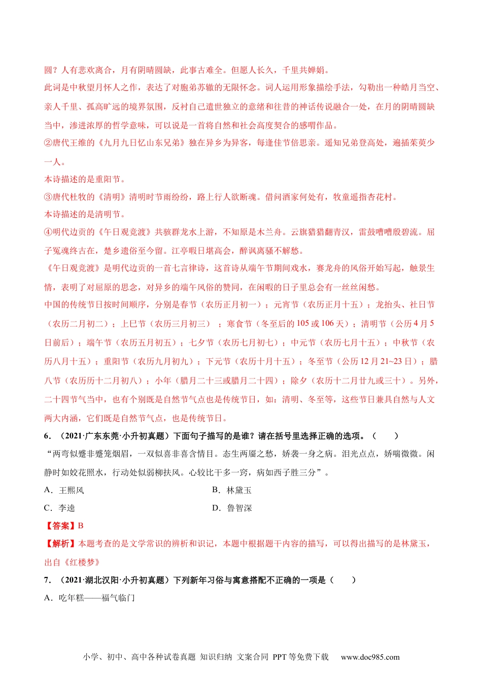 小学、初中、高中各种试卷真题知识归纳文案合同PPT等免费下载www.doc985.com专题15积累与运用——文学常识学校:___________姓名:___________班级:___________一、选择题1.(2020·福建秀屿·小升初真题)下列选项中有误的一项是()A.《繁星·春水》冰心中国B.《爱丽丝漫游奇境》刘易斯·卡罗尔英国C.《钢铁是怎样炼成的》高尔基俄国D.《鲁滨逊漂流记》笛福英国【答案】C【解析】本题考查的是作家作品。要求我们平时要加强对作家作品的识记。C项错误。《钢铁是怎样炼成的》尼古拉·奥斯特洛夫斯基,苏联著名作家。2.(2021·江苏·无锡市锡山区教师发展中心小升初真题)下列说法不正确的一项是()A.春节,是我国民间最隆重、最热闹的一个传统节日,有很多的习俗,如守岁寓意着辞旧岁迎新年。B.赵孟頫是元代著名的书法家,他的楷书整体上秀丽柔美,稳健大方。《玄秘塔碑》是其楷书代表作之一。C.《真理诞生于一百个问号之后》通过具体事例来说明观点,告诉我们只有不断发问,不懈探索,才能找到真理。D.习作时,我们可以把情感融入具体的人、事或景物之中,在叙述中自然而然地流露情感。【答案】B【解析】考查国学常识和课文内容理解。B项错误。《玄秘塔碑》是柳公权楷书代表作之一。3.(2020·福建秀屿·小升初真题)根据对联特点,与“千古文章书卷里”相对的下联是()A.春醉书香入多B.春晖又红万朵花C.百花消息雨声中D.百花争向艳阳红【答案】C【解析】本题考查对对联的理解。对联常识:上下联的字数必须相等,不能用重复的字;上联的末一字必须是仄声,下联的末一字必须是平声;上下联的句式必须一致(词类相当,结构相应);上下联的平仄要相对立,上联要用平声字的地方,下联就得用仄声字,反过来也一样(平:平声字;仄,仄声字,包括上、去、入三声的字);上下联意思可以相近或相反,可以只说一事,也不妨分说两事。本题题干“千古文章书卷里”,根据上下联的句式必须一致(词类相当,结构相应)可知,它的下联是“百花消息雨声中”。4.(2021·江苏·无锡市锡山区教师发展中心小升初真题)下列关于名著的介绍,不正确的一项是()A.《鲁滨逊漂流记》被誉为英国第一部真正意义上的小说,它的作者是丹尼尔·笛福。小学、初中、高中各种试卷真题知识归纳文案合同PPT等免费下载www.doc985.comB.《骑鹅旅行记》讲述了小男孩尼尔斯在旅行中逐渐改正缺点,变成了一个勇敢善良、乐于助人的好孩子。C.《爱丽丝漫游奇境》描绘了小女孩爱丽丝掉进了兔子洞,展开了一段如梦如幻的旅程。D.《汤姆·索亚历险记》塑造了一个调皮又有正义感的小男孩形象,包含着作者对自由的向往和对社会的赞美。【答案】D【解析】本题考查文章内容理解。《鲁滨逊漂流记》是英国作家丹尼尔·笛福的一部长篇小说。讲述的是鲁滨逊在一次航海时,因船难而漂流到一个海岛上,而后在海岛上生活。在第二十四年救下野人星期五,并帮助被水手抛弃的船长夺回船只,时隔三十五年重新回到英国的故事。《骑鹅旅行记》是瑞典女作家塞尔玛·拉格洛芙的代表作,也是世界上唯一一部获得诺贝尔文学奖的童话作品。讲一个不爱学习、喜欢恶作剧的顽皮孩子尼尔斯,因为一次捉弄小妖精,而被小妖精用魔法变成了一个小人。他骑在他家的大白鹅背上,跟着一群大雁出发作长途旅行。通过这次奇异的旅行,尼尔斯增长了很多见识,结识了许多朋友,也碰到过好几个凶恶阴险的敌人。他在种种困难和危险中受到了锻炼,最后尼尔斯回到了家中,恢复原形,变成了一个好孩子。《爱丽丝漫游奇境》主要讲述了一个非常爱幻想的英国女孩儿爱丽丝,为了追逐一只揣着怀表,会说话的兔子而不慎掉入了兔子洞。这个兔子洞当中有一个非常神奇的国度,爱丽丝在这个国度里面经历了一系列的奇幻冒险故事。《汤姆·索亚历险记》小说的故事发生在19世纪上半世纪美国密西西比河畔的一个普通小镇上。主人公汤姆·索亚天真活泼、敢于探险、追求自由,不堪忍受束缚个性、枯燥乏味的生活,幻想干一番英雄事业。小说的时代在南北战争前,写的虽是圣彼得堡小镇,但该镇某种程度上可以说是当时美国社会的缩影。小说通过主人公的冒险经历,对美国虚...