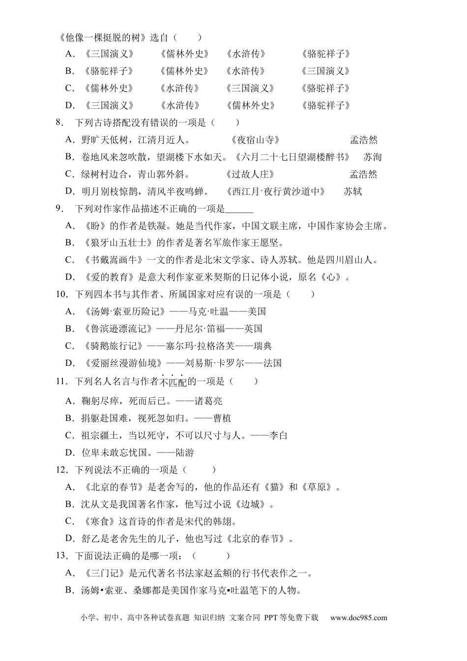 小学、初中、高中各种试卷真题知识归纳文案合同PPT等免费下载www.doc985.com小升初语文易错知识点专项集训文学常识1.回忆你所读的名著,判断下列故事情节与人物、出处不对应的一项()A.三打白骨精——孙悟空——《西游记》B.煮酒论英雄——曹操——《三国演义》C.初进荣国府——林黛玉——《红楼梦》D.风雪山神庙——武松——《水浒传》2.下列名句与作者搭配不正确的一项是()A.鞠躬尽瘁,死而后已。——刘备B.祖宗疆土,当以死守,不可以尺寸与人。——李纲C.位卑未敢忘忧国。——陆游D.捐躯赴国难,视死忽如归。——曹植3.下列书法家与他们的作品搭配,不正确的一项是()A.王羲之——《兰亭集序》B.颜真卿——《多宝塔碑》C.柳公权——《玄秘塔碑》D.欧阳询——《赤壁怀古》4.下列诗句与其作者和出处不相符的一项是()A.胜日寻芳泗水滨,无边光景一时新。(朱熹《春日》)B.黑云翻墨未遮山,白雨跳珠乱入船。(苏轼《六月二十七日望湖楼醉书》)C.少小离家老大回,乡音无改鬓毛衰。(贺知章《回乡偶书》)D.南朝四百八十寺,多少楼台烟雨中。(杜甫《江南春》)5.下列说法中不正确的一项是()A.鲁迅,原名周树人,浙江绍兴人。B.《童年》是苏联作家高尔基的小说。C.俗话说,烂笔头不如好记性。D.“以鞭代马”是京剧中的常用表现手段。6.对文章理解有误的选项是()A.《七律·长征》概括地表现了长征中红军战士不畏艰险,藐视一切困难的精神和气概。B.《竹节人》以童年时的玩具——竹节人为线索,展现了童年的快乐生活。C.《桥》是一篇小说,主人公老汉是一个舍己为人、忠于职守的老共产党员。D.苏轼的《西江月·夜行黄沙道中》是一首词,“西江月”是词牌名。7.下列括号中应该填的名著是()《草船借箭》选自()《景阳冈》选自()《两茎灯草》选自()小学、初中、高中各种试卷真题知识归纳文案合同PPT等免费下载www.doc985.com《他像一棵挺脱的树》选自()A.《三国演义》《儒林外史》《水浒传》《骆驼祥子》B.《骆驼祥子》《儒林外史》《水浒传》《三国演义》C.《儒林外史》《水浒传》《三国演义》《骆驼祥子》D.《三国演义》《水浒传》《儒林外史》《骆驼祥子》8.下列古诗搭配没有错误的一项是()A.野旷天低树,江清月近人。《夜宿山寺》孟浩然B.卷地风来忽吹散,望湖楼下水如天。《六月二十七日望湖楼醉书》苏洵C.绿树村边合,青山郭外斜。《过故人庄》孟浩然D.明月别枝惊鹊,清风半夜鸣蝉。《西江月·夜行黄沙道中》苏轼9.下列对作家作品描述不正确的一项是______A.《盼》的作者是铁凝。她是当代作家,中国文联主席,中国作家协会主席。B.《狼牙山五壮士》的作者是著名军旅作家王愿坚。C.《书戴嵩画牛》一文的作者是北宋文学家、诗人苏轼。他是四川眉山人。D.《爱的教育》是意大利作家亚米契斯的日记体小说,原名《心》。10.下列四本书与其作者、所属国家对应有误的一项是()A.《汤姆·索亚历险记》——马克·吐温——美国B.《鲁滨逊漂流记》——丹尼尔·笛福——英国C.《骑鹅旅行记》——塞尔玛·拉格洛芙——瑞典D.《爱丽丝漫游仙境》——刘易斯·卡罗尔——法国11.下列名人名言与作者不匹配的一项是()A.鞠躬尽瘁,死而后已。——诸葛亮B.捐躯赴国难,视死忽如归。——曹植C.祖宗疆土,当以死守,不可以尺寸与人。——李白D.位卑未敢忘忧国。——陆游12.下列说法不正确的一项是()A.《北京的春节》是老舍写的,他的作品还有《猫》和《草原》。B.沈从文是我国著名作家,他写过小说《边城》。C.《寒食》这首诗的作者是宋代的韩翃。D.舒乙是老舍先生的儿子,他也写过《北京的春节》。13.下面说法正确的是哪一项:()A.《三门记》是元代著名书法家赵孟頫的行书代表作之一。B.汤姆•索亚、桑娜都是美国作家马克▪吐温笔下的人物。小学、初中、高中各种试卷真题知识归纳文案合同PPT等免费下载www.doc985.comC.“清平乐”“浣溪沙”“卜算子”既是词牌,也是词的题目。D.《诗经》是我国最早的诗歌总集,《釆薇》就是其中的一首。14.下列诗名、作者与朝代有误的一项是()A.《过故人庄》——孟...