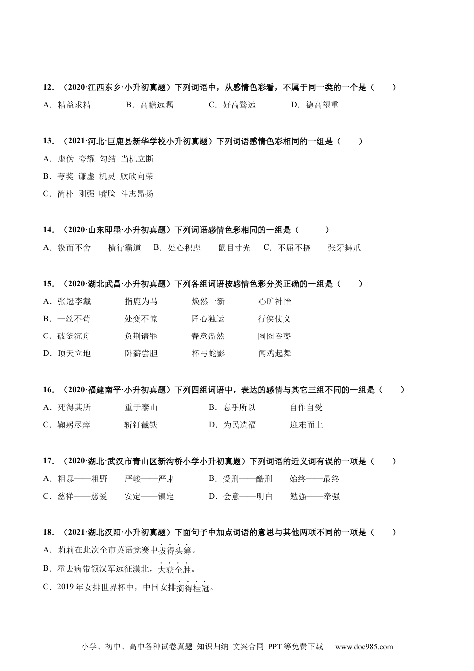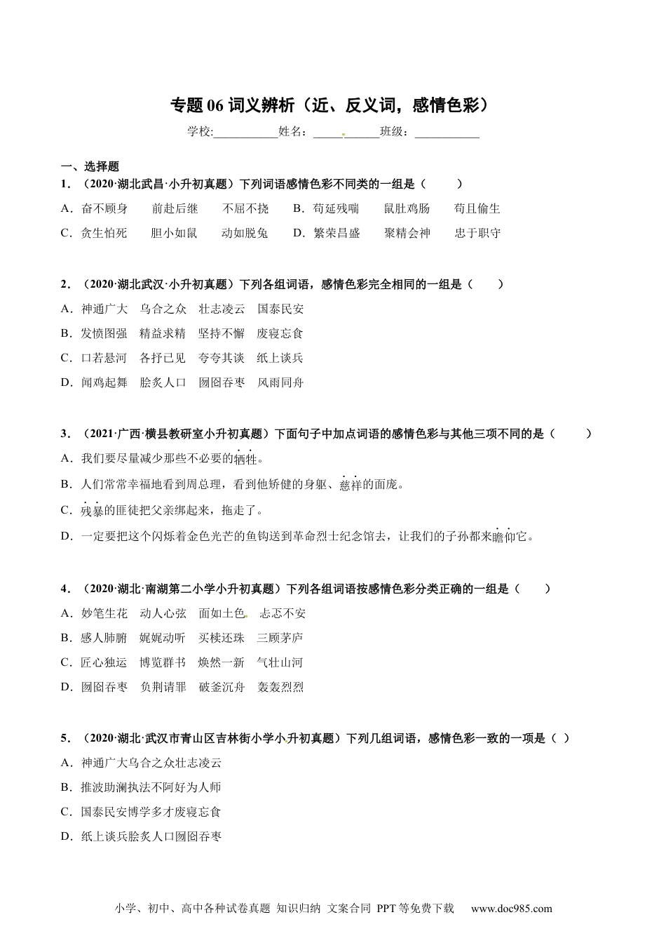 小学、初中、高中各种试卷真题知识归纳文案合同PPT等免费下载www.doc985.com专题06词义辨析(近、反义词,感情色彩)学校:___________姓名:___________班级:___________一、选择题1.(2020·湖北武昌·小升初真题)下列词语感情色彩不同类的一组是()A.奋不顾身前赴后继不屈不挠B.苟延残喘鼠肚鸡肠苟且偷生C.贪生怕死胆小如鼠动如脱兔D.繁荣昌盛聚精会神忠于职守2.(2020·湖北武汉·小升初真题)下列各组词语,感情色彩完全相同的一组是()A.神通广大乌合之众壮志凌云国泰民安B.发愤图强精益求精坚持不懈废寝忘食C.口若悬河各抒已见夸夸其谈纸上谈兵D.闻鸡起舞脍炙人口囫囵吞枣风雨同舟3.(2021·广西·横县教研室小升初真题)下面句子中加点词语的感情色彩与其他三项不同的是()A.我们要尽量减少那些不必要的牺牲。B.人们常常幸福地看到周总理,看到他矫健的身躯、慈祥的面庞。C.残暴的匪徒把父亲绑起来,拖走了。D.一定要把这个闪烁着金色光芒的鱼钩送到革命烈士纪念馆去,让我们的子孙都来瞻仰它。4.(2020·湖北·南湖第二小学小升初真题)下列各组词语按感情色彩分类正确的一组是()A.妙笔生花动人心弦面如土色忐忑不安B.感人肺腑娓娓动听买椟还珠三顾茅庐C.匠心独运博览群书焕然一新气壮山河D.囫囵吞枣负荆请罪破釜沉舟轰轰烈烈5.(2020·湖北·武汉市青山区吉林街小学小升初真题)下列几组词语,感情色彩一致的一项是()A.神通广大乌合之众壮志凌云B.推波助澜执法不阿好为人师C.国泰民安博学多才废寝忘食D.纸上谈兵脍炙人口囫囵吞枣小学、初中、高中各种试卷真题知识归纳文案合同PPT等免费下载www.doc985.com6.(2021·辽宁绥中·小升初真题)请选出感情色彩与“顽强——顽固”相同的一项是()A.灵巧——灵活B.独断——武断C.团结——勾结D.骄傲——自豪7.(2021·安徽包河·小升初真题)下列词语感情色彩不完全相同的一组是()A.口蜜腹剑拾金不昧德高望重功成名就B.胸无点墨笑里藏刀爱慕虚荣一意孤行C.光明磊落如雷贯耳忠于职守万古长存D.外强中干一窍不通纸上谈兵东施效颦8.(2021·四川简阳·小升初真题)下面各组词语中感情色彩相同的一组是()A.精益求精人云亦云一视同仁B.坚强不屈投机取巧朴实敦厚C.挑拨离间忠心耿耿见微知著D.不折不挠勇往直前锲而不舍9.(2020·山东·聊城市茌平区教育和体育局教研室小升初真题)句子中加点词语与例句中加点词语的感情色彩相同的一句是()例句:1937年7月7日深夜,星光暗淡,一支全副武装的日本军队,偷偷地向卢沟桥摸来。A.在我们心目中,您是天使,您是大树,您是海洋。B.万物入水,必能荡涤污垢,它好像善施教化。C.在硝烟和火光中,日寇被杀得哭爹喊娘,狼狈而逃。10.(2020·江西浔阳·小升初真题)下面各组词语中感情色彩相同的一组是()A.勇往直前见微知著人云亦云B.坚强不屈挑拔离间一视同仁C.锲而不舍投机取巧朴实敦厚D.不折不挠精益求精忠心耿耿11.(2021·贵州黔南·小升初真题)下列词语感情色彩完全相同的一项是()A.虚伪夸耀分裂当机立断B.简朴武断刚强锲而不舍C.优雅谦虚机灵落落大方D.机智宽容和善夸夸其谈[来源:学科网]小学、初中、高中各种试卷真题知识归纳文案合同PPT等免费下载www.doc985.com12.(2020·江西东乡·小升初真题)下列词语中,从感情色彩看,不属于同一类的一个是()A.精益求精B.高瞻远瞩C.好高骛远D.德高望重13.(2021·河北·巨鹿县新华学校小升初真题)下列词语感情色彩相同的一组是()A.虚伪夸耀勾结当机立断B.夸奖谦虚机灵欣欣向荣C.简朴刚强嘴脸斗志昂扬14.(2020·山东即墨·小升初真题)下列词语感情色彩相同的一组是()A.锲而不舍横行霸道B.处心积虑鼠目寸光C.不屈不挠张牙舞爪15.(2020·湖北武昌·小升初真题)下列各组词语按感情色彩分类正确的一组是()A.张冠李戴指鹿为马焕然一新心旷神怡B.一丝不苟处变不惊匠心独运行侠仗义C.破釜沉舟负荆请罪春意盎然囫囵吞枣D.顶天立地卧薪尝胆杯弓蛇影闻鸡起舞16.(2020·福建南平·小升初真题)下列四组词语中,表达的感情与其它三组不同的一组...