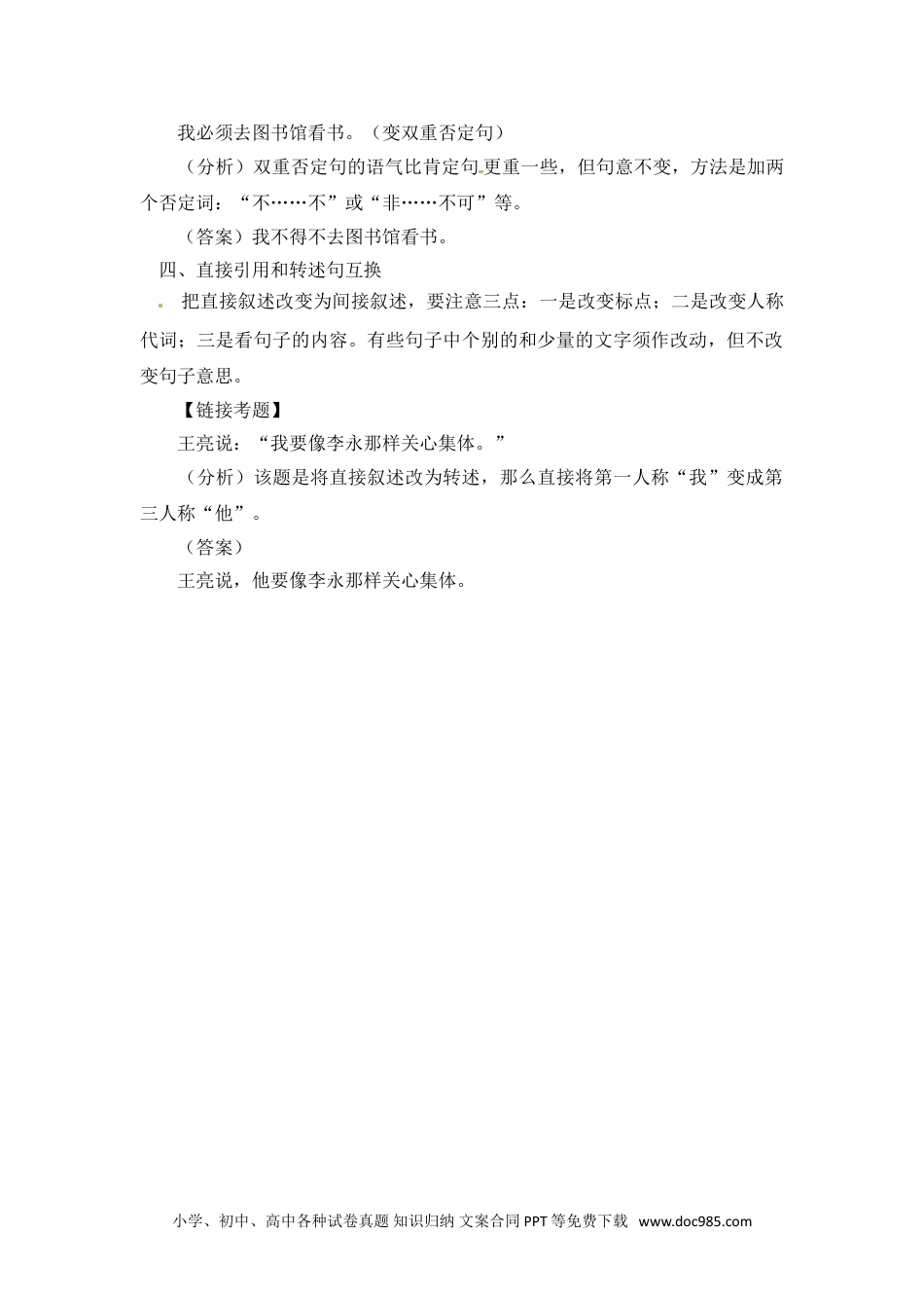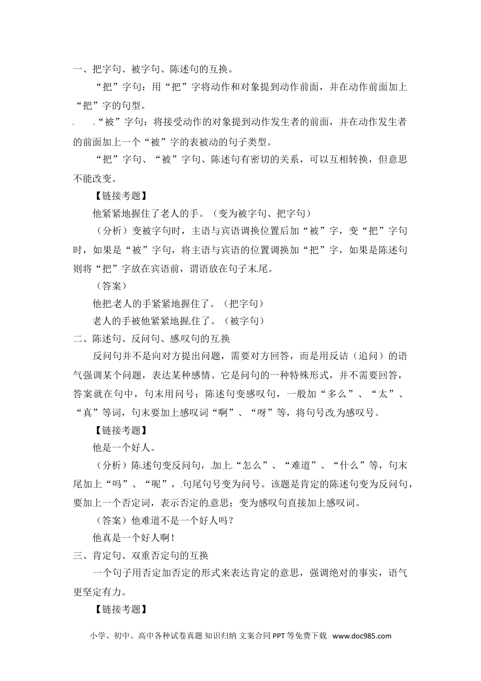 一、把字句、被字句、陈述句的互换。“把”字句:用“把”字将动作和对象提到动作前面,并在动作前面加上“把”字的句型。“被”字句:将接受动作的对象提到动作发生者的前面,并在动作发生者的前面加上一个“被”字的表被动的句子类型。“把”字句、“被”字句、陈述句有密切的关系,可以互相转换,但意思不能改变。[来源:学科网]【链接考题】[来源:Zxxk.Com]他紧紧地握住了老人的手。(变为被字句、把字句)(分析)变被字句时,主语与宾语调换位置后加“被”字,变“把”字句时,如果是“被”字句,将主语与宾语的位置调换加“把”字,如果是陈述句则将“把”字放在宾语前,谓语放在句子末尾。(答案)他把老人的手紧紧地握住了。(把字句)老人的手被他紧紧地握住了。(被字句)二、陈述句、反问句、感叹句的互换反问句并不是向对方提出问题,需要对方回答,而是用反诘(追问)的语气强调某个问题,表达某种感情。它是问句的一种特殊形式,并不需要回答,答案就在句中,句末用问号;陈述句变感叹句,一般加“多么”、“太”、“真”等词,句末要加上感叹词“啊”、“呀”等,将句号改为感叹号。【链接考题】他是一个好人。(分析)陈述句变反问句,加上“怎么”、“难道”、“什么”等,句末尾加上“吗”、“呢”,句尾句号变为问号。该题是肯定的陈述句变为反问句,要加上一个否定词,表示否定的意思;变为感叹句直接加上感叹词。(答案)他难道不是一个好人吗?他真是一个好人啊!三、肯定句、双重否定句的互换一个句子用否定加否定的形式来表达肯定的意思,强调绝对的事实,语气更坚定有力。【链接考题】小学、初中、高中各种试卷真题知识归纳文案合同PPT等免费下载www.doc985.com我必须去图书馆看书。(变双重否定句)(分析)双重否定句的语气比肯定句更重一些,但句意不变,方法是加两个否定词:“不……不”或“非……不可”等。[来源:学科网ZXXK](答案)我不得不去图书馆看书。[来源:Z§xx§k.Com]四、直接引用和转述句互换把直接叙述改变为间接叙述,要注意三点:一是改变标点;二是改变人称代词;三是看句子的内容。有些句子中个别的和少量的文字须作改动,但不改变句子意思。【链接考题】[来源:学科网]王亮说:“我要像李永那样关心集体。”(分析)该题是将直接叙述改为转述,那么直接将第一人称“我”变成第三人称“他”。(答案)王亮说,他要像李永那样关心集体。小学、初中、高中各种试卷真题知识归纳文案合同PPT等免费下载www.doc985.com