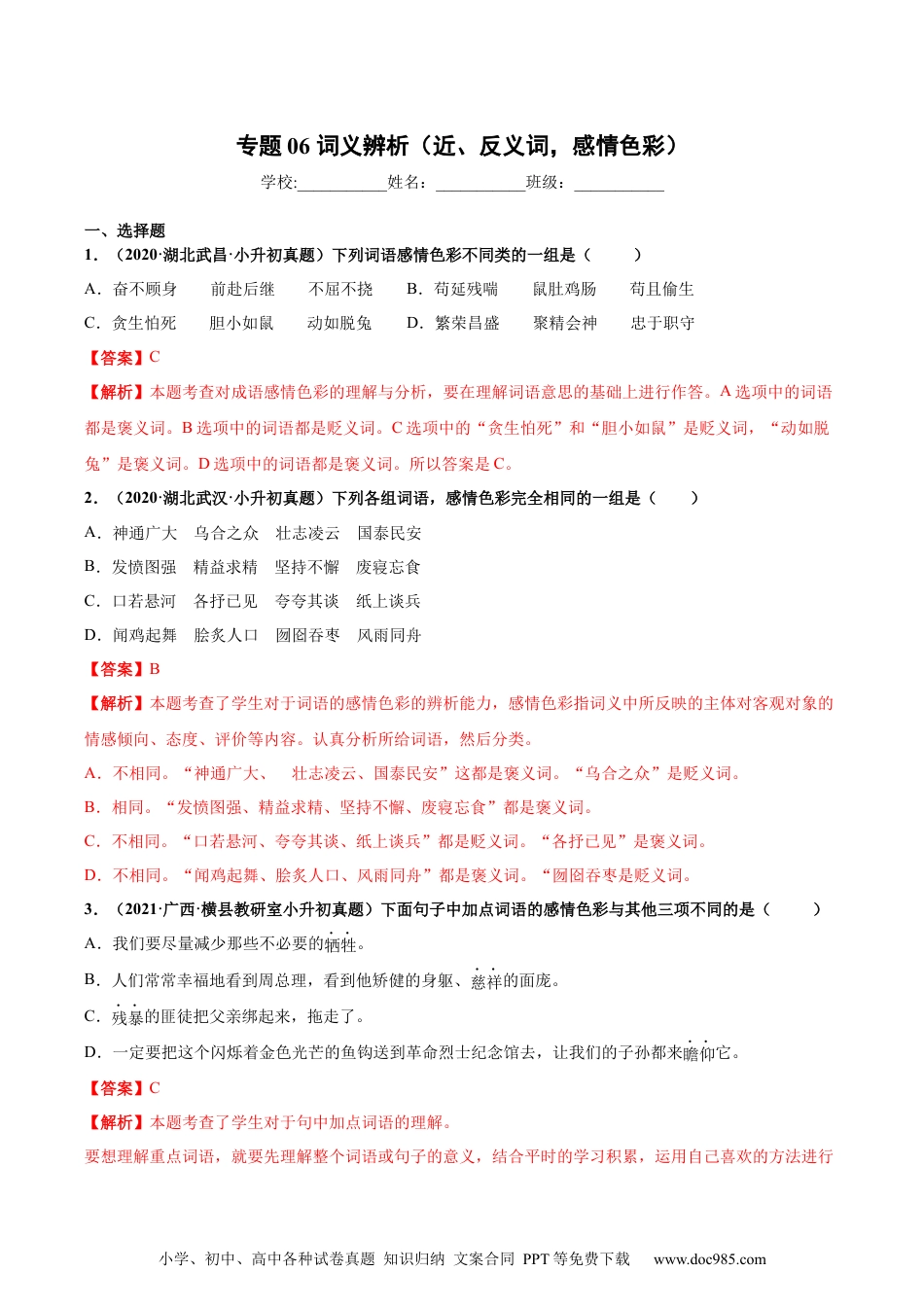 小学、初中、高中各种试卷真题知识归纳文案合同PPT等免费下载www.doc985.com专题06词义辨析(近、反义词,感情色彩)学校:___________姓名:___________班级:___________一、选择题1.(2020·湖北武昌·小升初真题)下列词语感情色彩不同类的一组是()A.奋不顾身前赴后继不屈不挠B.苟延残喘鼠肚鸡肠苟且偷生C.贪生怕死胆小如鼠动如脱兔D.繁荣昌盛聚精会神忠于职守【答案】C【解析】本题考查对成语感情色彩的理解与分析,要在理解词语意思的基础上进行作答。A选项中的词语都是褒义词。B选项中的词语都是贬义词。C选项中的“贪生怕死”和“胆小如鼠”是贬义词,“动如脱兔”是褒义词。D选项中的词语都是褒义词。所以答案是C。2.(2020·湖北武汉·小升初真题)下列各组词语,感情色彩完全相同的一组是()A.神通广大乌合之众壮志凌云国泰民安B.发愤图强精益求精坚持不懈废寝忘食C.口若悬河各抒已见夸夸其谈纸上谈兵D.闻鸡起舞脍炙人口囫囵吞枣风雨同舟【答案】B【解析】本题考查了学生对于词语的感情色彩的辨析能力,感情色彩指词义中所反映的主体对客观对象的情感倾向、态度、评价等内容。认真分析所给词语,然后分类。A.不相同。“神通广大、壮志凌云、国泰民安”这都是褒义词。“乌合之众”是贬义词。B.相同。“发愤图强、精益求精、坚持不懈、废寝忘食”都是褒义词。C.不相同。“口若悬河、夸夸其谈、纸上谈兵”都是贬义词。“各抒已见”是褒义词。D.不相同。“闻鸡起舞、脍炙人口、风雨同舟”都是褒义词。“囫囵吞枣是贬义词。3.(2021·广西·横县教研室小升初真题)下面句子中加点词语的感情色彩与其他三项不同的是()A.我们要尽量减少那些不必要的牺牲。B.人们常常幸福地看到周总理,看到他矫健的身躯、慈祥的面庞。C.残暴的匪徒把父亲绑起来,拖走了。D.一定要把这个闪烁着金色光芒的鱼钩送到革命烈士纪念馆去,让我们的子孙都来瞻仰它。【答案】C【解析】本题考查了学生对于句中加点词语的理解。要想理解重点词语,就要先理解整个词语或句子的意义,结合平时的学习积累,运用自己喜欢的方法进行小学、初中、高中各种试卷真题知识归纳文案合同PPT等免费下载www.doc985.com理解辨析即可。牺牲:为正义事业舍弃自己的生命。是褒义词。慈祥:(老年人的态度、神色)和蔼安详。是褒义词。残暴:残忍凶恶。是贬义词。瞻仰:怀着敬意看。是褒义词。4.(2020·湖北·南湖第二小学小升初真题)下列各组词语按感情色彩分类正确的一组是()A.妙笔生花动人心弦面如土色忐忑不安B.感人肺腑娓娓动听买椟还珠三顾茅庐C.匠心独运博览群书焕然一新气壮山河D.囫囵吞枣负荆请罪破釜沉舟轰轰烈烈【答案】C【解析】本题考查对词语感情色彩的理解。妙笔生花:比喻杰出的写作才能。动人心弦:意思是形容事物或语言激动人心,也说动人心魄。面如土色:脸色跟土的颜色一样,没有血色。忐忑不安:忐忑:心神不定。心神极为不安。感人肺腑:使人内心深受感动。娓娓动听:话说得婉转生动,使人喜欢听。买椟还珠:原意是买来装珍珠的木匣退还了珍珠。比喻没有眼力,取舍不当。买椟还珠是一个贬义词,三顾茅庐:也说三顾草庐。汉末刘备三次到诸葛亮住的茅屋去邀请他出来帮助自己打天下,最后诸葛亮才答应出来。后喻指一再诚心地邀请。匠心独运:在文学、艺术等方面独创性地运用巧妙的心思。博览群书:博:广泛。广泛地阅读各种书。形容读书很多。焕然一新:指改变陈旧的面貌,呈现出崭新的样子。引证解释改变旧面貌,出现崭新的气象。气壮山河:形容气概像高山大河那样雄伟豪迈。囫囵吞枣:把枣子整个吞下去。比喻读书等不经消化理解,笼统接受。负荆请罪:该成语意思是背着剂杖,表示服罪,向当事人请罪,用于赔礼道歉的场合。在句中一般用连动式;作谓语、定语;形容主动向人认错、道歉,自请严厉责罚。破釜沉舟:该成语指把饭锅打破,把渡船凿沉,比喻不留退路,做事果决。轰轰烈烈:形容事业的兴旺。也形容声势浩大,气魄宏伟。5.(2020·湖北·武汉市青山区吉林街小学小升初真题)下列几组词语,感情色彩一致的一项是()小学、初中、高中各种试卷真题知识归纳文案合同...
