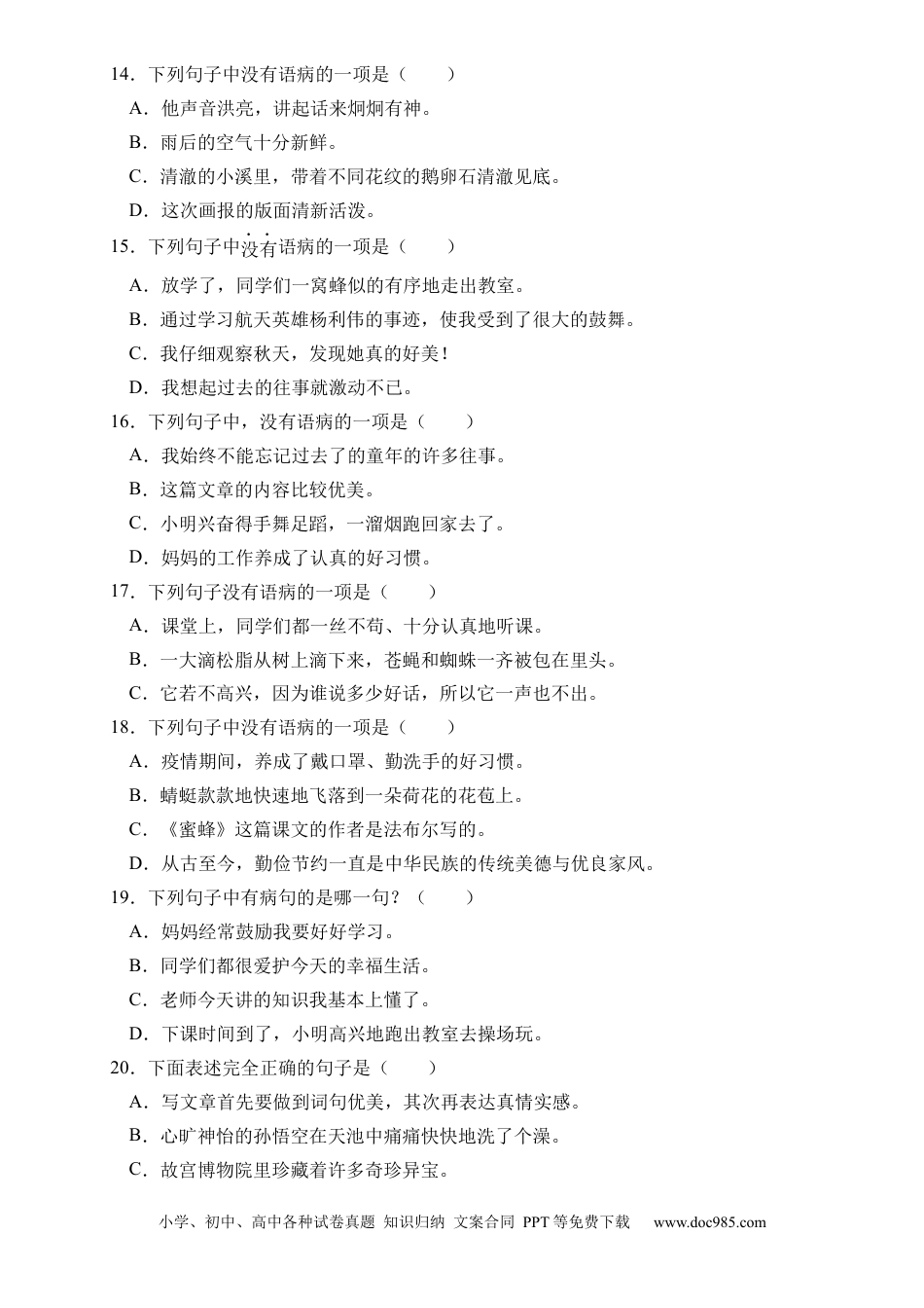 小学、初中、高中各种试卷真题知识归纳文案合同PPT等免费下载www.doc985.com小升初语文易错知识点专项集训病句辨析1.下列各句中没有语病的一项是()A.我用了整整一个小时左右,才完成这篇作文。B.张老师的演讲,对我启发很大。C.全国人民和广大青年,都要认真学习和了解祖国的历史。D.考试前能否认真做好复习,是考试取得优秀成绩的关键。2.下列句子没有语病的一项是()A.郝副营长的革命精神时常浮现在我的眼前。B.太阳系中大概唯一可能存在生命的行星是火星。C.为了防止不被老师发现,我们利用课桌的裂缝玩竹节人。D.因为盲姑娘爱音乐,懂音乐,所以贝多芬又给她弹了一首曲子。3.下面句子中没有语病的一项是()A.中国人口是世界上最多的国家。B.同学们要树立爱护公物的良好习惯。C.我国有世界上没有的万里长城。D.白鹭是一首精巧的诗。4.下面句子中,表达正确的是()A.法布尔是法国著名的昆虫学家。B.我的书包里放着课本、笔、直尺等文具。C.盛开的菊花开了,我觉得非常美丽。D.因为奶奶年纪大了,所以坚持做很多家务劳动。5.下列句子没有语病的是()A.通过不懈的努力,他的考试成绩有了明显增加。B.越不许我动,我越想动,但是我又不敢,因此很痛苦。C.我估计,明天一定是一个艳阳天。D.经研究决定,学校向全校师生发出“光盘行动”。6.下面句子中没有语病的一句是()A.小芳很爱学习,每次都是她首先第一个举手发言。B.这件事因为处理得不公正,所以大家心里不服。C.新冠疫情初期,我国口罩的生产,一度供不应求。D.屠呦呦在提取青蒿素方面花了很多的心血。小学、初中、高中各种试卷真题知识归纳文案合同PPT等免费下载www.doc985.com7.下列句子中没有语病的一项是()A.张老师严格地批评了小强。B.奶奶常常给我讲她小时候的往事。C.这本书的内容和插图都很精美。D.蔚蓝的大海是海鸥的乐园。8.下列句子中没有语病的一项是()A.见到我们,立刻拨转马头,欢呼着,飞驰着,在汽车左右与前方引路。B.我真爱这一篇好的故事,趁碎影还在,我要追回他,完成他,留下他。C.人们不能可以指望地球被破坏以后再移居到别的星球上去。D.我和同桌相视一笑,因为两手空空,所以心满意足,轻手轻脚地溜了。9.下列句子中存在语病的一项是()A.具有认真、踏实的学习态度,是我们学习进步的关键。B.各地中小学建立和完善了校园预防传染病的工作机制。C.通过大量阅读课外书籍,让我们学习到了新的知识开阔了眼界。D.我国的艺术珍品有许多,莫高窟中精美的壁画就是其中的一个。10.下面句子没有语病的一项是()A.南京是一座适宜人们居住的好季节。B.语文学习就应该囫囵吞枣,知识越积越多。C.寒冬腊月,我们必须戴上帽子和衣服。D.李明不但学习好,而且身体也好。11.下面句子没有语病的一项是()A.学校组织了丰富多彩的传承中华传统美德。B.我漫步在田野上,呼吸着新鲜的空气和温暖的阳光。C.新年的钟声敲响了,家家户户都在祈盼风调雨顺,国泰民安。D.有了港珠澳大桥,驾车从香港到珠海、澳门的时间大约1小时左右。12.下列句子中,没有语病的一项是()A.经过校长在开学仪式上的讲话,对同学们的启发很大。B.在我国,未成年人的合法权益随时都受国家法律的保护。C.老师告诉我们,好成绩的取得,跟是否勤学苦练有很大的关系。D.看着四年(3)班同学的精彩表演,我异口同声地说:“精彩极了!”13.下列句子中没有语病的一项是()A.这便是我童年唯一的独一无二的玩具了。B.我们只看到了大榕树,没看到鸟的活泼身影和动听声音。C.冀中平原上的人民虽然坚持了生产,但是有力地打击了敌人。D.阅读丰富了我的词汇积累,大大扩展了我的想象力。小学、初中、高中各种试卷真题知识归纳文案合同PPT等免费下载www.doc985.com14.下列句子中没有语病的一项是()A.他声音洪亮,讲起话来炯炯有神。B.雨后的空气十分新鲜。C.清澈的小溪里,带着不同花纹的鹅卵石清澈见底。D.这次画报的版面清新活泼。15.下列句子中没有语病的一项是()A.放学了,同学们一窝蜂似的有序地走出教室。B.通过学习航天英雄杨利伟的事迹,使我受到了很大...