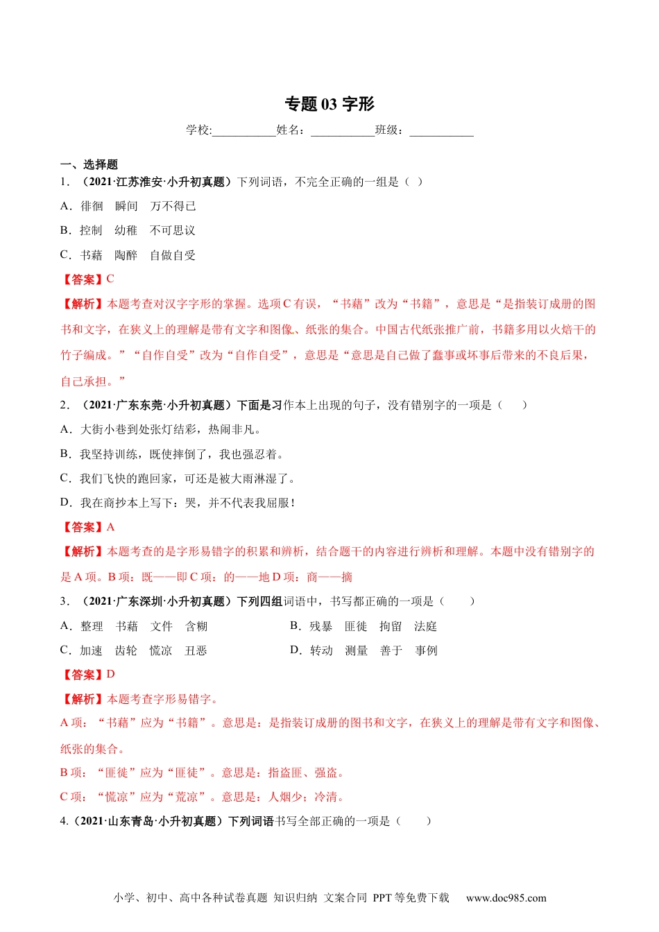 小学、初中、高中各种试卷真题知识归纳文案合同PPT等免费下载www.doc985.com专题03字形学校:___________姓名:___________班级:___________一、选择题1.(2021·江苏淮安·小升初真题)下列词语,不完全正确的一组是()A.徘徊瞬间万不得已B.控制幼稚不可思议C.书藉陶醉自做自受【答案】C【解析】本题考查对汉字字形的掌握。选项C有误,“书藉”改为“书籍”,意思是“是指装订成册的图书和文字,在狭义上的理解是带有文字和图像、纸张的集合。中国古代纸张推广前,书籍多用以火焙干的竹子编成。”“自作自受”改为“自作自受”,意思是“意思是自己做了蠢事或坏事后带来的不良后果,自己承担。”2.(2021·广东东莞·小升初真题)下面是习作本上出现的句子,没有错别字的一项是()A.大街小巷到处张灯结彩,热闹非凡。[来源:Z.xx.k.Com]B.我坚持训练,既使摔倒了,我也强忍着。C.我们飞快的跑回家,可还是被大雨淋湿了。D.我在商抄本上写下:哭,并不代表我屈服!【答案】A【解析】本题考查的是字形易错字的积累和辨析,结合题干的内容进行辨析和理解。本题中没有错别字的是A项。B项:既——即C项:的——地D项:商——摘3.(2021·广东深圳·小升初真题)下列四组词语中,书写都正确的一项是()A.整理书藉文件含糊B.残暴匪徙拘留法庭C.加速齿轮慌凉丑恶D.转动测量善于事例【答案】D【解析】本题考查字形易错字。A项:“书藉”应为“书籍”。意思是:是指装订成册的图书和文字,在狭义上的理解是带有文字和图像、纸张的集合。B项:“匪徙”应为“匪徒”。意思是:指盗匪、强盗。C项:“慌凉”应为“荒凉”。意思是:人烟少;冷清。4.(2021·山东青岛·小升初真题)下列词语书写全部正确的一项是()小学、初中、高中各种试卷真题知识归纳文案合同PPT等免费下载www.doc985.comA.与世隔绝截然不同念念刀刀独出心裁B.悬灯结彩喜出望外无济于事锲而不舍C.荒芜人烟热泪盈眶全神惯注浑身肿胀D.不可思议天崖海角滔滔不绝蔫知非福【答案】B【解析】本题考查字形辨析。所选词语均是生活中常用又极易出错的词语,解答此题要注意平时正确练写,尤其是同音字和形似字。A.有误,“念念刀刀”的“刀刀”应为“叨叨”,指说话罗嗦,不停地念叨,是俗语,不属于成语,常形容女人的嘴说个不停。B.选项正确。C.有误,“荒芜人烟”的“芜”应为“无”,指十分荒凉,没有人家;“全神惯注”的“惯”应为“贯”,指全副精神高度集中。D.有误,“天崖海角”的“崖”应为“涯”,指天涯海角;“蔫知非福”的“蔫”应为“焉”,比喻一时虽然受到损失,也许反而因此能得到好处。5.(2021·安徽包河·小升初真题)下列题目中,全部正确的一组是()A.字音:鞭策(biān)蕴藏(yùn)抡起(lǔn)B.字形:恍然大悟微风凛凛司空见惯C.字义:过犹不及(及:达到)自愧弗如(弗:不)不以为然(然:这样)D.喻义:孺子牛——无私奉献白眼狼——忘恩负义寄生虫——不劳而获【答案】D【解析】本题主要考查字音、字形、字义、喻义,根据要求,认真审题。A.错误。“抡起”的“抡”读音为lūn。B.错误。“微风凛凛”改为“威风凛凛”。C.错误。不以为然:指不认为是对的。表示不同意或否定。然:是,对。D.正确。孺子牛比喻兢兢业业、无私奉献的人、白眼狼:比喻忘恩负义的人、寄生虫比喻依附别人、不劳而获的人6.(2021·山东济南·小升初真题)下列词语书写完全正确的一项是()A.天籁之音行云流水笔走龙蛇翻箱倒柜B.高山流水轻歌曼舞画龙点睛别出心栽C.余音绕梁巧夺天功妙笔生花焦躁不安D.黄钟大吕惟妙惟肖栩栩如生精兵减政小学、初中、高中各种试卷真题知识归纳文案合同PPT等免费下载www.doc985.com【答案】A【解析】本题考查字形辨析。错误的更正如下:B别出心栽——别出心裁;C巧夺天功——巧夺天工;D精兵减政——精兵简政7.(2021·河北·巨鹿县新华学校小升初真题)选出下列句子中没有错别字的一项(_____)A.走出门,就与徽风撞了个满怀,风中含着露水和栀子花的气息。B.我目光追随着爬行的小虫,作了一次奇异的游厉。C.我对这两个母亲怀着同样崇高的敬意和同...
