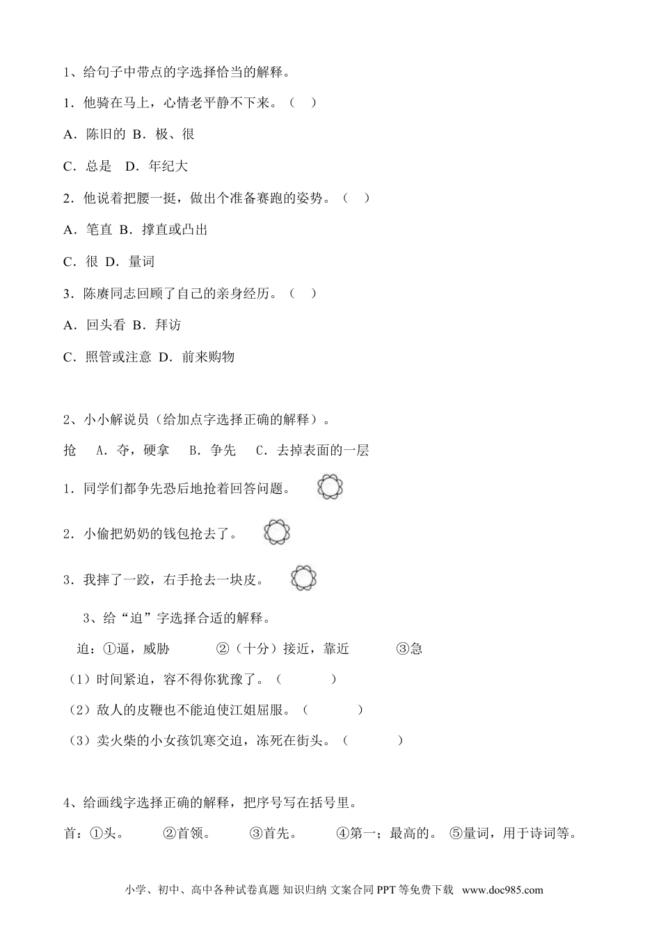 1、给句子中带点的字选择恰当的解释。1.他骑在马上,心情老平静不下来。()A.陈旧的B.极、很C.总是D.年纪大2.他说着把腰一挺,做出个准备赛跑的姿势。()A.笔直B.撑直或凸出C.很D.量词3.陈赓同志回顾了自己的亲身经历。()A.回头看B.拜访C.照管或注意D.前来购物2、小小解说员(给加点字选择正确的解释)。抢A.夺,硬拿B.争先C.去掉表面的一层1.同学们都争先恐后地抢着回答问题。2.小偷把奶奶的钱包抢去了。3.我摔了一跤,右手抢去一块皮。3、给“迫”字选择合适的解释。迫:①逼,威胁②(十分)接近,靠近③急(1)时间紧迫,容不得你犹豫了。()(2)敌人的皮鞭也不能迫使江姐屈服。()(3)卖火柴的小女孩饥寒交迫,冻死在街头。()4、给画线字选择正确的解释,把序号写在括号里。首:①头。②首领。③首先。④第一;最高的。⑤量词,用于诗词等。小学、初中、高中各种试卷真题知识归纳文案合同PPT等免费下载www.doc985.com(1)今天我们学了两首古诗。()(2)国旗班的叔叔们昂首挺胸走过金水桥。()(3)这种产品在国内不是首创。()(4)老师提出问题后,小明首先举起了手。()(5)北京是全国的首都。()5、选择正确的意思填在下面的括号里。(1)手:①人上肢前端能拿东西的部分②拿着③技能,本领④小巧易拿⑤做某种事情或擅长某种技能的人养花能手()举手发言()工作手册()真有一手()(2)失:①没有掌握住②改变常态③错过④遗失⑤找不着⑥错误大惊失色()坐失良机()失物招领()过失()(3)异:①有分别,不相同②奇异,特别③惊奇,奇怪④另外的,别的⑤分开奇花异草()异口同声()诧异()异乡()(4)绝:①断绝②完全没有了,穷尽③走不通的,没有出路的④独一无二的,没有人能赶上的⑤极,最⑥绝对斩尽杀绝()绝处逢生()络绎不绝()绝大多数()(5)行:①能干②走③可以④做不管是什么人,谁向我们指出都行。()我们的卫星运行在预定的轨道上。()小学、初中、高中各种试卷真题知识归纳文案合同PPT等免费下载www.doc985.com6、给画线的字选择正确的解释。益:1增加2利,好处3更(1)它们是有益健康的绿色蔬菜。()(2)适当的锻炼可以使得老年人延年益寿。()(3)人民军队在日益壮大。()(4)一本好书就像是孩子们的良师益友。()7、给“单”字选择正确的解释,把序号填在括号里。单:①独立的,孤独的;②项目种类多,结构不要复杂;③记载事物的纸片;④只,仅。1、单看这数不清的条石,一块有两三千重。()2、蟋蟀用来挖掘的工具是多么简单!()3、今晚折演出内容在节目单上写得明明白白。()4、有了大家的关心,小青再也不感到孤单了。()8、给带点的字选择合适的义项,把序号写在括号里深:①从上到下或从外到里的距离大②深奥③深刻;深入④感情厚;关系密切⑤颜色浓⑤距离开始的时间久⑦很1.陈赓曾经深情地谈起这样一件往事。()2.那是深秋的一天,太阳偏西了。()3.池面腾起一片又白又轻的热气,在深绿色的水藻上飘荡着。()4.阅读时注意从内容体会思想,可以加深对课文的理解。()5.老师对我说的话深信不疑。()6.许多科普书写得太深,我们看不懂。()9、选择带点字的意思(在括号里填上序号)。举:a、往上抬;b、提出c、全;d、推选举例()举世闻名()举目()小学、初中、高中各种试卷真题知识归纳文案合同PPT等免费下载www.doc985.com10、给加点字选择正确的解释。径:A.小路,亦指道路、方法;B.直,直捷了当;C.数学上指连接圆心和圆周的直线。(1)生气的明明没有理睬跟在身后的妈妈,径直向前跑去。()(2)在飓风的扫荡后,直径达3米的树被连根拔起。()(3)在学习上要脚踏实地,不可走捷径。()孤:A.幼年死去父亲或父母双忘;B.单独;C.古代帝王的自称;D.古同“辜”,辜负。(4)家人的关爱,朋友的关心,让我们不再孤独。()(5)汶川大地震让许多孩子失去了父母,成为孤儿。()(6)君名孤寡。()11、给加点的词语选择正确的解释,写在()里。断:A.分成两段或几段;B.断绝,隔绝;C.拦截;D.戒除;E.判断,决定。(1)拴牛的绳子断了,牛不知到哪儿去了。()(...