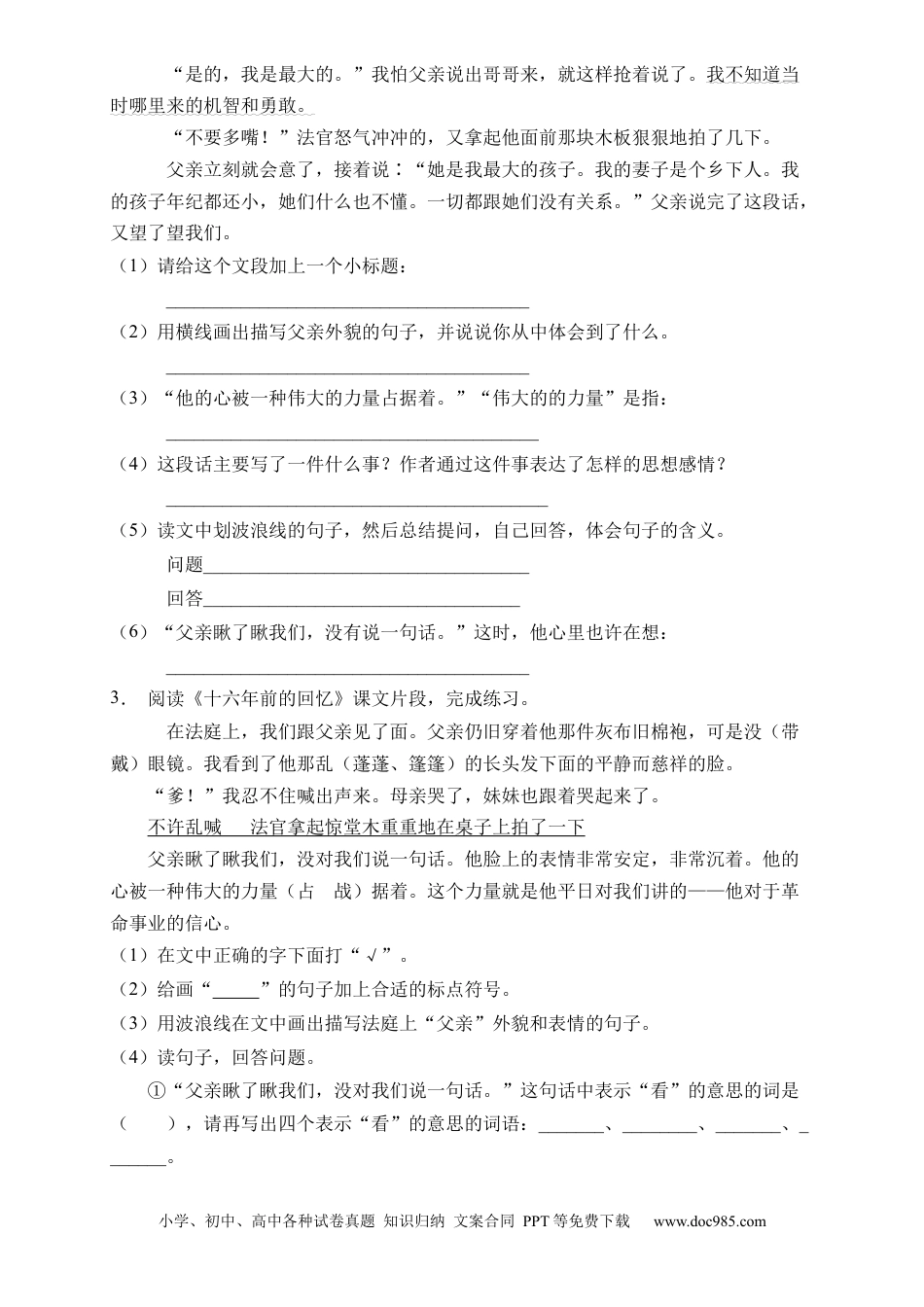 小学、初中、高中各种试卷真题知识归纳文案合同PPT等免费下载www.doc985.com小升初语文易错知识点专项集训课内阅读1.课内阅读。“下午吧,”母亲说,“下午,睡醒午觉再去。”“去,”母亲说,“下午,准去。”但这次怨我,怨我自己,我把午觉睡过了头。醒来时我看见母亲在洗衣服。要是那时就走还不晚。我看看天,还不晚。还去吗?去。走吧?洗完衣服。这一次不能原谅。我不知道那堆衣服要洗多久,可母亲应该知道。我蹲在她身边,看着她洗。我一声不吭,盼着。我想我再不离开半步,再不把觉睡过头。我想衣服一洗完我马上拉起她就走,决不许她再耽搁。我看着盆里的衣服和盆外的衣服,我看着太阳,看着光线,我一声不吭。看着盆里揉动的衣服和绽开的泡沫,我感觉到周围的光线渐渐暗下去,渐渐地凉下去沉郁下去,越来越远越来越缥缈,我一声不吭,忽然有点儿明白了。(1)“我一声不吭,盼着”,“我”盼着_____________。(2)选文中,作者借助蹲在母亲身边看着她洗衣服,以及____________、__________、____________的想法,真实自然地表达出自己当时盼的心情。(3)选文中,词语“一声不吭”先后出现了三次,作者这样写的目的是__________。(4)下列对画“”的语句理解不正确的一项是()A.这句话既交代了时间变化,又写出了“我”的心理感受。B.“光线渐渐暗下去”交代了天色渐晚,“凉下去”“沉郁下去”写出了随着希望一点点破灭,“我”的内心越来越惆怅。C.“越来越远越来越缥缈”更表现了“我”完全沉浸在伤心、失望之中。D.“忽然有点儿明白了”,“我”明白了母亲习惯如此,总是不能兑现对自己的承诺。2.课内阅读。十六年前的回忆(节选)法庭上,我们跟父亲见了面。父亲仍旧穿着他那件灰布旧棉袍,可是没戴眼镜。我看到了他那乱蓬蓬的长头发下面的平静而慈祥的脸。“爹!”我忍不住喊出声来。母亲哭了,妹妹也跟着哭起来了“不许乱喊!”法官拿起惊堂木重重地在桌子上拍了一下。父亲瞅了瞅我们,没对我们说一句话。他脸上的表情非常安定,非常沉着。他的心被一种伟大的力量占据着。这个力量就是他平日对我们讲的——他对于革命事业的信心。“这是我的妻子。”他指着母亲说。接着他又指了一下我和妹妹,“这是我的两个女孩子。”“她是你最大的孩子吗?”法官指着我问父亲。小学、初中、高中各种试卷真题知识归纳文案合同PPT等免费下载www.doc985.com“是的,我是最大的。”我怕父亲说出哥哥来,就这样抢着说了。我不知道当时哪里来的机智和勇敢。“不要多嘴!”法官怒气冲冲的,又拿起他面前那块木板狠狠地拍了几下。父亲立刻就会意了,接着说∶“她是我最大的孩子。我的妻子是个乡下人。我的孩子年纪都还小,她们什么也不懂。一切都跟她们没有关系。”父亲说完了这段话,又望了望我们。(1)请给这个文段加上一个小标题:_______________________________________(2)用横线画出描写父亲外貌的句子,并说说你从中体会到了什么。_______________________________________(3)“他的心被一种伟大的力量占据着。”“伟大的的力量”是指:________________________________________(4)这段话主要写了一件什么事?作者通过这件事表达了怎样的思想感情?_________________________________________(5)读文中划波浪线的句子,然后总结提问,自己回答,体会句子的含义。问题___________________________________回答__________________________________(6)“父亲瞅了瞅我们,没有说一句话。”这时,他心里也许在想:_______________________________________3.阅读《十六年前的回忆》课文片段,完成练习。在法庭上,我们跟父亲见了面。父亲仍旧穿着他那件灰布旧棉袍,可是没(带戴)眼镜。我看到了他那乱(蓬蓬、篷篷)的长头发下面的平静而慈祥的脸。“爹!”我忍不住喊出声来。母亲哭了,妹妹也跟着哭起来了。不许乱喊法官拿起惊堂木重重地在桌子上拍了一下父亲瞅了瞅我们,没对我们说一句话。他脸上的表情非常安定,非常沉着。他的心被一种伟大的力量(占战)据着。这个力量就是他平日对我们讲的——他对于革命事业的信心。(1)在文中正确的字下面打“√”。...