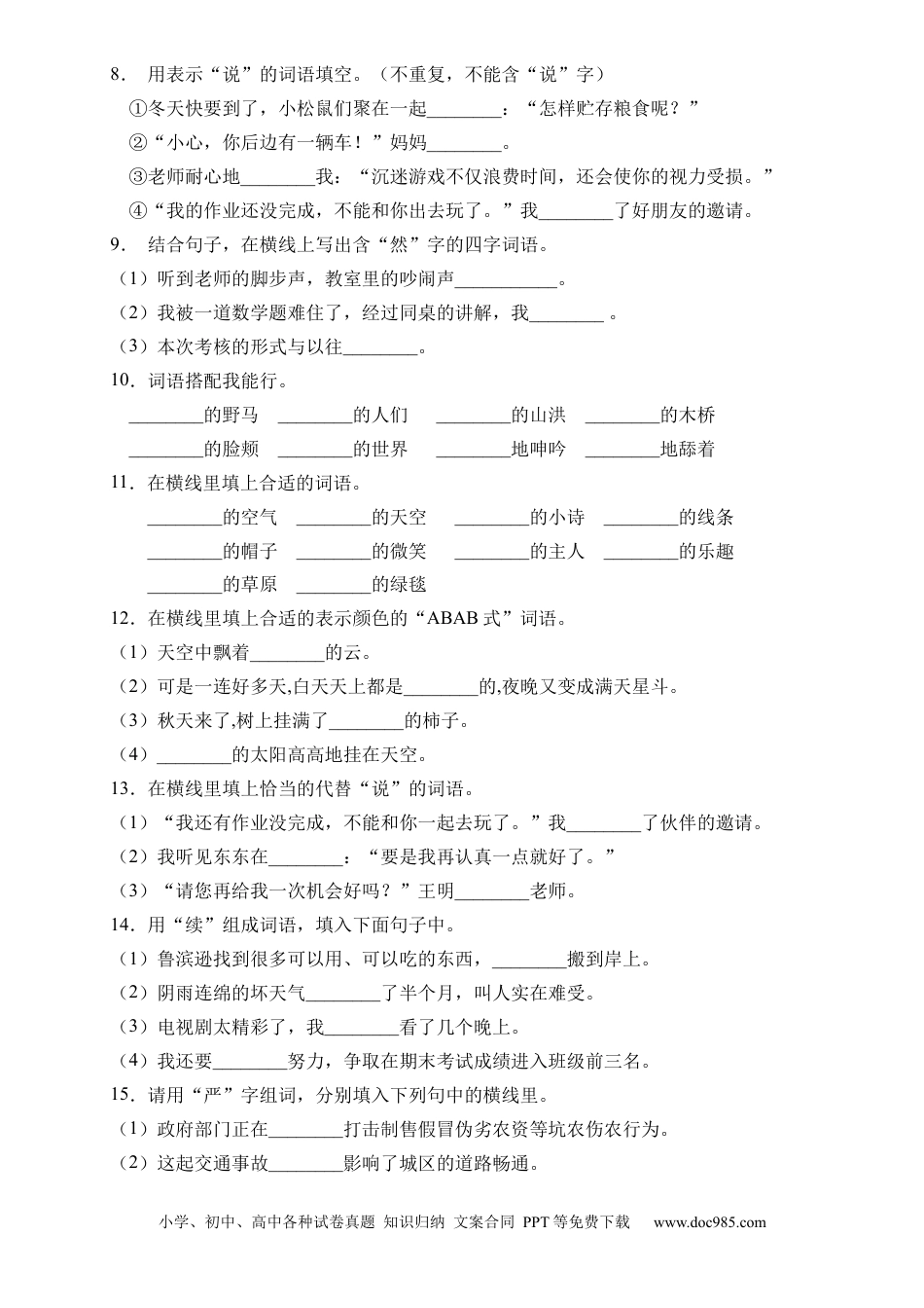 小学、初中、高中各种试卷真题知识归纳文案合同PPT等免费下载www.doc985.com小升初语文易错知识点专项集训词语搭配1.根据课文内容填上合适的词语。________的山沟________的茅草________的损失________地蜷一下腿________地蔓延________地打一仗2.在横线里填上适当的词语。________的衣裳________的微笑________的草原________的愉快________的鸣叫________的旷野3.用“激”组成不同的词;分别填在下面句子中的横线里。王宁叔叔是老山前线的战斗英雄;他满怀________地讲述了一次与日本侵略军进行________战斗、全歼敌人的经过。听完报告后;我们的心情非常________;英雄们的事迹将永远________我们前进。4.用“然”组词,分别填在横线里。(1)客家民居和傣家竹楼各有特点,建筑风格________不同。(2)两三百人聚集在一个会议室,秩序________,毫不混乱。(3)那一座座碉堡,经历无数次地震撼动和风雨侵蚀而________无恙。5.用“贵”字组成不同的词语,填入横线里。(1)桑娜有着热心助人的________品质。(2)博物馆里陈列着许多________的文物。(3)时间很________,我们要尽自己最大的努力完成这项任务。(4)那些天天追求荣华________的人,精神世界是空虚的。6.用“精”组词填句(1)图书馆里,我查资料、做摘录,_________地做着访前准备。(2)这套餐具设计得特别________,深受顾客喜欢。(3)用激光制作的测距仪测出的地球到月亮的距离是很_________的。(4)他的这幅《八骏图》堪称国画_________,售价高是应当的。7.按要求写合适的词语。(1)这是他最珍爱的传家之宝,不到________,是绝不肯轻易变卖的。(提示:带有“已”的成语)(2)我看见一位穿着红衣服的女孩在学校门口焦急地________(提示:在一个地方来回地走)(3)眼前吃点亏不用太沮丧,要知塞翁失马,________(提示:带有“福”的成语)小学、初中、高中各种试卷真题知识归纳文案合同PPT等免费下载www.doc985.com8.用表示“说”的词语填空。(不重复,不能含“说”字)①冬天快要到了,小松鼠们聚在一起________:“怎样贮存粮食呢?”②“小心,你后边有一辆车!”妈妈________。③老师耐心地________我:“沉迷游戏不仅浪费时间,还会使你的视力受损。”④“我的作业还没完成,不能和你出去玩了。”我________了好朋友的邀请。9.结合句子,在横线上写出含“然”字的四字词语。(1)听到老师的脚步声,教室里的吵闹声___________。(2)我被一道数学题难住了,经过同桌的讲解,我________。(3)本次考核的形式与以往________。10.词语搭配我能行。________的野马________的人们________的山洪________的木桥________的脸颊________的世界________地呻吟________地舔着11.在横线里填上合适的词语。________的空气________的天空________的小诗________的线条________的帽子________的微笑________的主人________的乐趣________的草原________的绿毯12.在横线里填上合适的表示颜色的“ABAB式”词语。(1)天空中飘着________的云。(2)可是一连好多天,白天天上都是________的,夜晚又变成满天星斗。(3)秋天来了,树上挂满了________的柿子。(4)________的太阳高高地挂在天空。13.在横线里填上恰当的代替“说”的词语。(1)“我还有作业没完成,不能和你一起去玩了。”我________了伙伴的邀请。(2)我听见东东在________:“要是我再认真一点就好了。”(3)“请您再给我一次机会好吗?”王明________老师。14.用“续”组成词语,填入下面句子中。(1)鲁滨逊找到很多可以用、可以吃的东西,________搬到岸上。(2)阴雨连绵的坏天气________了半个月,叫人实在难受。(3)电视剧太精彩了,我________看了几个晚上。(4)我还要________努力,争取在期末考试成绩进入班级前三名。15.请用“严”字组词,分别填入下列句中的横线里。(1)政府部门正在________打击制售假冒伪劣农资等坑农伤农行为。(2)这起交通事故________影响了城区的道路畅通。小学、初中、高中各种试卷真题知识归纳文案合同PPT等免费下载www.doc985.com(3)当前环境保护面临的形势依然十分________。(4)...