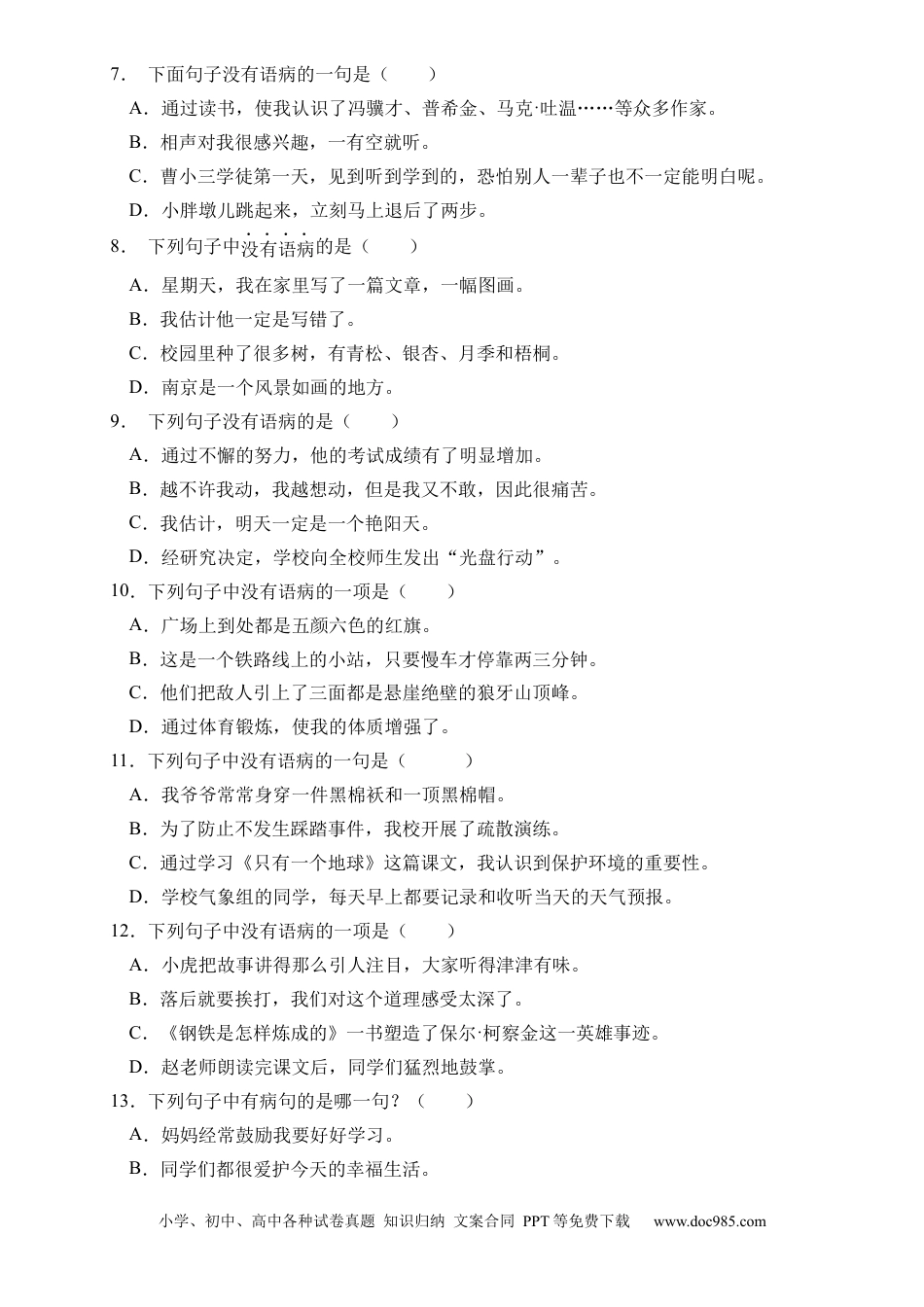 小学、初中、高中各种试卷真题知识归纳文案合同PPT等免费下载www.doc985.com小升初语文易错知识点专项集训病句辨析1.下列句子中,没有语病的是()A.五颜六色的红旗飘扬在去往天安门广场的道路上。B.音乐会结束后,那悠扬的歌声依旧浮现在我的耳畔。C.铁观音是中国传统茶叶,它以独特的兰花香闻名于海内外。D.要继承和发扬梅兰芳同志一丝不苟、不屈不挠的精神。2.下列句子中没有语病的是哪一项()A.新年到了,同学们得意洋洋地聚在一起庆祝新年。B.听了老师的话,制定了学习计划。C.雨过天晴,天空和大地好像滤过似的,格外清新。D.李平的钢笔字写得好,毛笔字也写得很出色。3.下列句子没有语病的一项()A.梅兰芳先生是闻名世界的著名的京剧表演艺术家。B.当四周很安静的时候,就在平台上弹琴。C.我觉得牛虽然把我们看得比它大,可我们不能平白地去欺负它。D.我们每天坚持做眼保健操,可以防止眼睛不近视。4.下列句子没有语病的一项是()A.李老师讲课很生动,同学们都津津有味地听着。B.一方有难,八方支援,纷纷为震区捐款献爱心。C.养成良好的习惯,是一个人是否成才的关键。D.它是从当地一座五千年前原始社会的墓葬中发掘出来的。5.下列句子中没有语病的一项是()A.这花园里蜜蜂、蜻蜓、蝴蝶、蚂蚱和昆虫,样样都有。B.第七届世界军人运动会在湖北省武汉市隆重开始。C.他身着蓝色的上衣、浅蓝色的短裤,脚穿运动鞋。D.远处传来一片哗笑和告别的身影。6.下列句子中,有语病的一项是()A.我年纪虽小,却早已深深体会到父亲挣钱的艰难。B.一谈到读书,我的话就多了。C.为了避免今后不再发生类似的事故,我们必须尽快健全安全制度。D.通过老师的讲解,我弄懂了这个问题。小学、初中、高中各种试卷真题知识归纳文案合同PPT等免费下载www.doc985.com7.下面句子没有语病的一句是()A.通过读书,使我认识了冯骥才、普希金、马克·吐温……等众多作家。B.相声对我很感兴趣,一有空就听。C.曹小三学徒第一天,见到听到学到的,恐怕别人一辈子也不一定能明白呢。D.小胖墩儿跳起来,立刻马上退后了两步。8.下列句子中没有语病的是()A.星期天,我在家里写了一篇文章,一幅图画。B.我估计他一定是写错了。C.校园里种了很多树,有青松、银杏、月季和梧桐。D.南京是一个风景如画的地方。9.下列句子没有语病的是()A.通过不懈的努力,他的考试成绩有了明显增加。B.越不许我动,我越想动,但是我又不敢,因此很痛苦。C.我估计,明天一定是一个艳阳天。D.经研究决定,学校向全校师生发出“光盘行动”。10.下列句子中没有语病的一项是()A.广场上到处都是五颜六色的红旗。B.这是一个铁路线上的小站,只要慢车才停靠两三分钟。C.他们把敌人引上了三面都是悬崖绝壁的狼牙山顶峰。D.通过体育锻炼,使我的体质增强了。11.下列句子中没有语病的一句是()A.我爷爷常常身穿一件黑棉袄和一顶黑棉帽。B.为了防止不发生踩踏事件,我校开展了疏散演练。C.通过学习《只有一个地球》这篇课文,我认识到保护环境的重要性。D.学校气象组的同学,每天早上都要记录和收听当天的天气预报。12.下列句子中没有语病的一项是()A.小虎把故事讲得那么引人注目,大家听得津津有味。B.落后就要挨打,我们对这个道理感受太深了。C.《钢铁是怎样炼成的》一书塑造了保尔·柯察金这一英雄事迹。D.赵老师朗读完课文后,同学们猛烈地鼓掌。13.下列句子中有病句的是哪一句?()A.妈妈经常鼓励我要好好学习。B.同学们都很爱护今天的幸福生活。小学、初中、高中各种试卷真题知识归纳文案合同PPT等免费下载www.doc985.comC.老师今天讲的知识我基本上懂了。D.下课时间到了,小明高兴地跑出教室去操场玩。14.下列没有语病的一项是()A.我们有了错误就要坚决改正并大胆承认。B.我们要发扬“艰苦朴素、勤俭节约”。C.开展优秀教学活动后,林老师的教学水平有了显著提高。D.学校操场长165多米左右,宽130米,是我们运动的主要场所。15.下列句子无语病的一项是()A.学习是否努力,是我们考试能取得好成绩的关键。B.只有采用科学的学习方法,我们都会...