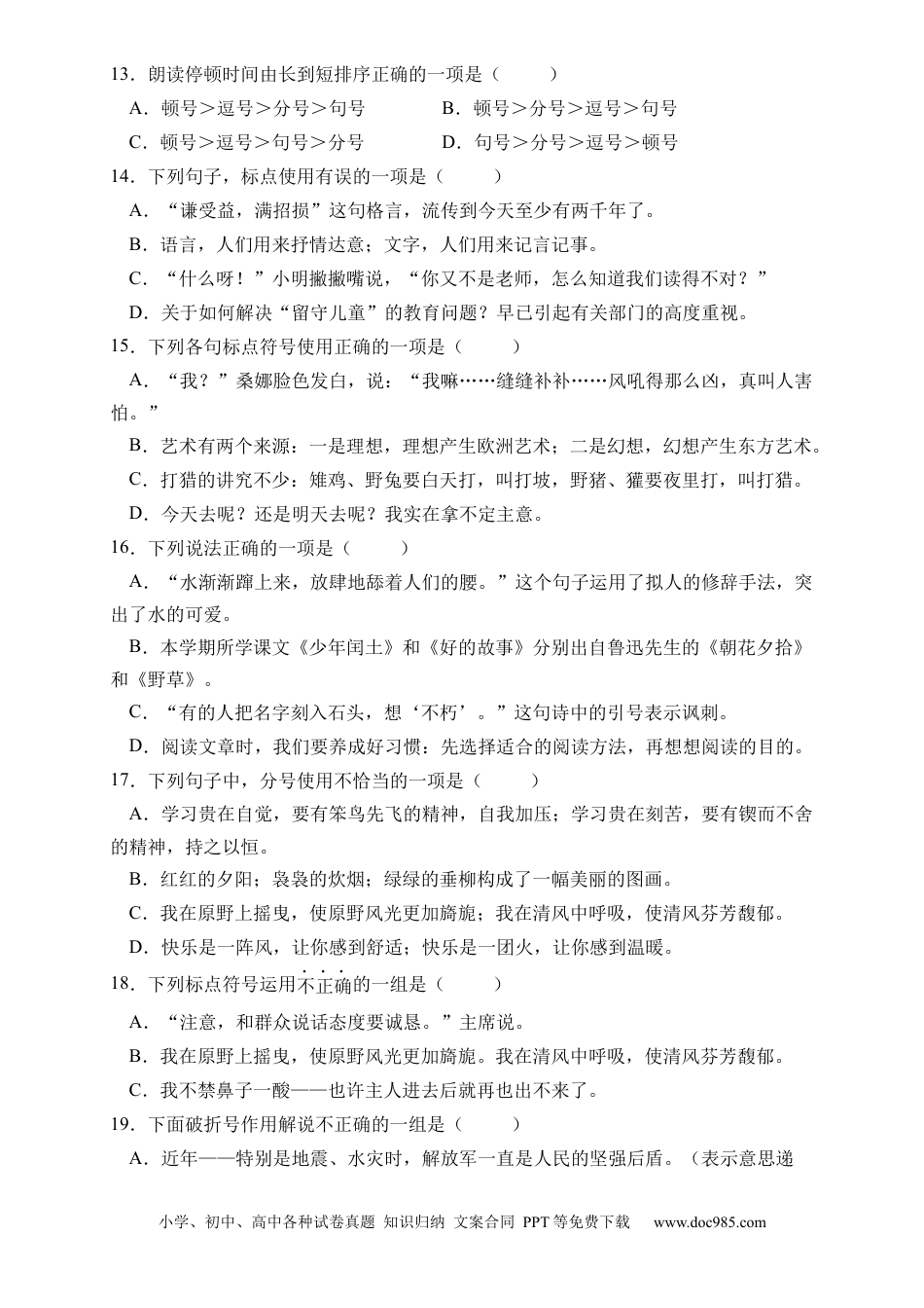小学、初中、高中各种试卷真题知识归纳文案合同PPT等免费下载www.doc985.com小升初语文易错知识点专项集训标点符号1.下列句子中标点符号使用有误的一项是()A.主人一声吩咐“酒宴摆下——”,仆人立刻把酒壶酒杯端上舞台。B.他飞奔回客店,花了一夜功夫,把刚才弹的曲子——《月光曲》记录了下来。C.“谁呀?”奶奶问道:“到底是谁呀?”D.有的人活着,他已经死了;有的人死了,他还活着。2.下面分号使用有误的一项是()A.太阳晒着地面,有些地区吸收的热量多,那里的空气就比较热;有些地区吸收的热量少,那里的空气就比较冷;空气有冷有热,才能流动,成为风。B.我在原野上摇曳,使原野风光更加旖旎;我在清风中呼吸,使清风芬芳馥郁。C.一块白石头,几天不见,就长满了苔藓;一片黄泥土,几天不见,就变成了草坪菜畦。3.下列句子中引号的用法与其他三项不同的一项是()A.“多好啊!”他在自言自语。B.“你知道吗?”桑娜说,“咱们的邻居西蒙死了。”C.班长马宝玉斩钉截铁地说了一声:“走!”D.午门俗称“五凤楼”,是紫禁城的正门。4.下列句子中标点符号使用错误的是哪一项()A.“嗒嗒嗒……”密集的机关枪子弹倾泻在卢沟桥桥面上。B.有一首歌叫《太湖美》,歌中唱道,“太湖美,美就美在太湖水!”C.清明节前的一个晚上,我又漫步在广场上,忽然背后传来一声赞叹:“多好啊!”D.“啊!”大家都高兴得叫起来,“雨来没有死!雨来没有死!”5.“整个上午我就跟在母亲腿底下:去吗?去吧,走吧,怎么还不走啊?走吧……”句子中省略号的作用是()A.表示列举的省略。B.表示引文的省略。C.表示声音的延长。D.表示说话的断断续续。6.下列句子中正确使用了分号的是哪一项()A.结,是解不完的;人生中的问题也是解不完的,不然,岂不太平淡无味了?B.操场上可真热闹呀!同学们有的打球;有的跑步;有的跳绳;还有的跳远。C.妹妹红着脸,吞吞吐吐地说:“我;不是我做的。”D.你说你的;我说我的;总的意思是民族团结互助。小学、初中、高中各种试卷真题知识归纳文案合同PPT等免费下载www.doc985.com7.下列关于标点符号用法的解析正确的一项是()A.那些鸡没完没了地叫着:“他活该!他活该……”(省略号表示话没有说完)B.“那——怎样才能使功夫到家呢?”莫泊桑急切地问。(破折号表示解释说明)C.“偶然的机遇”只会给那些善于独立思考的人。(引号表示特殊含义,需要强调)8.与例句中破折号作用相同的一句是()例:战士们像潮水一般冲向敌军司令部所在地——隆化中学。A.那个书包很漂亮,而且装有很多东西——现在不见了。B.老师大声喊到:“预备——跑!”C.我永远忘不了加入少先队的那天——2020年6月1日。D.自然是读着,读着,强记着——而且要背出来。9.下列各句中标点符号使用有误的一项是()A.“学习就怕‘认真’二字。”爸爸说,“态度决定一切!”B.晚上,爸爸问我今天做了什么事?我吞吞吐吐答不上来。C.在山巅,我写云海、松涛;在海边,我写浪花、礁石。D.学校有很多花,迎春、月季、桂花、梅花……—年四季、花开不败。10.下列各句使用标点符号不正确的一项是()A.“碰壁?”我说,“您怎么会碰壁呢?是不是走路不小心?”B.我问爸爸什么叫“妙处”,爸爸笑而不答。C.您有60岁了吧?老师。D.谁也不知道这个故事的结局是什么。11.下列句子中,标点使用正确的一项是()A.昨天是苞蕾;今天是鲜花;明天就变成了小果实。B.走了许久,远远地望见了一条迂回的明如玻璃的带子——河!C.我总是仰望星空,对光明心驰神往,我从不顾影自怜,也不孤芳自赏。D.面前有两条路:一条通往主力转移的方向,走这条路可以很快追上连队,可是敌人紧跟在身后,另一条通向狼牙山的顶峰棋盘陀,那儿三面都是悬崖绝壁。12.下列句子,分号用得不正确的一项是()A.清晨,我同晨风一道将光明迎接;傍晚,我又与群鸟一起为它送行。B.(听到这声音)我跑出来了;爸爸跑出来了;一院子的人都跑出来了。C.我在原野上摇曳,使原野风光更加旖旎;我在清风中呼吸,使清风芬芳馥郁。D.心灵是一方广袤的天空,它包容着世间的一...