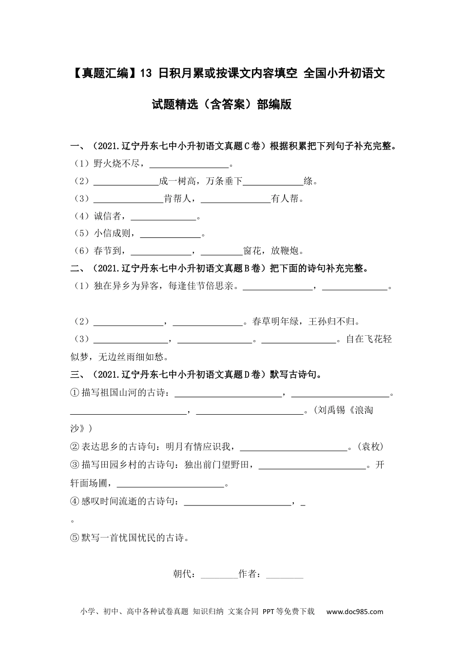 小学、初中、高中各种试卷真题知识归纳文案合同PPT等免费下载www.doc985.com【真题汇编】13日积月累或按课文内容填空全国小升初语文试题精选(含答案)部编版一、(2021.辽宁丹东七中小升初语文真题C卷)根据积累把下列句子补充完整。(1)野火烧不尽,。(2)成一树高,万条垂下绦。(3)肯帮人,有人帮。(4)诚信者,。(5)小信成则,。(6)春节到,,窗花,放鞭炮。二、(2021.辽宁丹东七中小升初语文真题B卷)把下面的诗句补充完整。(1)独在异乡为异客,每逢佳节倍思亲。,。(2),。春草明年绿,王孙归不归。(3),。。自在飞花轻似梦,无边丝雨细如愁。三、(2021.辽宁丹东七中小升初语文真题D卷)默写古诗句。①描写祖国山河的古诗:,。,。(刘禹锡《浪淘沙》)②表达思乡的古诗句:明月有情应识我,。(袁枚)③描写田园乡村的古诗句:独出前门望野田,。开轩面场圃,。④感叹时间流逝的古诗句:,。⑤默写一首忧国忧民的古诗。朝代:________作者:________小学、初中、高中各种试卷真题知识归纳文案合同PPT等免费下载www.doc985.com,。,。四、(2020.广东.深圳坪山区小升初真题)根据课文内容或日积月累填空。(1)___________________,事非经过不知难。(2)何当金络脑,___________________。(3)___________________,不知秋思落谁家。(4)春无踪迹谁知?___________________。(5)《迢迢牵牛星》中表现相思而落泪的句子是“___________________,___________________”。(6)“_________________,无心插柳柳成荫。”生活常常会给我们意外的惊喜。(7)“良药苦口利于病,___________________。”对于别人的忠告,我们要认真听取。(8)如今生活条件好了,我们也不能铺张浪费,有句古话说得好:“___________________,___________________,莫把无时当有时。”(9)莫道君行早,___________________。五、(2020.广东.揭阳市惠来县小升初真题)回忆课文内容填空。1.十年树木,____________;插柳之恩,____________。2.“人固有一死,或____________,或____________”。这句话是代说的,其中“固”的意思是____________;“或”的意思是___________。3.燕子去了,____________;杨柳枯了,____________;桃花谢了,____________。4.“迢迢牵牛星,__________________”描写的是我国传统节日中的节。5.补充诗句,然后把以下诗句的序号填在合适的情境里。A.__________________,任尔东西南北风。B.今夜月明人尽望,__________________。C.谁道人生无再少?__________________!休将白发唱黄鸡。(1)我们劝慰别人不要叹息时光流逝,要振作精神时,可以吟诵:__________________。(2)我们感叹家人在月圆之夜不能团圆,只能寄情思于月亮时,可以吟诵:小学、初中、高中各种试卷真题知识归纳文案合同PPT等免费下载www.doc985.com__________________。(3)我们劝慰别人不要向困难屈服,要有坚韧的生命力时,可以吟诵:__________________。六、(2020.广东.珠海市香洲区小升初真题)我会诵读,根据句意填写恰当的内容。1.“举头望明月,低头思故乡。”古往今来,那轮明月寄托了多少人的情思啊!譬如诗句:___________________,___________________。2.“潜移默化”“润物无声”,人们常用这样的词语赞美我们的老师,这便是出自杜甫《春夜喜雨》中的诗句“___________________,___________________”。3.“我们的日子为什么一去不复返呢?”朱自清在《匆匆》中这样描写时光如流水、一去不复返。《长歌行》也有这样的诗句“___________________,___________________”。4.毕业了,愿你勇往直前!如果遇到挫折,要有“___________________,任尔东西南北风”的坚强和自信;如果身处困境,也要有“___________________,___________________,通则久”的改变和突破。七、(2020.广东.云浮.新兴县小升初真题)请把下列诗文或名言补充完整。1.夏日夜晚,望着夜空里明亮的牵牛星和织女星,我会想起诗句:“盈盈一水间,___________________”;月圆之夜,诗人王建感慨“今夜月明人尽望,”。2.《送远二使安西》能表现送别的诗句是。3.《两小儿辩日》讲述了孔子...