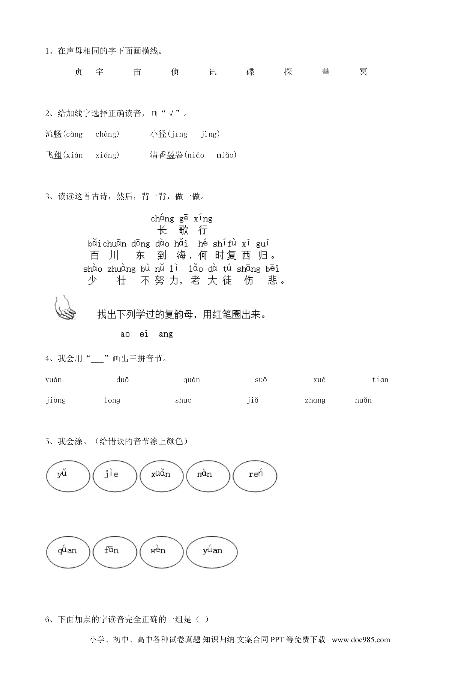 1、在声母相同的字下面画横线。贞宇宙侦讯碟探彗冥2、给加线字选择正确读音,画“√”。流畅(càngchàng)小径(jīngjìng)飞翔(xiánxiáng)清香袅袅(niǎomiǎo)3、读读这首古诗,然后,背一背,做一做。4、我会用“”画出三拼音节。yuǎnduōquànsuǒxuětiɑnjiānɡlonɡshuojiǎzhɑnɡnuǎn5、我会涂。(给错误的音节涂上颜色)6、下面加点的字读音完全正确的一组是()小学、初中、高中各种试卷真题知识归纳文案合同PPT等免费下载www.doc985.comA.瞬(xùn)间永恒(héng)狐(fú)狸规律(lǜ)B.羡慕(mù)内涵(hán)无赖(lài)驰骋(chěng)C.勾勒(nè)脂(zhǐ)肪讴(ō)歌餐(cān)馆7、我会选择正确的读音。cháozhāo1.我们朝()着朝()阳升起的方向走去。jiǎjià2.暑假()里,我们开展了“找假()货”的小队活动。8、给带点的字选择合适的读音,并用“──”画出来。1、旗杆(ɡǎnɡān)上的旗子在飘着。2、放暑假(jiàjiǎ)了,小明和爸爸妈妈去旅游。3、小林把铁丝缝(fénɡfènɡ)在雨衣的下沿。4、用扇子扇(shānshàn)风很费力气,于是人们发明了电风扇(shānshàn)。9、给加线的字选择正确的读音。坍塌(tāndān)口涎(dànxián)大概(kǎigài)胯下(kuàkuǎ)影影绰绰(cuòchuò)沮丧(jǔjǚ)似乎(sìshì)10、给下面的生字选择正确的读音。拳(quánqüán)头小囡(nānniān)家瞎(xiāxiá)说蒙眬(lóngnóng)手舞足蹈(dǎotǎo)咚咚(tōngdōng)直响11、在正确读音下画横线。森(sēngsēn)林今年(niánlián)小学、初中、高中各种试卷真题知识归纳文案合同PPT等免费下载www.doc985.com已经(jīnjīng)花丛(chóngcóng)12、划去不正确的读音。(1)我准(zǔnzhǔn)备到上海去游玩.(2)今天谁请(qǐngqǐn)客?(3)上课时,我们要专(zuānzhuān)心听讲。13、对号入座,读准音节选一选。huǒniúyóubiǎopǎo14、给下面的字母分类。aibzhifmrzheudzhlongküpzichsshizritchicshjqcisixri声母:韵母:整体认读音节:15、按要求分类写下来。abjnzhuxtsmerüpico单韵母:声母:小学、初中、高中各种试卷真题知识归纳文案合同PPT等免费下载www.doc985.com16、我会画。(看看下面的字母像什么,并画出来)17、默写六个单韵母。()()()()()()18、按照要求给下面的单韵母标声调。a(四声)e(三声)o(二声)e(二声)a(一声)19、把下面的音节补充完整。(14分)20、按要求填空。命算总顶盘旋促平舌音的字有________________三拼音的字有_______________前鼻音的字有________________后鼻音的字有_______________21、照样子写音节。小学、初中、高中各种试卷真题知识归纳文案合同PPT等免费下载www.doc985.comywd—ù→(dù)t—è→()t—ǔ→()d—u—ǒ→()n—ǔ→()n—à→()l—ǔ→()l—u—ó→()22、看拼音,填字母。例:bǎ——(b)——(ǎ)fǔ——()——()bù——()——()má——()——()pò——()——()pí——()——()23、我会把韵母表补充完整。()ei()aoou()()üeer()en()un()()eng()()24、写出下面音节的韵母。kāi()xuě()jú()mǐn()què()jīng()hǔ()jùn()kǒu()zhēng()qǔ()lǜ()25、写出由下列单韵母可以组的复韵母。aoeiuü小学、初中、高中各种试卷真题知识归纳文案合同PPT等免费下载www.doc985.com26、我能找出音节中的韵母,把它们写在横线上。27、我会找出各自的“住所”。sìcízǐchǐzshczhshì28、我会拼。29、和妈妈一起猜一猜。有时像圆盘,有时像镰刀。白天藏起来,晚上才出来。谜底:(可用拼音写出谜底)小学、初中、高中各种试卷真题知识归纳文案合同PPT等免费下载www.doc985.com30、给下面的字母分类。aibzhiyuanuifyinreiyuncihoangeryueyu声母:_________________________________________________________韵母:_________________________________________________________整体认读音节:__________________________________________________31、我会把单韵母组成复韵母,再写下来。aoeiuü()()()()()()32、我会分。33、我会填。...