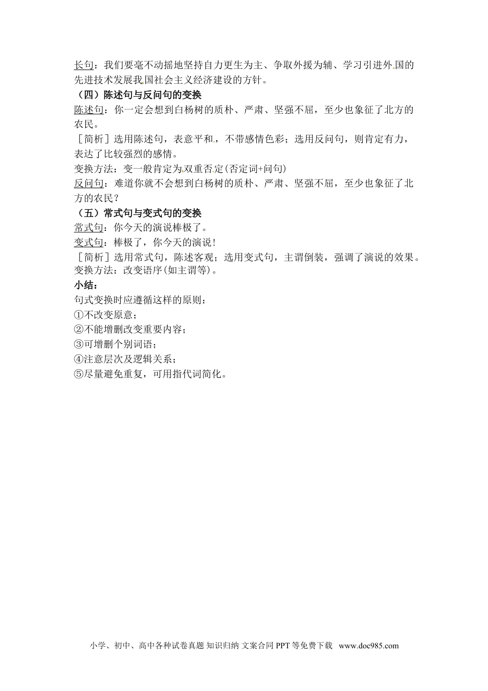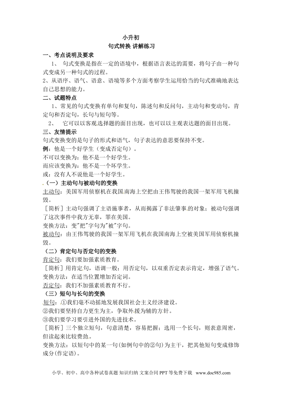 小升初句式转换讲解练习一、考点说明及要求1、句式变换是指在一定的语境中,根据语言表达的需要,将句子由一种句式变成另一种句式的过程。2、从语序、语气、语意、语境等多个方面考察学生运用恰当的句式准确地表达自己思想的能力。二、试题特点1、常见的句式变换有单句和复句,陈述句和反问句,主动句和变动句,肯定句和否定句,长句与短句等。21世纪教育网版权所有2、它可以以客观选择题的面目出现,也可以以主观表达题的面目出现。三、友情提示句式变换变的是句子的形式和语气,句子表达的意思要保持不变。例:他是一个好学生(变成否定句)。不可以变换为:他不是一个好学生。而应该变换为:他不是一个坏学生。或:没有人不说他是一个好学生。(一)主动句与被动句的变换主动句:美国军用侦察机在我国南海上空把由王伟驾驶的我国一架军用飞机撞毁。[来源:学。科。网Z。X。X。K][简析]主动句强调了主语施事者,从而揭露了非法肇事的对象;被动句强调了这次事件中我方无辜,罪在美国。21教育网变换方法:变"把"字句为"被"字句。被动句:由王伟驾驶的我国一架军用飞机在我国南海上空被美国军用侦察机撞毁。(二)肯定句与否定句的变换肯定句:我们要加强素质教育。[简析]用肯定句,语调一般;用否定句,以双重否定表示肯定,增强了语气。变换方法:在适当位置增加否定词。否定句:我们不加强素质教育不行。(三)短句与长句的变换[来源:Z|xx|k.Com]短句:①我们毫不动摇地发展我国社会主义经济建设。[来源:学。科。网Z。X。X。K]②我们要坚持自力更生为主,争取外援为辅的方针。③我们要学习要引进外国的先进技术。[简析]三个独立短句,句意清楚,容易把握;选用一个长句,则表意周密,但读起来比较费劲。变换方法:以短句中的某一句(如例句中的②句)为主干,把其他短句变成修饰成分(作定语)。小学、初中、高中各种试卷真题知识归纳文案合同PPT等免费下载www.doc985.com长句:我们要毫不动摇地坚持自力更生为主、争取外援为辅、学习引进外国的先进技术发展我国社会主义经济建设的方针。(四)陈述句与反问句的变换陈述句:你一定会想到白杨树的质朴、严肃、坚强不屈,至少也象征了北方的农民。[来源:学+科+网][简析]选用陈述句,表意平和,不带感情色彩;选用反问句,则肯定有力,表达了比较强烈的感情。变换方法:变一般肯定为双重否定(否定词+问句)反问句:难道你就不会想到白杨树的质朴、严肃、坚强不屈,至少也象征了北方的农民?(五)常式句与变式句的变换常式句:你今天的演说棒极了。变式句:棒极了,你今天的演说![简析]选用常式句,陈述客观;选用变式句,主谓倒装,强调了演说的效果。[来源:学科网ZXXK]变换方法:改变语序(如主谓等)。小结:句式变换时应遵循这样的原则:①不改变原意;②不能增删改变重要内容;③可增删个别词语;④注意层次及逻辑关系;⑤尽量避免重复,可用指代词简化。小学、初中、高中各种试卷真题知识归纳文案合同PPT等免费下载www.doc985.com