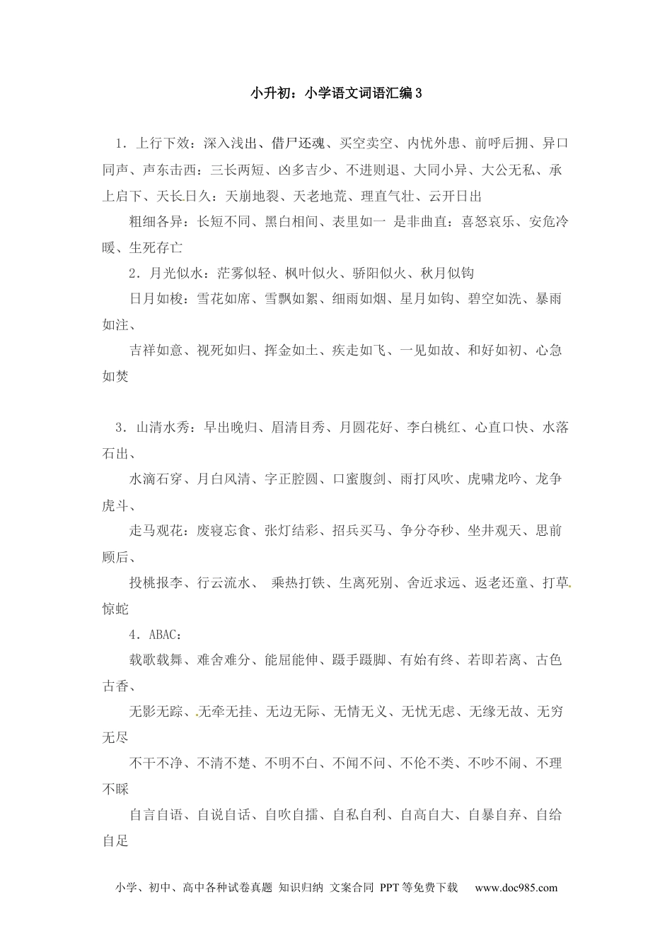 小学、初中、高中各种试卷真题知识归纳文案合同PPT等免费下载www.doc985.com小升初:小学语文词语汇编31.上行下效:深入浅出、借尸还魂、买空卖空、内忧外患、前呼后拥、异口同声、声东击西:三长两短、凶多吉少、不进则退、大同小异、大公无私、承上启下、天长日久:天崩地裂、天老地荒、理直气壮、云开日出21教育网粗细各异:长短不同、黑白相间、表里如一是非曲直:喜怒哀乐、安危冷暖、生死存亡[来源:学科网ZXXK]2.月光似水:茫雾似轻、枫叶似火、骄阳似火、秋月似钩日月如梭:雪花如席、雪飘如絮、细雨如烟、星月如钩、碧空如洗、暴雨如注、吉祥如意、视死如归、挥金如土、疾走如飞、一见如故、和好如初、心急如焚3.山清水秀:早出晚归、眉清目秀、月圆花好、李白桃红、心直口快、水落石出、水滴石穿、月白风清、字正腔圆、口蜜腹剑、雨打风吹、虎啸龙吟、龙争虎斗、走马观花:废寝忘食、张灯结彩、招兵买马、争分夺秒、坐井观天、思前顾后、[来源:学科网ZXXK]投桃报李、行云流水、乘热打铁、生离死别、舍近求远、返老还童、打草惊蛇4.ABAC:载歌载舞、难舍难分、能屈能伸、蹑手蹑脚、有始有终、若即若离、古色古香、[来源:学科网ZXXK]无影无踪、无牵无挂、无边无际、无情无义、无忧无虑、无缘无故、无穷无尽[来源:学。科。网Z。X。X。K]不干不净、不清不楚、不明不白、不闻不问、不伦不类、不吵不闹、不理不睬自言自语、自说自话、自吹自擂、自私自利、自高自大、自暴自弃、自给自足小学、初中、高中各种试卷真题知识归纳文案合同PPT等免费下载www.doc985.com时隐时现、时高时低、时明时暗、时上时下、半信半疑、半明半昧、半梦半醒5.AABB:摇摇摆摆、恍恍惚惚、清清楚楚、明明白白、干干净净、飘飘洒洒、顺顺利利、6.ABAB:(动作)整理整理、打扫打扫、清扫清扫、舒活舒活、清理清理、忽闪忽闪[来源:学科网ZXXK](颜色)雪白雪白、碧绿碧绿、金黄金黄、乌黑乌黑、瓦蓝瓦蓝7.AABC:闪闪发光、窃窃私语、津津乐道、欣欣向荣、栩栩如生、滔滔不绝、翩翩起舞8.ABCC:神采奕奕、星光熠熠、小心翼翼、炊烟袅袅、白雪皑皑、烈日灼灼、赤日炎炎绿浪滚滚、波浪滚滚、云浪滚滚、麦浪滚滚、热浪滚滚、江水滚滚、车轮滚滚果实累累、秋实累累、硕果累累、果实累累、尸骨累累、弹孔累累、白骨累累生气勃勃、生机勃勃、生气勃勃、朝气勃勃、兴致勃勃、雄心勃勃、野心勃勃