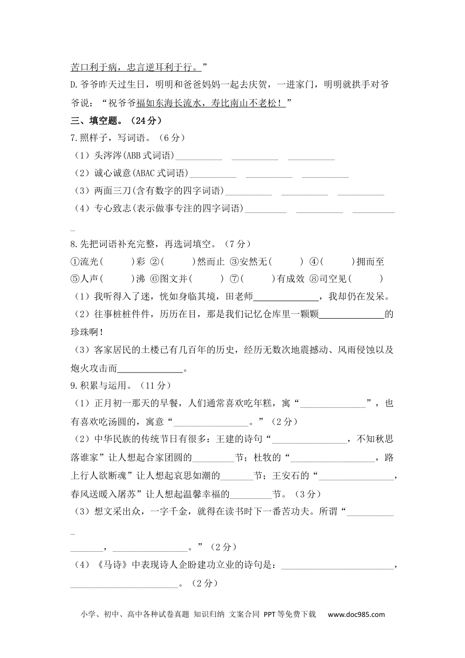 小学、初中、高中各种试卷真题知识归纳文案合同PPT等免费下载www.doc985.com小升初语文综合模拟试卷(五)部编版含答案(时间:120分钟满分:120分)一、书写。(9分)1.读下面一段话,根据拼音写汉字,把字写得工整美观。(9分)我还qīngxī地记得,六年前,我们yīwēi着爸爸妈妈,怀着对学校的憧憬和对老师的jìngyǎng走进校园。lǜcāorúyīn的操场,chuāngmíngjījìng的教室,天真lànmàn的同学,héǎikěqīn的老师,充满神奇yòumó香气的课本,一切都是那样yóurén。二、选择题。(10分)2.下列字音完全正确的一组是()(2分)A.咆哮(páoxiào)疯狂(fēnɡkuánɡ)放肆(fànɡsì)吞没(tūnmò)题号一二三四五六七八总分得分小学、初中、高中各种试卷真题知识归纳文案合同PPT等免费下载www.doc985.comB.狞笑(nìnɡxiào)惊慌(jīnɡhuānɡ)揪出(jiūchū)胸膛(xiōnɡtánɡ)C.拥戴(yōnɡdài)流淌(liútǎnɡ)呻吟(shēnyīn)发抖(fādǒu)D.祭奠(jìdiàn)搀扶(wǎnfú)沙哑(shāyǎ)黎明(límínɡ)3.下列几组词语中,加点字的意思没有错误的是()。(2分)A.深(深奥)入浅出感情深(距离大)厚深(非常)信不疑B.顾名(名称)思义举世闻名(名声)莫名(名义)其妙C.一胜(胜利)一负风景名胜(优美的景物)事实胜(比另一个优越)于雄辩D.悲愤欲(将要)绝求知欲(欲望)欲(将要)擒故纵4.下列选项中,内容搭配不正确的一项是()(2分)A.《清贫》——《可爱的祖国》——表明矜持不苟、廉洁奉公的态度B.《祖父的园子》——《呼兰河传》——对自由生活的向往和对祖父的怀念C.《两茎灯草》——《儒林外史》——对亲人去世的忧伤之情D.《田忌赛马》——《史记·孙子吴起列传》——赞扬孙膑高超的智慧5.根据句意选词填空,序号排列正确的一项是()(2分)我的爸爸做事非常,追求完美,对我要求也很,不容我有半点马虎,只要看见他一脸的表情,就知道接下来会是一顿的训斥了。①严守②严肃③严格④严厉⑤严重⑥严谨A.⑥③⑤④B.⑥③②④C.⑥④⑤②D.②④③⑤6.下面句中划横线的内容是丽丽填写的,其中有一句运用不够恰当,请你帮她找出来。()(2分)A.你的朋友尽管学习很努力,但成绩总是不理想,她很灰心,你可以这样劝慰她:“虚心使人进步,骄傲使人落后。”B.东东很聪明,就是学习上怕吃苦,临近毕业,爸爸想勉励他勤奋学习,就赠给他这样一句名言:“书山有路勤为径,学海无涯苦作舟。”C.小强总是很乐意接受别人的批评和意见,有的同学不理解,小强说:“良药小学、初中、高中各种试卷真题知识归纳文案合同PPT等免费下载www.doc985.com苦口利于病,忠言逆耳利于行。”D.爷爷昨天过生日,明明和爸爸妈妈一起去庆贺,一进家门,明明就拱手对爷爷说:“祝爷爷福如东海长流水,寿比南山不老松!”三、填空题。(24分)7.照样子,写词语。(6分)(1)头涔涔(ABB式词语)______________________________(2)诚心诚意(ABAC式词语)______________________________(3)两面三刀(含有数字的四字词语)______________________________(4)专心致志(表示做事专注的四字词语)_____________________________8.先把词语补充完整,再选词填空。(7分)①流光()彩②()然而止③安然无()④()拥而至⑤人声()沸⑥图文并()⑦()有成效⑧司空见()(1)我听得入了迷,恍如身临其境,田老师,我却仍在发呆。(2)往事桩桩件件,历历在目,那是我们记忆仓库里一颗颗的珍珠啊!(3)客家居民的土楼已有几百年的历史,经历无数次地震撼动、风雨侵蚀以及炮火攻击而。9.积累与运用。(11分)(1)正月初一那天的早餐,人们通常喜欢吃年糕,寓“______________”,也有喜欢吃汤圆的,寓意“________________。”(2分)(2)中华民族的传统节日有很多:王建的诗句“________________,不知秋思落谁家”让人想起合家团圆的_________节;杜牧的“__________________,路上行人欲断魂”让人想起哀思如潮的_______节;王安石的“________________,春风送暖入屠苏”让人想起温馨幸福的_________节。(3分)(3)想文采出众,一字千金,就得在读书时下一番苦功夫。...