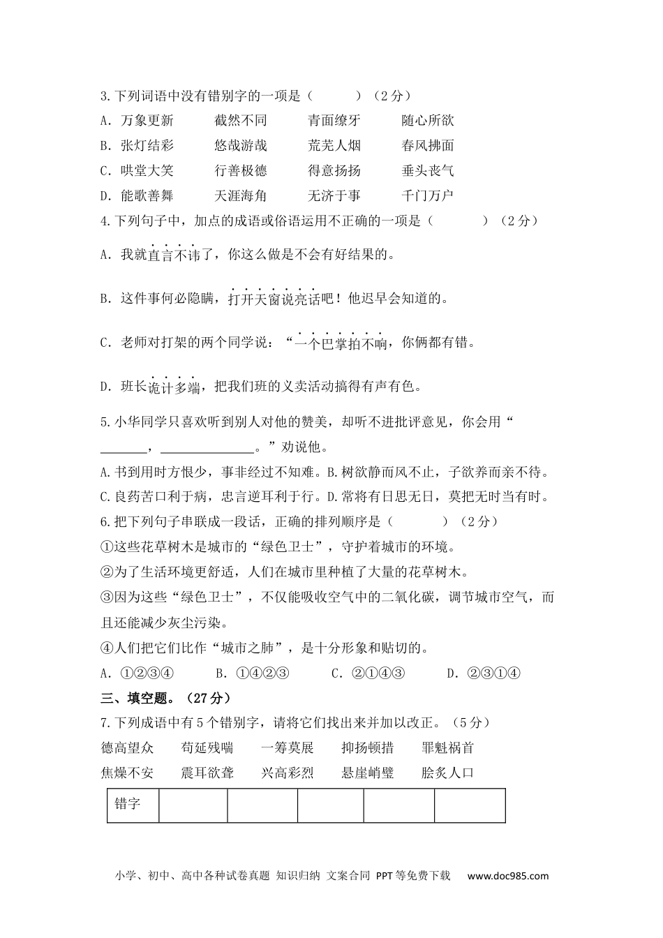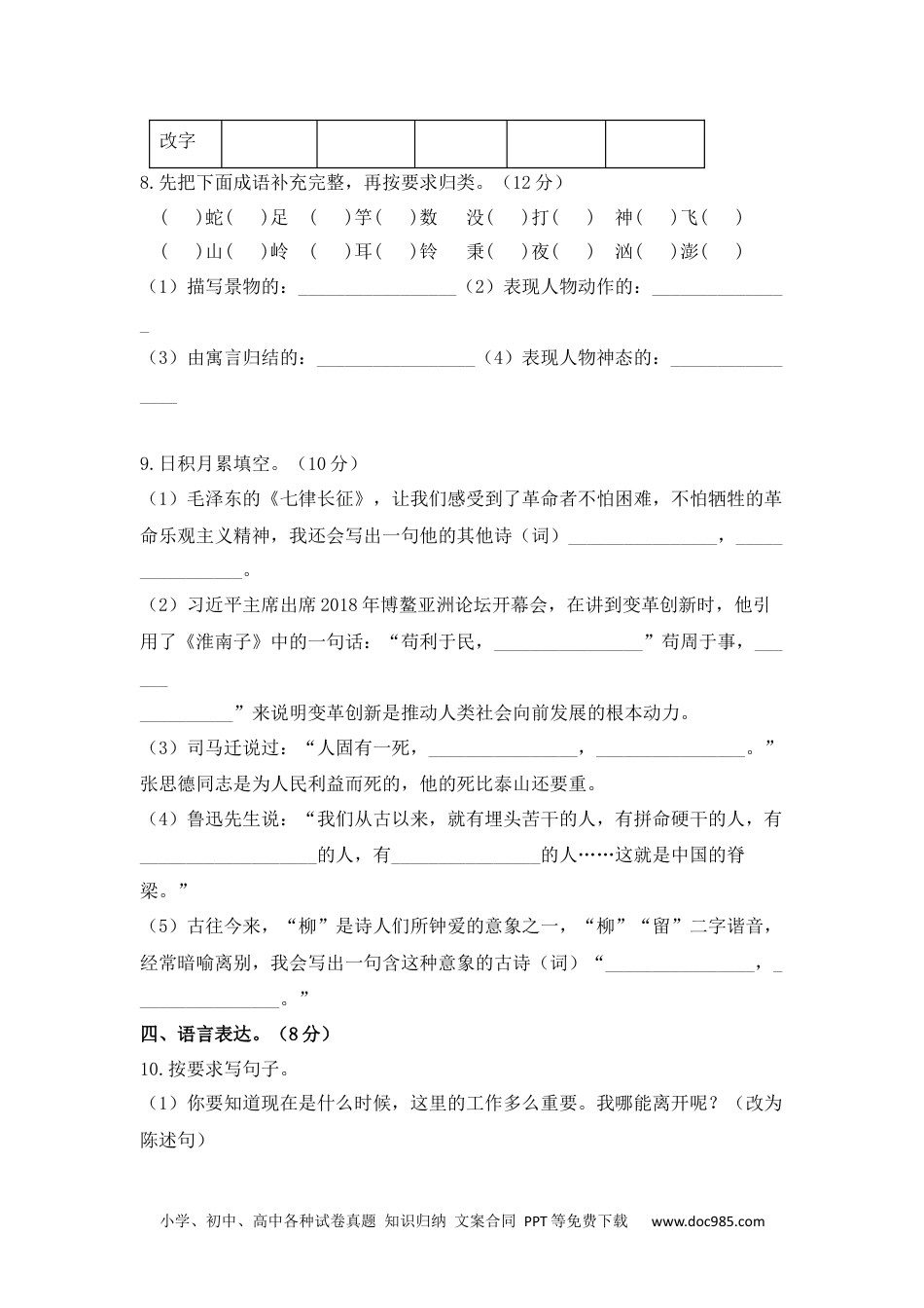 小学、初中、高中各种试卷真题知识归纳文案合同PPT等免费下载www.doc985.com小升初语文综合模拟试卷(四)部编版含答案(时间:120分钟满分:120分)一、书写。(10分)1.根据语境,看拼音写词语。(1)新年伊始,新冠肺炎大肆(qīnxí)__________,(chǔjìng)__________极其凶险。在这局势十分(yánjùn)__________的时刻,全国各地许多医务人员纷纷响应党的号召,挺身而出,英勇“逆行”,紧急奔赴湖北抗疫一线,为解救广大危难惑者,日夜(fènzhàn)__________了两个多月,终使疫区民众(chóngjiàntiānrì)_______________,安居乐业!(2)2021年5月15日7时18分,我国自行(yánzhì)__________的天问一号探测器携带“祝融号”火星车成功(zhuólù)__________在火星上,(shǒucì)__________在火星上留下中国人的印迹,是我国航天事业的又一具有里程碑意义的重大(jìnzhǎn)__________,使我国在行星探测(lǐngyù)_________进入世界先进行列。二、选择题。(10分)2.下列音、形、义全部正确的一项是()(2分)A.嵌入(qiàn)镜匣(jiá)铿锵香飘十里(随风飞扬)B.箩筐(luó)垂蔓(wàn)吩咐绝口不提(独一无二的)C.新冠肺炎(ɡuān)眼睑(jiǎn)牺牲风景名胜(优美的)D.侮辱(wǔ)允诺(nuò)消毁相依为命(依靠)题号一二三四五六七八总分得分小学、初中、高中各种试卷真题知识归纳文案合同PPT等免费下载www.doc985.com3.下列词语中没有错别字的一项是()(2分)A.万象更新截然不同青面缭牙随心所欲B.张灯结彩悠哉游哉荒芜人烟春风拂面C.哄堂大笑行善极德得意扬扬垂头丧气D.能歌善舞天涯海角无济于事千门万户4.下列句子中,加点的成语或俗语运用不正确的一项是()(2分)A.我就直言不讳了,你这么做是不会有好结果的。B.这件事何必隐瞒,打开天窗说亮话吧!他迟早会知道的。C.老师对打架的两个同学说:“一个巴掌拍不响,你俩都有错。D.班长诡计多端,把我们班的义卖活动搞得有声有色。5.小华同学只喜欢听到别人对他的赞美,却听不进批评意见,你会用“,。”劝说他。A.书到用时方恨少,事非经过不知难。B.树欲静而风不止,子欲养而亲不待。C.良药苦口利于病,忠言逆耳利于行。D.常将有日思无日,莫把无时当有时。6.把下列句子串联成一段话,正确的排列顺序是()(2分)①这些花草树木是城市的“绿色卫士”,守护着城市的环境。②为了生活环境更舒适,人们在城市里种植了大量的花草树木。③因为这些“绿色卫士”,不仅能吸收空气中的二氧化碳,调节城市空气,而且还能减少灰尘污染。④人们把它们比作“城市之肺”,是十分形象和贴切的。A.①②③④B.①④②③C.②①④③D.②③①④三、填空题。(27分)7.下列成语中有5个错别字,请将它们找出来并加以改正。(5分)德高望众苟延残喘一筹莫展抑扬顿措罪魁祸首焦燥不安震耳欲聋兴高彩烈悬崖峭璧脍炙人口错字小学、初中、高中各种试卷真题知识归纳文案合同PPT等免费下载www.doc985.com改字8.先把下面成语补充完整,再按要求归类。(12分)()蛇()足()竽()数没()打()神()飞()()山()岭()耳()铃秉()夜()汹()澎()(1)描写景物的:_________________(2)表现人物动作的:_______________(3)由寓言归结的:_________________(4)表现人物神态的:________________9.日积月累填空。(10分)(1)毛泽东的《七律长征》,让我们感受到了革命者不怕困难,不怕牺牲的革命乐观主义精神,我还会写出一句他的其他诗(词)________________,________________。(2)习近平主席出席2018年博鳌亚洲论坛开幕会,在讲到变革创新时,他引用了《淮南子》中的一句话:“苟利于民,________________”苟周于事,________________”来说明变革创新是推动人类社会向前发展的根本动力。(3)司马迁说过:“人固有一死,________________,________________。”张思德同志是为人民利益而死的,他的死比泰山还要重。(4)鲁迅先生说:“我们从古以来,就有埋头苦干的人,有拼命硬干的人,有___________________的人,有________________的人……这就是中国的脊梁。”(5)古往今来,“柳”是诗人们所钟爱的意...