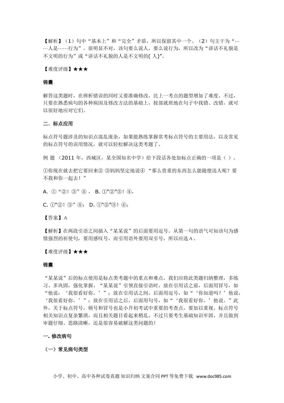 小升初语文一本通:病句与标点一、病句辨析与修改修改病句是小升初语文试题中的热门考点,总体来说有一定的难度,如果不经过对病句相关知识的梳理与演练,仅凭语感很难做出正确的解答。在病句题的训练中,比较重要的便是掌握常见的病句类型,做到心中有数,进而对病句题胸有成竹。在这里我们归纳出了一些常见病句的病因及修改方法。21·世纪*教育网(一)病句辨析例题(2010年,海淀区,某顶级中学本部)下列语句中,没有语病的一项是()。A.老师慈母般的关怀,我一辈子终身难忘。B.一个微寒的夜晚,我踏上了南下的列车。C.在老师的帮助下,使我的学习进步不小。D.考试前,我把橡皮忘了装进文具盒里。【答案】B【解析】A句中“一辈子”与“终身”重复,可将其中一个删掉。C句缺主语,主语被掩藏,可去掉“在⋯⋯下,”或“使”令句子成分齐全。D语序不当,可将“忘了”挪到“把”的前面。【难度评级】★★★锦囊常考的病句类型有成分残缺、词语搭配不当、语序混乱、概念模糊、重复啰嗦、指代不明、前后矛盾等,而其中语序混乱、成分残缺、重复的问题在小升初考试题中尤为常见,应该熟练把握,详细讲解请参看后面的“知识梳理”部分。www-2-1-cnjy-com(二)病句修改例题(2011年,西城区,某高校二附中初中部)修改下面的病句,将改好的句子写在下面的横线上。(1)我现在基本上把不好的学习习惯完全改正了。_______________________(2)讲话不礼貌的人是不文明的行为。_______________________【答案】(1)我现在把不好的学习习惯完全改正了。或:我现在基本上把不好的学习习惯改正了。(2)讲话不礼貌是不文明的行为。或:讲话不礼貌的人是不文明的(人)。小学、初中、高中各种试卷真题知识归纳文案合同PPT等免费下载www.doc985.com【解析】(1)句中“基本上”和“完全”矛盾,所以保留其中一个。(2)句主干为“⋯⋯人是⋯⋯行为”,很明显不对,该句要么说人,要么说行为,所以改为“讲话不礼貌是不文明的行为”或“讲话不礼貌的人是不文明的(人)”。21世纪教育网版权所有【难度评级】★★★锦囊解答这类题时,在辨析错误的同时又要准确修改,比上一考点的题型增加了难度。不过,只要在熟悉病句的各种病因及修改方法的基础上,按部就班地在句子中找错、改错,就可以很好地应对它们。21cnjy.com二.标点应用标点符号题涉及的知识点混乱庞杂,如果能熟练掌握常考标点符号的主要用法,以及常见的标点符号的误用情况,就可以轻松解决这类考题了。2-1-c-n-j-y例题(2011年,西城区,某全国知名中学)给下段话各处加标点正确的一项是()。①你现在就去把它要回来②③妈妈坚定地说④“那么贵重的东西怎么能随便送人呢?要不我和你一起去!”A.①“②!③”④,B.①“②”③!④,C.①“②!③”④:D.①“②”③!④:【答案】A【解析】在两段引语之间插入“某某说”的后面要用逗号。从第一句的语气可知该句为感情强烈的祈使句,要用感叹号,而引用语外要用双引号,所以应选A。21*cnjy*com【难度评级】★★★锦囊“某某说”后的标点使用是标点类考题中的重点和难点,我们应将此类题归纳整理,多练习、多巩固,强化掌握。“某某说”引领直接引语时,放在引用话之前,后面用冒号,如“他说:‘我很看好你。’”;放在引用话之间,后面用逗号,如“‘你知道吗?’他说,‘我很看好你。’”;放在引用话之后,后面用句号,如“‘我很看好你。’他说。”此外,关于标点符号,顿号和冒号也是小升初考试中重要的考查点,要加以重视。标点符号相关知识点复杂繁琐,而且相关题目看起来稍乱,不过只要考生基础知识牢固,并且做到审题仔细、思路清晰,还是很容易破解这类问题的!www.21-cn-jy.com一.修改病句(一)常见病句类型小学、初中、高中各种试卷真题知识归纳文案合同PPT等免费下载www.doc985.com(二)辨析及修改病句的基本方法1.辨析方法(1)语感法辨析句子正误,首先得认真阅读,看是否通顺流畅,然后仔细考虑,从整体把握,看看句意是否明确,内容是否合理,句中各部分的关系与关联词语是否一致等,凭借语感,就可以发现一些句子的毛病。不过需要注意的是,由于我们平...