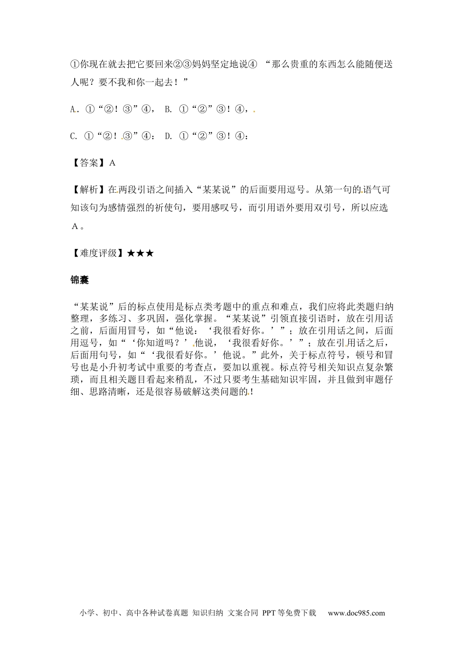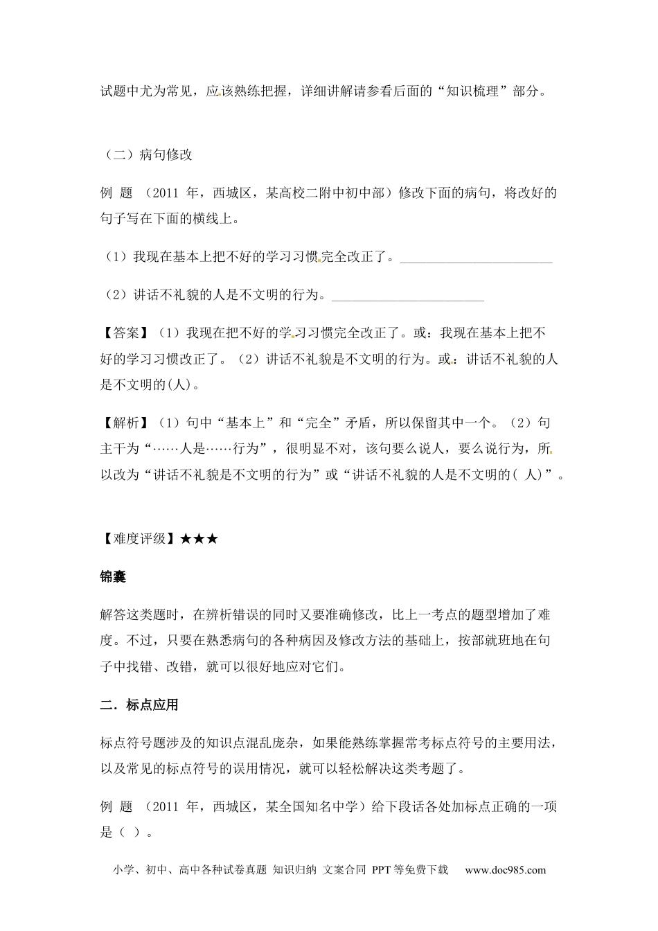 小学、初中、高中各种试卷真题知识归纳文案合同PPT等免费下载www.doc985.com小升初语文一本通:病句与标点一、病句辨析与修改修改病句是小升初语文试题中的热门考点,总体来说有一定的难度,如果不经过对病句相关知识的梳理与演练,仅凭语感很难做出正确的解答。在病句题的训练中,比较重要的便是掌握常见的病句类型,做到心中有数,进而对病句题胸有成竹。在这里我们归纳出了一些常见病句的病因及修改方法。21·世纪*教育网(一)病句辨析[来源:Zxxk.Com]例题(2010年,海淀区,某顶级中学本部)下列语句中,没有语病的一项是()。A.老师慈母般的关怀,我一辈子终身难忘。B.一个微寒的夜晚,我踏上了南下的列车。C.在老师的帮助下,使我的学习进步不小。D.考试前,我把橡皮忘了装进文具盒里。【答案】B【解析】A句中“一辈子”与“终身”重复,可将其中一个删掉。C句缺主语,主语被掩藏,可去掉“在⋯⋯下,”或“使”令句子成分齐全。D语序不当,可将“忘了”挪到“把”的前面。【难度评级】★★★锦囊[来源:学§科§网]常考的病句类型有成分残缺、词语搭配不当、语序混乱、概念模糊、重复啰嗦、指代不明、前后矛盾等,而其中语序混乱、成分残缺、重复的问题在小升初考小学、初中、高中各种试卷真题知识归纳文案合同PPT等免费下载www.doc985.com试题中尤为常见,应该熟练把握,详细讲解请参看后面的“知识梳理”部分。www-2-1-cnjy-com(二)病句修改[来源:学#科#网Z#X#X#K]例题(2011年,西城区,某高校二附中初中部)修改下面的病句,将改好的句子写在下面的横线上。(1)我现在基本上把不好的学习习惯完全改正了。_______________________(2)讲话不礼貌的人是不文明的行为。_______________________【答案】(1)我现在把不好的学习习惯完全改正了。或:我现在基本上把不好的学习习惯改正了。(2)讲话不礼貌是不文明的行为。或:讲话不礼貌的人是不文明的(人)。【解析】(1)句中“基本上”和“完全”矛盾,所以保留其中一个。(2)句主干为“⋯⋯人是⋯⋯行为”,很明显不对,该句要么说人,要么说行为,所以改为“讲话不礼貌是不文明的行为”或“讲话不礼貌的人是不文明的(人)”。21世纪教育网版权所有【难度评级】★★★锦囊解答这类题时,在辨析错误的同时又要准确修改,比上一考点的题型增加了难度。不过,只要在熟悉病句的各种病因及修改方法的基础上,按部就班地在句子中找错、改错,就可以很好地应对它们。21cnjy.com二.标点应用标点符号题涉及的知识点混乱庞杂,如果能熟练掌握常考标点符号的主要用法,以及常见的标点符号的误用情况,就可以轻松解决这类考题了。2-1-c-n-j-y例题(2011年,西城区,某全国知名中学)给下段话各处加标点正确的一项是()。小学、初中、高中各种试卷真题知识归纳文案合同PPT等免费下载www.doc985.com①你现在就去把它要回来②③妈妈坚定地说④“那么贵重的东西怎么能随便送人呢?要不我和你一起去!”[来源:学科网ZXXK]A.①“②!③”④,B.①“②”③!④,C.①“②!③”④:D.①“②”③!④:【答案】A【解析】在两段引语之间插入“某某说”的后面要用逗号。从第一句的语气可知该句为感情强烈的祈使句,要用感叹号,而引用语外要用双引号,所以应选A。21*cnjy*com【难度评级】★★★[来源:Z*xx*k.Com]锦囊“某某说”后的标点使用是标点类考题中的重点和难点,我们应将此类题归纳整理,多练习、多巩固,强化掌握。“某某说”引领直接引语时,放在引用话之前,后面用冒号,如“他说:‘我很看好你。’”;放在引用话之间,后面用逗号,如“‘你知道吗?’他说,‘我很看好你。’”;放在引用话之后,后面用句号,如“‘我很看好你。’他说。”此外,关于标点符号,顿号和冒号也是小升初考试中重要的考查点,要加以重视。标点符号相关知识点复杂繁琐,而且相关题目看起来稍乱,不过只要考生基础知识牢固,并且做到审题仔细、思路清晰,还是很容易破解这类问题的!www.21-cn-jy.c