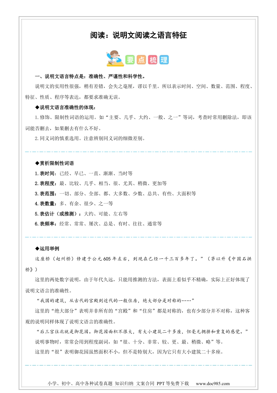 小学、初中、高中各种试卷真题知识归纳文案合同PPT等免费下载www.doc985.com阅读:说明文阅读之语言特征一、说明文语言特点是:准确性、严谨性和科学性。说明文的实用性很强,稍有差错,会失之毫厘,谬以千里。所以表示时间、空间、数量、范围、程度、特征、性质、程序等表达,都要求准确无误。◆说明文语言准确性的体现:1.修饰、限制性词语的运用。如“主要、几乎、大约、一般、之一”等词,考查时常用删除法,即该词能否删去,如果删去有什么不好。2.同义词的慎重选用。注意辨别同义词的细微差别。◆赏析限制性词语1.表时间:已经、早已、一直、渐渐、当时等2.表程度:最、比较、几乎、相当、很、尤其、稍微、更加等3.表范围:一切、部分、全部、都、大多数、少数、总共、有些、大面积等4.表数量:多、有余、很少、之一等5.表估计(或推测):大约、可能、左右等6.表频率:经常、常常、屡次、总是、有时、往往、通常等◆运用举例这座桥(赵州桥)修建于公元605年左右,到现在已经一千三百多年了。”(茅以升《中国石拱桥》)这里的两处数字说明,由于年代久远,只能用推测的方法,表面上看似乎不精确,实际上正好体现了说明文语言的准确性。“我国的建筑,从古代的宫殿到近代的一般住房,绝大部分是对称的……”这里的“绝大部分”表明并非所有的“宫殿”和“住房”都是对称的,也有少部分并不对称,这种客观的说明同样体现了说明文语言的准确性。“后三宫往北就是御花园。御花园面积不很大,有大小建筑二十多座,但毫无拥挤和重复的感觉。”说明事物时,常常会用到程度副词,如“很、十分、非常、较、更、最、稍微、略”等。这里的“很”表明御花园虽然面积不小,但不是特别大,因为它只有大小建筑二十多座。小学、初中、高中各种试卷真题知识归纳文案合同PPT等免费下载www.doc985.com二、说明文按语言风格可分为:平实性说明文和生动性说明文(文艺性说明文)。1.所谓“平实”。平实:就是用通俗、准确的语言客观地说明事物或事理。即抓住事物的特点,用准确、简明、平实的语言,对事物的形状、构造、性能等加以解说,不必加修饰或描写,只需明白如话地写出来即可。采用此类语言来写的说明文,叫“平实说明文”,其语言特点是:准确、简明、平实。2.所谓“生动”。生动:就是用生动、形象的语言说明事物或事理。即借助描写、记叙等表达方式,形象性的动词、形容词等,运用比喻、拟人等修辞手法,对事物进行具体形象的描写,有时还引用神话故事、传说和历史故事等。采用此类语言来写的说明文,叫“科学小品文”或“文学性的说明文”,其语言特点是:准确、形象、生动。大多数说明文采用生动说明的语言风格。◆说明文语言生动性的体现:1.比喻、拟人等修辞手法的运用。2.运用记叙、描写等表达方式。3.说明中融入个人情感(抒情)等手法。4.动静结合、虚实结合等表现手法的运用。三、设问形式及答题格式【题型1】xx词能否删除?①表态:不能删,不能去掉。②比较:因为“……”表示……,删掉后就变成了……,这与文意不符。A原来是什么意思;B删去后是什么意思,会怎样(不符合实际,太绝对了)。③套话:体现了说明文语言的准确性。【题型2】xx词能否替换?①表态:不能换。②比较:A原词的意思或内容;B所换词语的意思或内容;C换后词语所在句子的意思,与事实不符。③套话:体现了说明文语言的准确性。小学、初中、高中各种试卷真题知识归纳文案合同PPT等免费下载www.doc985.com【题型3】xx词有什么作用?对策:抓住说明文语言准确这一特点答题。①解词:解释所指词语的意思。②准确/生动形象/地说明了事物……的特征/事理。③套话:体现了说明文语言的准确性。【题型4】本文语言有什么特点?对整篇文章语言的品析,一般从两个角度谈:(1)准确,(2)形象生动或简明平实。答题格式:本文语言具有准确、生动/平实(二选一)的特点,如……一句,就准确、生动/平实(二选一)地说明了事物……的特征(或事理),像这样的例子文章中还有很多。1.尘埃就是漂浮在大气中的尘粒。这小小的幽灵是栖身在空气中,借着大气的浮力,悄然而来,又无声地离去。它来去匆匆,无孔不入。(1)...