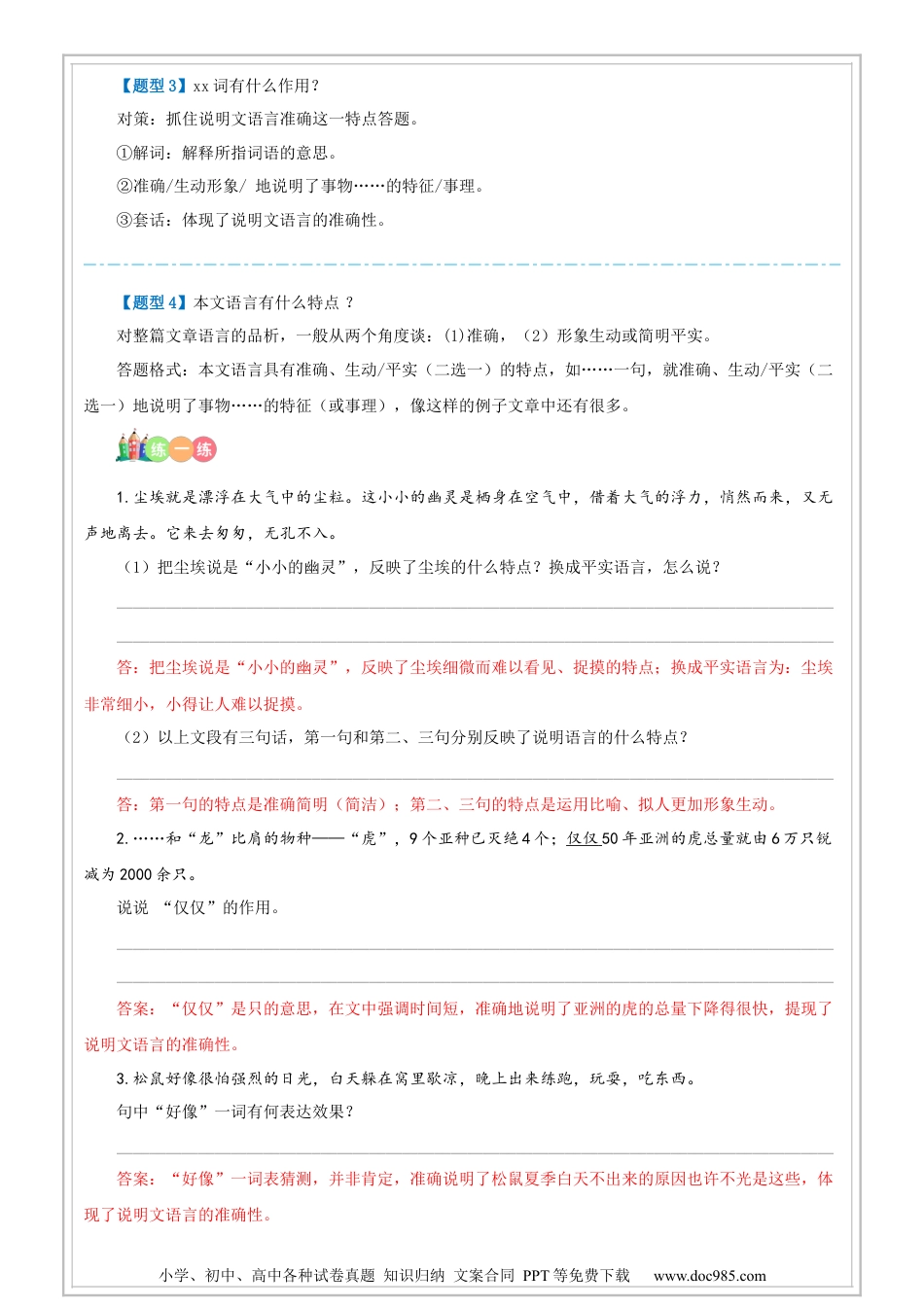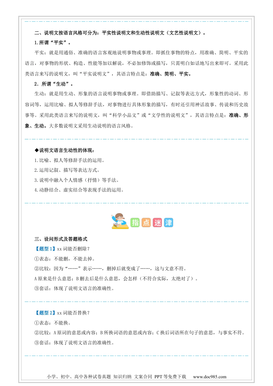 小学、初中、高中各种试卷真题知识归纳文案合同PPT等免费下载www.doc985.com阅读:说明文阅读之语言特征一、说明文语言特点是:准确性、严谨性和科学性。说明文的实用性很强,稍有差错,会失之毫厘,谬以千里。所以表示时间、空间、数量、范围、程度、特征、性质、程序等表达,都要求准确无误。◆说明文语言准确性的体现:1.修饰、限制性词语的运用。如“主要、几乎、大约、一般、之一”等词,考查时常用删除法,即该词能否删去,如果删去有什么不好。2.同义词的慎重选用。注意辨别同义词的细微差别。◆赏析限制性词语1.表时间:已经、早已、一直、渐渐、当时等2.表程度:最、比较、几乎、相当、很、尤其、稍微、更加等3.表范围:一切、部分、全部、都、大多数、少数、总共、有些、大面积等4.表数量:多、有余、很少、之一等5.表估计(或推测):大约、可能、左右等6.表频率:经常、常常、屡次、总是、有时、往往、通常等◆运用举例这座桥(赵州桥)修建于公元605年左右,到现在已经一千三百多年了。”(茅以升《中国石拱桥》)这里的两处数字说明,由于年代久远,只能用推测的方法,表面上看似乎不精确,实际上正好体现了说明文语言的准确性。“我国的建筑,从古代的宫殿到近代的一般住房,绝大部分是对称的……”这里的“绝大部分”表明并非所有的“宫殿”和“住房”都是对称的,也有少部分并不对称,这种客观的说明同样体现了说明文语言的准确性。“后三宫往北就是御花园。御花园面积不很大,有大小建筑二十多座,但毫无拥挤和重复的感觉。”说明事物时,常常会用到程度副词,如“很、十分、非常、较、更、最、稍微、略”等。这里的“很”表明御花园虽然面积不小,但不是特别大,因为它只有大小建筑二十多座。小学、初中、高中各种试卷真题知识归纳文案合同PPT等免费下载www.doc985.com二、说明文按语言风格可分为:平实性说明文和生动性说明文(文艺性说明文)。1.所谓“平实”。平实:就是用通俗、准确的语言客观地说明事物或事理。即抓住事物的特点,用准确、简明、平实的语言,对事物的形状、构造、性能等加以解说,不必加修饰或描写,只需明白如话地写出来即可。采用此类语言来写的说明文,叫“平实说明文”,其语言特点是:准确、简明、平实。2.所谓“生动”。生动:就是用生动、形象的语言说明事物或事理。即借助描写、记叙等表达方式,形象性的动词、形容词等,运用比喻、拟人等修辞手法,对事物进行具体形象的描写,有时还引用神话故事、传说和历史故事等。采用此类语言来写的说明文,叫“科学小品文”或“文学性的说明文”,其语言特点是:准确、形象、生动。大多数说明文采用生动说明的语言风格。◆说明文语言生动性的体现:1.比喻、拟人等修辞手法的运用。2.运用记叙、描写等表达方式。3.说明中融入个人情感(抒情)等手法。4.动静结合、虚实结合等表现手法的运用。三、设问形式及答题格式【题型1】xx词能否删除?①表态:不能删,不能去掉。②比较:因为“……”表示……,删掉后就变成了……,这与文意不符。A原来是什么意思;B删去后是什么意思,会怎样(不符合实际,太绝对了)。③套话:体现了说明文语言的准确性。【题型2】xx词能否替换?①表态:不能换。②比较:A原词的意思或内容;B所换词语的意思或内容;C换后词语所在句子的意思,与事实不符。③套话:体现了说明文语言的准确性。小学、初中、高中各种试卷真题知识归纳文案合同PPT等免费下载www.doc985.com【题型3】xx词有什么作用?对策:抓住说明文语言准确这一特点答题。①解词:解释所指词语的意思。②准确/生动形象/地说明了事物……的特征/事理。③套话:体现了说明文语言的准确性。【题型4】本文语言有什么特点?对整篇文章语言的品析,一般从两个角度谈:(1)准确,(2)形象生动或简明平实。答题格式:本文语言具有准确、生动/平实(二选一)的特点,如……一句,就准确、生动/平实(二选一)地说明了事物……的特征(或事理),像这样的例子文章中还有很多。1.尘埃就是漂浮在大气中的尘粒。这小小的幽灵是栖身在空气中,借着大气的浮力,悄然而来,又无声地离去。它来去匆匆,无孔不入。(1)...