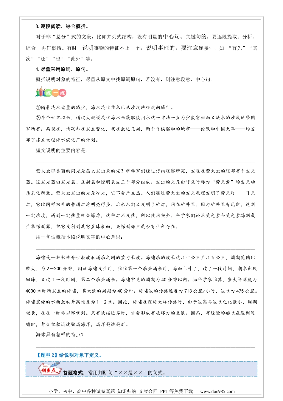 小学、初中、高中各种试卷真题知识归纳文案合同PPT等免费下载www.doc985.com阅读:说明文阅读之对象及特征一、说明文的概念说明文是以说明为主要表达方式,用来介绍事物的状态、性质、构造、功用、制作方法、发展过程或阐明事理的一种实用文体。二、说明文的分类1.按说明对象可分为:事物说明文和事理说明文。2.按语言风格可分为:平实性说明文和生动性说明文(文艺性说明文)。3.按写作方法可分为:介绍性说明文、描述性说明文、记叙性说明文、阐释性说明文。三、说明文的特点1.说明性。以说明为主要表达方式,兼用叙述、描写、议论等其他表达方式。2.知识性(科学性)。以介绍事物的形状、性质、成因、构造、功用、类别或阐明事理的含义、特点、演变等为主要内容。【说明文考点】小学、初中、高中各种试卷真题知识归纳文案合同PPT等免费下载www.doc985.com一、明确说明对象【题型1】本文的说明对象是什么?说明对象是一篇文章所要介绍的事物或事理,可以从三个方面入手:1.看文题(1)标题是名词性的,一般是说明事物的,如《松鼠》、《北京的立交桥》、《雄伟的人民大会堂》等;(2)而标题是抽象名词的,一般用“……方法”作标题多是事理性的说明文,如《统筹方法》;(3)标题中带有疑问性的,常常是解释原因,说明事理的,如《什么是生态系统》。2.抓总起句、总结句或中心句一般情况下,文段的开头(或各段的第一句)和结尾(或各段最后一句)往往点明了说明对象。3.根据文章的内容概括(1)事物说明文指出被说明事物即可。(2)事理说明文指出说明内容,形成一个短语:介绍了……(对象)的……(内容)。二、概括说明对象特征【解题思路】看标题——审问题——读文章1.看标题:说明对象的特征。2.审问题:有针对性地读文章。3.读文章:跳读搜索;把握关键词句。【题型1】本文说明了××的××特征。1.看标题。有的标题在指出文章说明对象的同时,也指出其特征;有的标题用设问句的形式,引导读者有针对性地把握说明对象的特征;有的标题用生动形象的比喻或拟人的手法说明事物或事理的特征。特别是标题中的修饰、限制成分。如《巍巍中山陵》2.抓住关键句、中心句。对于总分式、递进式结构的说明文,从中心句中抓住关键词语加以整理。一般情况下,文段的开头(或各段的第一句)和结尾(或各段最后一句)往往说明了对象的特点。如:不少说明文会集中陈述说明对象特征的语句,阅读时必须抓住它。如《苏州园林》一文,开头总说部分,就说明了苏州园林的特点是“务必使游览者无论站在哪个点上,眼前总是一幅完善的图画”。后面说明苏州园林的整个布局以及局部的安排都突出了这个特点。另外,也有在过渡的句子中有具体的概括,一般用“不但,而且”这样递进关系的句子。小学、初中、高中各种试卷真题知识归纳文案合同PPT等免费下载www.doc985.com3.逐段阅读,综合概括。对于非“总分”式的文段,比如并列式结构,没有明显的中心句、关键句的,要逐段提取、分析、综合,再作概括。有时,说明事物的特征不止一个;说明事理的,要注意连接词,如“首先”“其次”“还”“也”“此外”等。4.尽量采用原词,原句。概括说明对象的特征,尽量从原文中找原词原句,若没有,则注意段意、中心句。①随着淡水储量的减少,海水淡化技术已从沙漠地带走向城市。②半个世纪以来,通过大规模淡化海水来获取饮用水这一方法一直为少数富裕而又缺水的沙漠地带国家所有。而现在,情况却在发生变化,就在最近几周,两个气候温和的城市——伦敦和中国天津——均宣布了建立大型海水淡化厂的计划。短文说明的主要内容是:________________________________________________________________________________________萤火虫那美丽的闪光是怎么发出来的呢?科学家们经过仔细观察研究,发现在萤火虫的腹部有个发光器。这发光器由发光层、反射层和透明表皮三个部分组成。发出的光是由呼吸时称为“荧光素”的发光物质氧化所致。萤火虫发出的光是冷光,它不会产生热。人们通过萤火虫的发光原理发明了荧光灯——日光灯,它比同样功率的普通灯泡明亮得多。后来人们又发明了矿灯,用在矿井里。因为矿井里有瓦斯,达到一定浓...