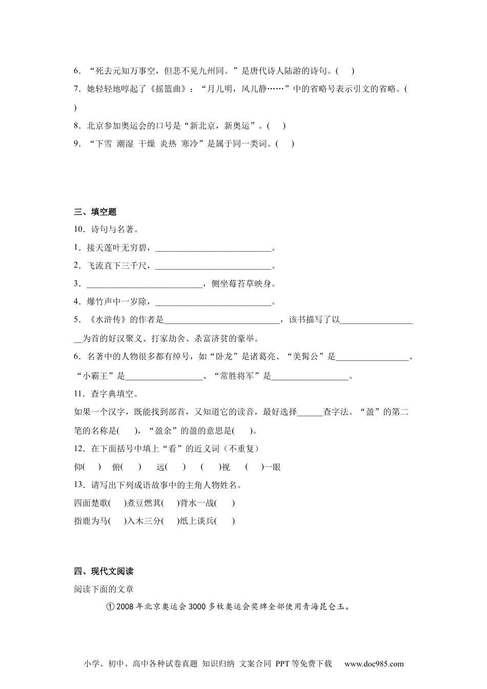 小学、初中、高中各种试卷真题知识归纳文案合同PPT等免费下载www.doc985.com小升初分班考特训卷(四)(试题)-小学语文六年级下册部编版一、选择题1.下列词语中加点字的读音全部正确的一项是()A.堆砌(qì)随风摇曳(yè)蜷缩(quán)栩栩如生(xǔ)B.窥视(kuī)引吭高歌(kàng)惬意(qiè)鹬蚌相争(bàng)C.胚胎(pēi)功勋卓越(xūn)咀嚼(jiáo)绵亘蜿蜒(gèn)D.粗犷(kuàng)窈窕淑女(tiǎo)干涸(hé)澎湃汹涌(pài)2.下列词语中有两个错别字的一项是()A.呕心沥血束手无策因材施教走投无路B.同仇敌忾银装素裹迫不急待耳濡目染C.得意忘型风驰电掣金榜提名咄咄逼人D.如履薄冰瞠目结舌虎视眈眈眼急手快3.下列句子中没有语病的一项是()A.英国小说家笛福的《鲁滨逊漂流记》对于中国小学生是不陌生的。B.一开春,小麦就长得很好,获得了可喜的收获。C.几年来,他一直在收集、整理民歌,积累了大量的资料。D.我来到广州白云山的地方,游览了白云松涛、鸣春谷和云台花园等景点。4.下列没有错别字的一组是()A.金壁辉煌呕心沥血顽强不屈负荆请罪B.走头无路香味四溢秉烛夜游迫不急待C.春意盎然脍炙人口无可奈何心旷神怡D.呕心沥血谈笑风声舍身取义繁花嫩叶二、判断题判断下列说法是否正确,对的打“√”,错的打“×”。5.“人固有一死,或重于泰山,或轻于鸿毛。”一句中的“或”字是“或者”的意思。()小学、初中、高中各种试卷真题知识归纳文案合同PPT等免费下载www.doc985.com6.“死去元知万事空,但悲不见九州同。”是唐代诗人陆游的诗句。()7.她轻轻地啍起了《摇篮曲》:“月儿明,风儿静……”中的省略号表示引文的省略。()8.北京参加奥运会的口号是“新北京,新奥运”。()9.“下雪潮湿干燥炎热寒冷”是属于同一类词。()三、填空题10.诗句与名著。1.接天莲叶无穷碧,___________________________。2.飞流直下三千尺,___________________________。3.___________________________,侧坐莓苔草映身。4.爆竹声中一岁除,___________________________。5.《水浒传》的作者是___________________________,该书描写了以___________________为首的好汉聚义、打家劫舍、杀富济贫的豪举。6.名著中的人物很多都有绰号,如“卧龙”是诸葛亮、“美髯公”是_________________、“小霸王”是__________________、“常胜将军”是__________________。11.查字典填空。如果一个汉字,既能找到部首,又知道它的读音,最好选择______查字法。“盈”的第二笔的名称是(),“盈余”的盈的意思是()。12.在下面括号中填上“看”的近义词(不重复)仰()俯()远()()视()一眼13.请写出下列成语故事中的主角人物姓名。四面楚歌()煮豆燃萁()背水一战()指鹿为马()入木三分()纸上谈兵()四、现代文阅读阅读下面的文章①2008年北京奥运会3000多枚奥运会奖牌全部使用青海昆仑玉。小学、初中、高中各种试卷真题知识归纳文案合同PPT等免费下载www.doc985.com②青海昆仑玉出产于青海省格尔木市境内昆仑山脉的道教发源地玉虚峰。我国古代自然、社会科学典籍中多有“玉出昆岗”的记载。昆仑玉主要成分是由“透山石”和“阳起石”组成的纤维状微晶结合体,有“白玉”“青玉”“青白玉”“黄玉”“墨玉”“翠绿色玉”等,丰富的色泽便于区分金、银、铜奖牌的等级。③据悉,北京奥运会的金牌、银牌、铜牌分别由“白玉”“青白玉”“青玉”制作。玉环的内环周长31.9毫米,外环周长为57.7毫米,厚为3毫米。④昆仑玉体积大于新疆和田玉,最大块体超过10吨,质地细密(柔嫩柔润),加工处后光莹温润、洁透高雅、美观坚固,是国际珠宝界认定的优质级别玉石种类。此外,青海昆仑玉储大,大块材料多,可满足同等奖牌使用相同质地成色材料的需要,能为北京奥运会奖牌的制作提供足的原料来源。青海昆仑玉与新疆和田玉处于昆仑山脉同一条成矿带上,由于新疆和田玉资源储已十分稀少,近年来青海昆仑玉在国内外市场占有了较大的(份额分量)。⑤数千年来,玉文化一直是中华文化的重要组成部分。我国古代文化历来崇尚以玉比德、以玉情、以玉明志。玉含有美好、尊敬、...