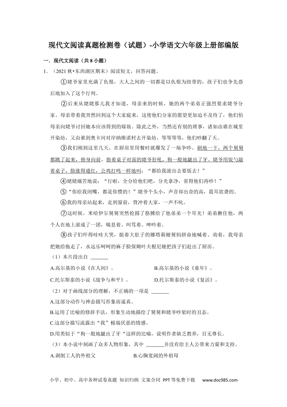 小学、初中、高中各种试卷真题知识归纳文案合同PPT等免费下载www.doc985.com现代文阅读真题检测卷(试题)-小学语文六年级上册部编版一.现代文阅读(共8小题)1.(2021秋•东西湖区期末)阅读短文,回答问题。ㅤㅤ①姥爷家里充满了仇恨,大人之间的一切都是以仇恨为纽带的,孩子们也争先恐后地加入了这个行列。ㅤㅤ②后来从姥姥那儿我才知道,母亲来的时候,她的两个弟弟正强烈要求姥爷分家。母亲带着我突然回到这个大家庭来,这使他们分家的愿望更加迫不及待了,他们怕母亲向姥爷讨回她本应该得到的嫁妆。除此之外,当然还有别的琐事,诸如由谁在城里开染坊,又由谁到奥卡河对岸纳维诺村去开染坊,等等等等,他们吵翻了天。ㅤㅤ③我们刚到这里几天,在厨房里用餐时就爆发了一场争吵。刷地一下,两个舅舅都跳了起来,俯身向前,指着桌子对面的姥爷狂吼,狗一般地龇出了牙。姥爷用饭勺敲着桌子,脸涨得通红,公鸡打鸣一样地叫:“都给我滚出去要饭去!”ㅤㅤ④姥姥痛苦地说:“行啦,全分给他们吧,分光拿净,省得他们再吵!”ㅤㅤ⑤“你给我闭嘴,都是你惯的!”姥爷个头小,声音却出奇的高,震耳欲聋的。ㅤㅤ⑥我的母亲站起来,走到窗前,背冲着大家,一声不吭。ㅤㅤ⑦这时候,米哈伊尔舅舅突然抡圆了胳膊给了他弟弟一个耳光!弟弟揪住他,两个人在地上滚成了一团,喘息着、叫骂着、呻吟着。ㅤㅤ⑧孩子们吓得哇哇大哭,挺着大肚子的娜塔莉娅舅妈拼命地喊着、劝着,我母亲把她给拖走了,永远乐呵呵的麻子脸保姆叶夫根尼娅把孩子们赶出了厨房。(1)本片段出自A.高尔基的小说《在人间》。B.高尔基的小说《童年》。C.托尔斯泰的小说《战争与和平》。D.托尔斯泰的小说《复活》。(2)对于画线部分的理解,不正确的一项是A.这部分动作与神态描写形象而逼真。B.运用了比喻的修辞手法,形象生动地描绘了舅舅和姥爷吵架时的丑态。C.这部分描写流露出“我”极端厌恶的情感。D.用类似于“狗一般地龇出了牙“这样的比喻,说明作者缺乏教养,目无尊长。(3)本小说中刻画了众多人物形象,其中并没有给主人公带来力量和支持。A.剥削工人的外祖父B.心胸宽阔的外祖母小学、初中、高中各种试卷真题知识归纳文案合同PPT等免费下载www.doc985.comC.献身于科学的“好事情”D.乐观、纯朴、正直的老工人2.(2021秋•平阳县期末)阅读。维也纳的森林故事(节选)冯骥才①世人只知道这片森林受益于施特劳斯的名曲《维也纳森林的故事》而名扬天下,引来千千万万旅游者,为这座城市赢得外汇。▲哪里知道维也纳人与这片森林互惠互助,相依相存,因而才给了那位“圆舞曲之王”以创作的灵感、冲动和深情。②一出城市,到处是这样的景象:向阳的山坡上,林色鲜翠;背阳的山坡上,森森然像一片埋伏在那里披甲戴盔的兵阵。森林之间是大片大片的开满鲜花的牧草,很难看见土的颜色。维也纳森林是指维也纳城市近郊一带,地势最高不过海拔四百米,很少针叶树,多为阔叶林,榆槐桉桐等数十种树木,交相混杂,每逢春至,树上开花,小鸟欢叫,各种野生小动物奔跃其间。这感觉与南部蒂罗尔州那种高山峻岭,松柏参天,雪溪喷泻,全然两样。这里的森林清新柔和,温文尔雅,倒与维也纳这个城市的味道更相调和。③森林不单使人赏心悦目,还神奇地调节着气温。在维也纳,无论太阳怎样灼热,只要钻到树荫里便立刻清爽宜人。这感觉异常分明。“太阳地”和“荫凉地”,好似两个季节;中午与早晚,温差非常分明。即使炎夏时节,日落之后,空气会很快凉爽下来,维也纳人在夏天夜里也要盖被子睡觉,特别是一场雨后,天气如秋;气候多变,穿衣常跟不上变化。有时风起雨过,那些等候公共汽车的人群,可谓千奇百怪。有的依然穿背心光膀子,有的已经穿上毛衣和皮夹克。此种奇观,很像中国北方的“二八月乱穿衣”,但这里却是“五六月乱穿衣”了。④维也纳人明白,宜人的气候不只是上帝的恩赐,更由于祖祖辈辈对这种恩赐倍加珍爱。早在1852年奥地利就颁布了《森林法》,一百余年,沿用至今。这实际上就是严格的森林保护法,科学性与应用性结合得很完美。比如采伐,伐掉的那一片林木的空地,正是需要阳光射入,促使森林更好生长之处。所...