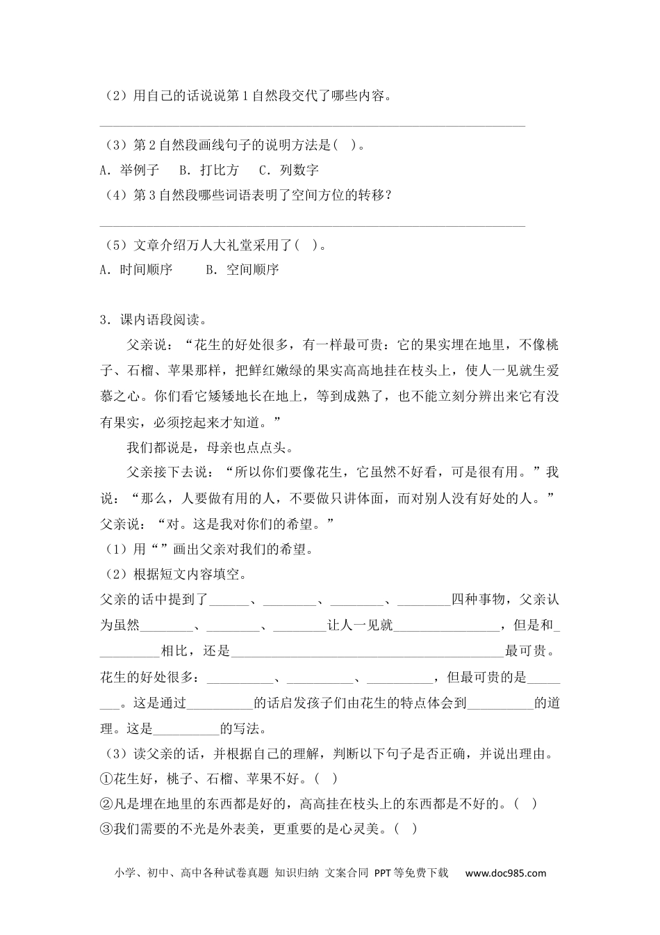 小学、初中、高中各种试卷真题知识归纳文案合同PPT等免费下载www.doc985.com小升初语文专项训练状物类文章的阅读基础篇一、现代文阅读1.阅读理解。圆明园在北京西北郊,是一座举世闻名的皇(wánghuáng)家园林。它由圆明园、万春园和长春园组成,所以也叫圆明三园。此外,还有许多小园,分布在圆明园东、西、南三面,众星拱月般环绕在圆明园周围。圆明园中,有金碧辉煌的殿堂,也有玲(línlíng)珑剔透的亭台楼阁;有象征着热闹街市的“买卖街”,也有象征着田园风光的山乡村野。园中许多景物都是仿照各地名胜建造的,如,海宁的安澜园,苏州的狮子林,杭州西湖的平湖秋月、雷峰夕照;还有很多景物是根据古代诗人的诗情画意建造的,如,蓬(péngféng)莱瑶台,武陵春色。园中不仅有民族建筑,还有西洋景观。漫步园内,有如漫游在天南海北,饱览着中外风景名胜;流连其间,仿佛(fúfó)置身在幻想的境界里。(1)选择文中括号内正确的读音,画“√”。(2)写出下列词语的近义词。景观()仿照()仿佛()饱览()(3)课文是从_________、_________和_________三个方面来描写圆明园的,其中第_________个方面写得最详细。(4)圆明园在园林建筑上有三个主要特点:①____________________________________________②_____________________________________________③_____________________________________________(5)为什么圆明园被誉为“万园之园”?________________________________________________________________(6)作者为什么要用大量的篇幅介绍圆明园辉煌的过去?________________________________________________________________小学、初中、高中各种试卷真题知识归纳文案合同PPT等免费下载www.doc985.com(7)联系上下文,说说从加横线的词语中体会到了什么。他们把园内凡是能拿走的东西,统统掠走;拿不动的,就用大车或牲口搬运;实在运不走的,就任意破坏、毁掉。________________________________________________________________2.课外类文阅读。在天安门右前方,巍然(耸屹)立着一座雄伟壮丽的大厦,这就是人民大会堂。全国各族人民的代表在这里共商国策。庄严的人民大会堂,是首都最宏伟的建筑之一,建筑面积达171800平方米,体积有1596900立方米。一条黄绿相间的琉璃屋檐,把巍峨的大会堂的轮廓从(蔚尉)蓝的天空中勾画出来。那壮丽的柱廊,淡雅的色调,以及四周层次繁多的建筑立面,组成了一(幅副)庄严绚丽的画图。迈进金黄色大铜门,穿过宽阔的风门厅和衣帽厅,就到了大会堂建筑的枢(钮纽)部分——中央大厅。建筑师站在这里,指着四周向我们介绍了整个建筑的布局:朝西直入万人大礼堂;往北通宴会厅;向南穿过长长的廊道,是全国人民代表大会常务委员会的办公大楼。整个建筑就是由这三部分组成的。万人大礼堂,里面宽76米,深60米,中部高33米,体积达86000立方米,像一座大厦。但是由于设计师们处理得巧妙,走进大礼堂的人,放眼一望,从屋顶到地面,上下(浊浑)然一体,并不感到怎样空旷。屋顶是穹隆形的,天花板上纵横密排着近500个灯孔。灯光齐明的时候,就像满天星斗。顶部的中心挂着红宝石般的五星灯,灯的周围是70条瑰丽的光芒线和40瓣镏(liú)金的向日葵花瓣,象征着全国各族人民万众一心,紧密团结在中国共产党的周围。在它的外围,有三环层次分明的水波形暗灯槽,同周围装贴的淡青色塑料板相映,形成“水天一色”的奇观。大礼堂呈椭圆形,有两层挑台像两弯新月,围拱着主席台,使大礼堂成为层次分明、错落有(至致)的整体。两层挑台连地面共3层座席,有9600多个席位。礼堂的主席台像个小会场,能容纳300多人。(1)在文中括号内选择合适的字。小学、初中、高中各种试卷真题知识归纳文案合同PPT等免费下载www.doc985.com(2)用自己的话说说第1自然段交代了哪些内容。________________________________________________________________(3)第2自然段画线句子的说明方法是()。A.举例子B.打比方C.列数字(4)第3自然段哪些词语表明了空间方位的转移?________________________________________________________________(5)文章介绍万人大礼堂采用了...